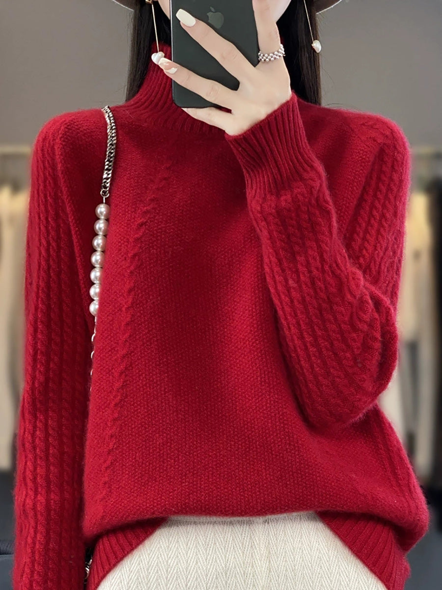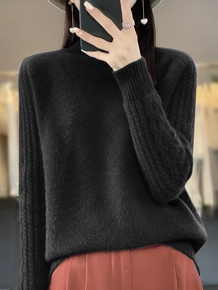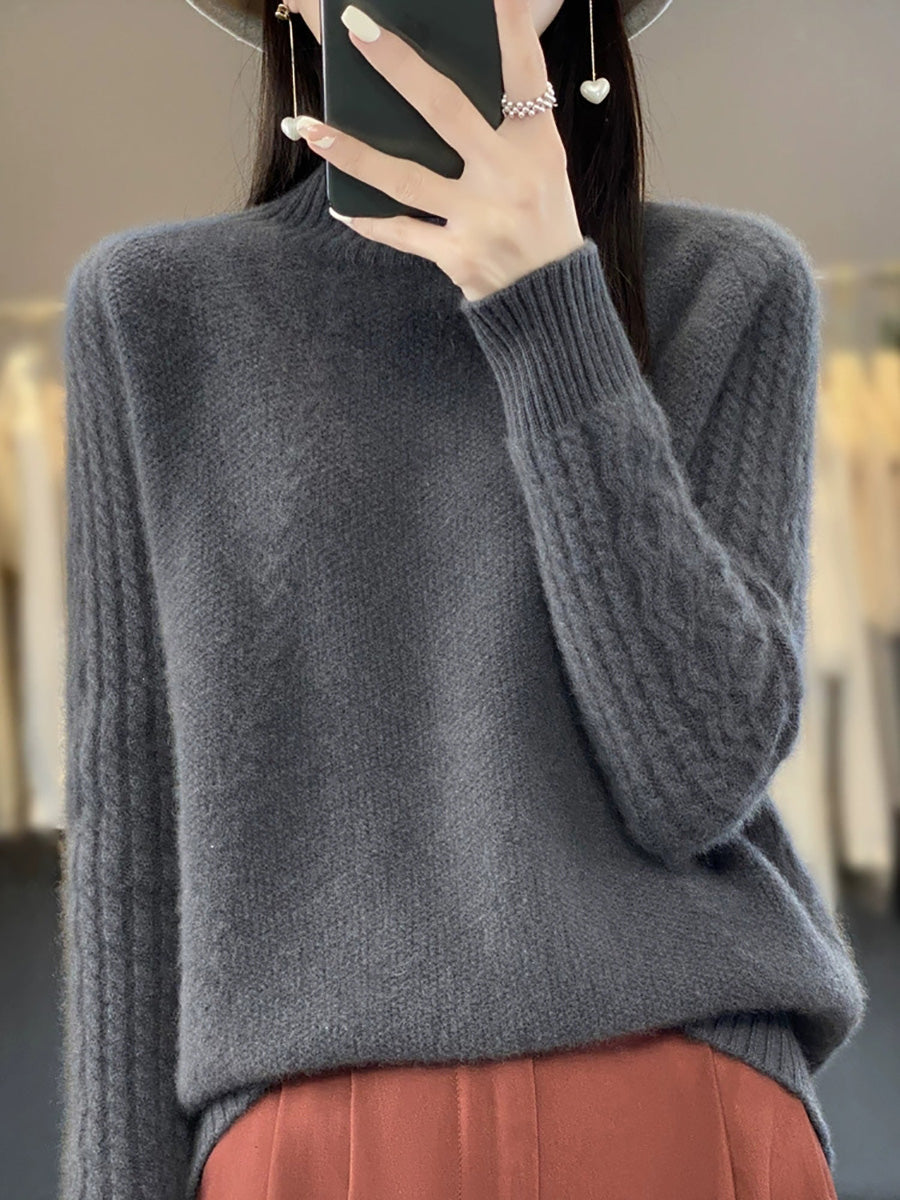 كنزة نسائية خريفية فنية من الصوف بلون موحد بياقة نصف مدورة