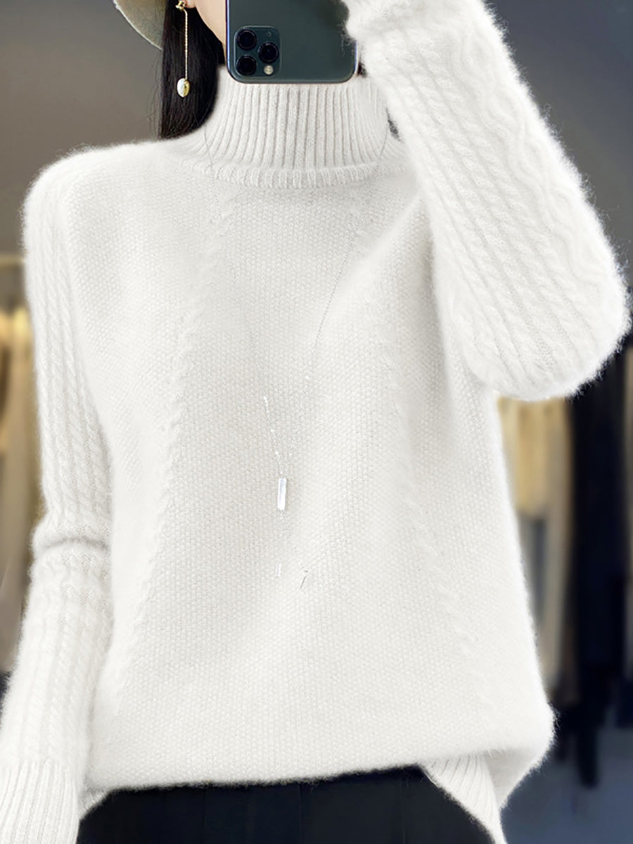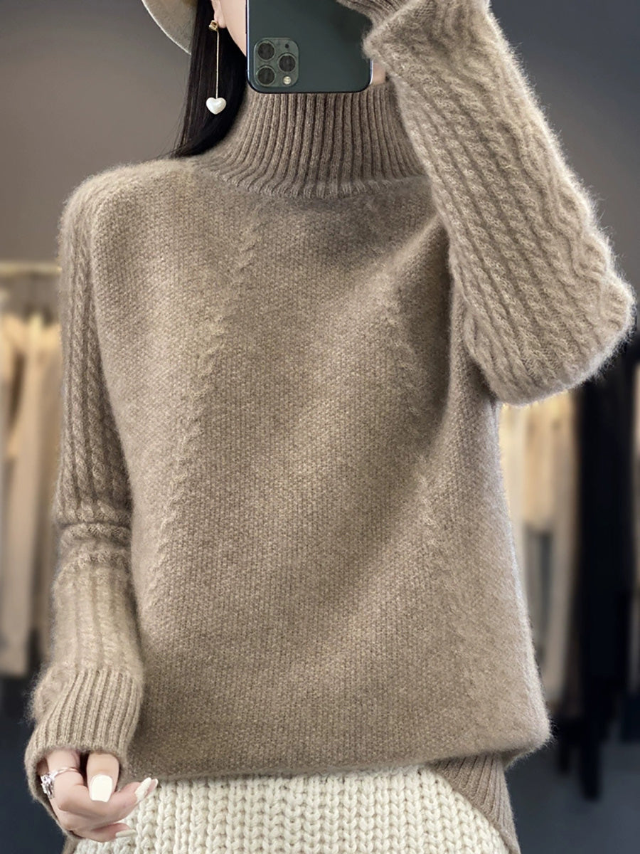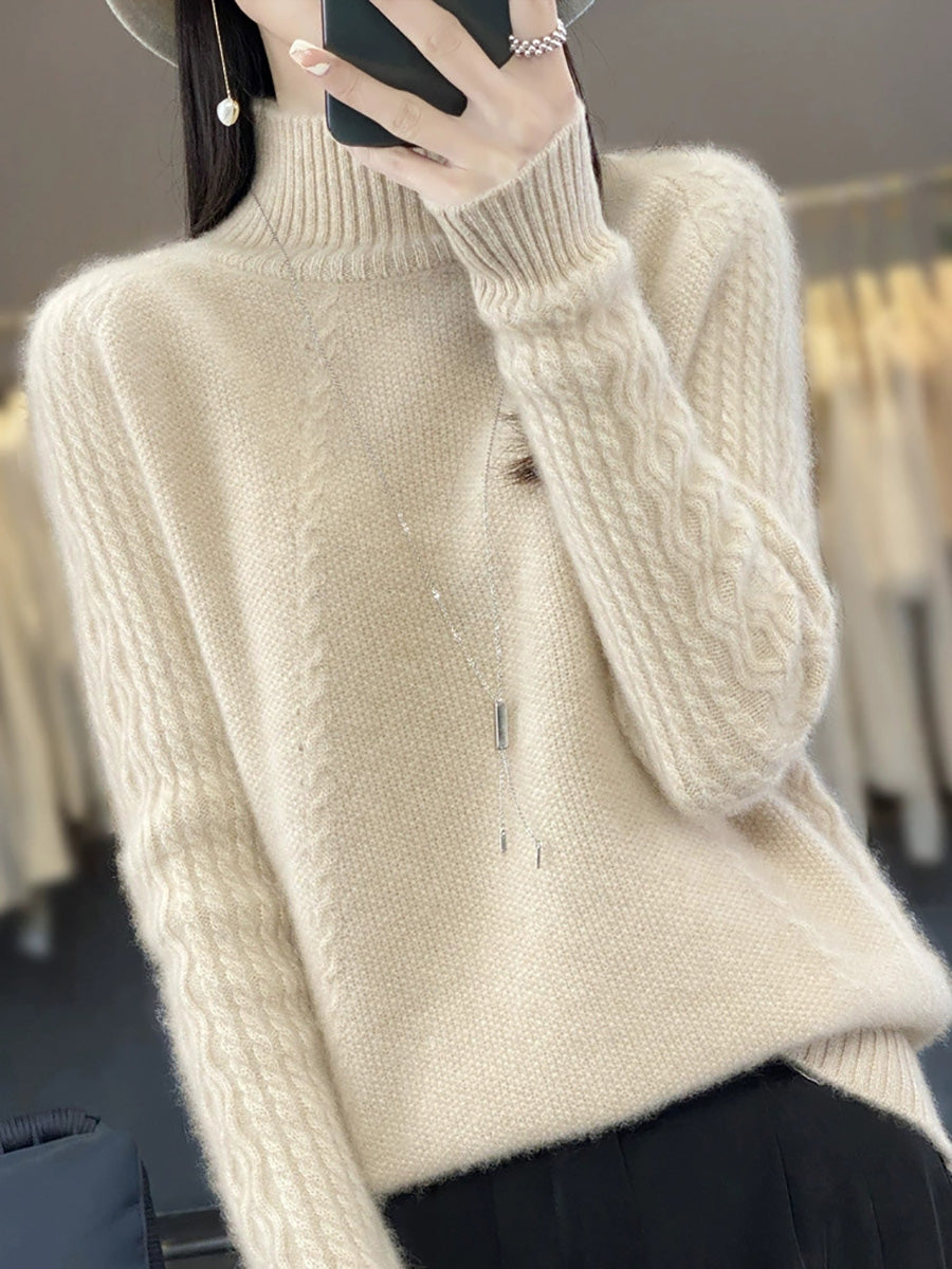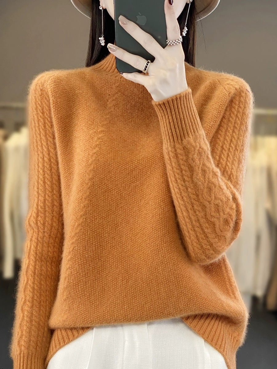 كنزة نسائية خريفية فنية من الصوف بلون موحد بياقة نصف مدورة