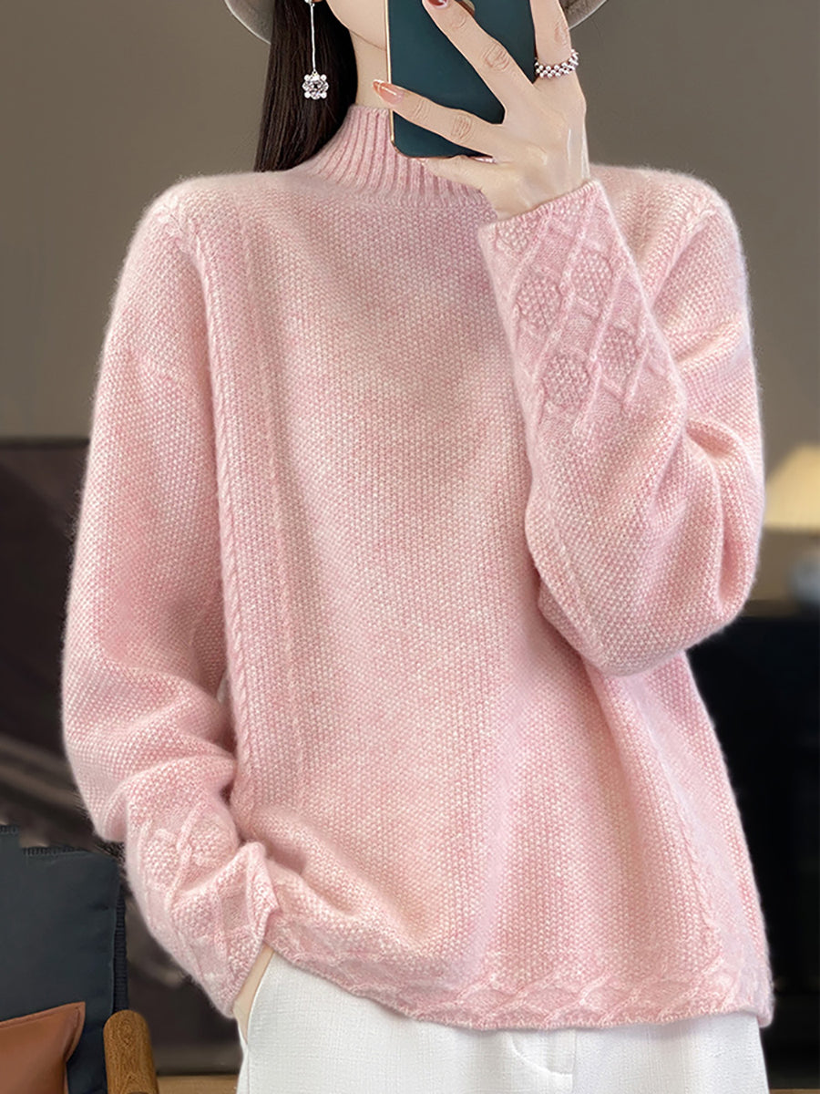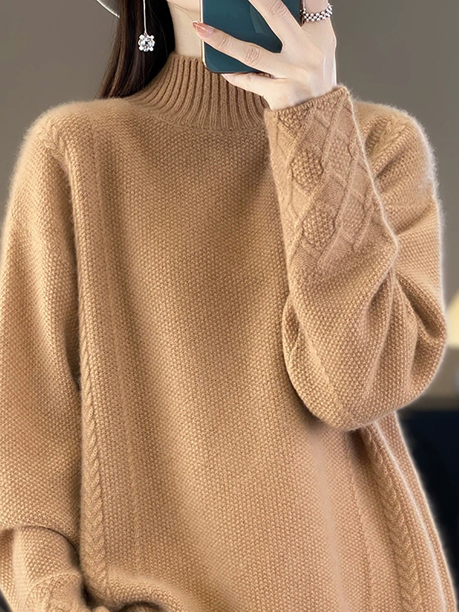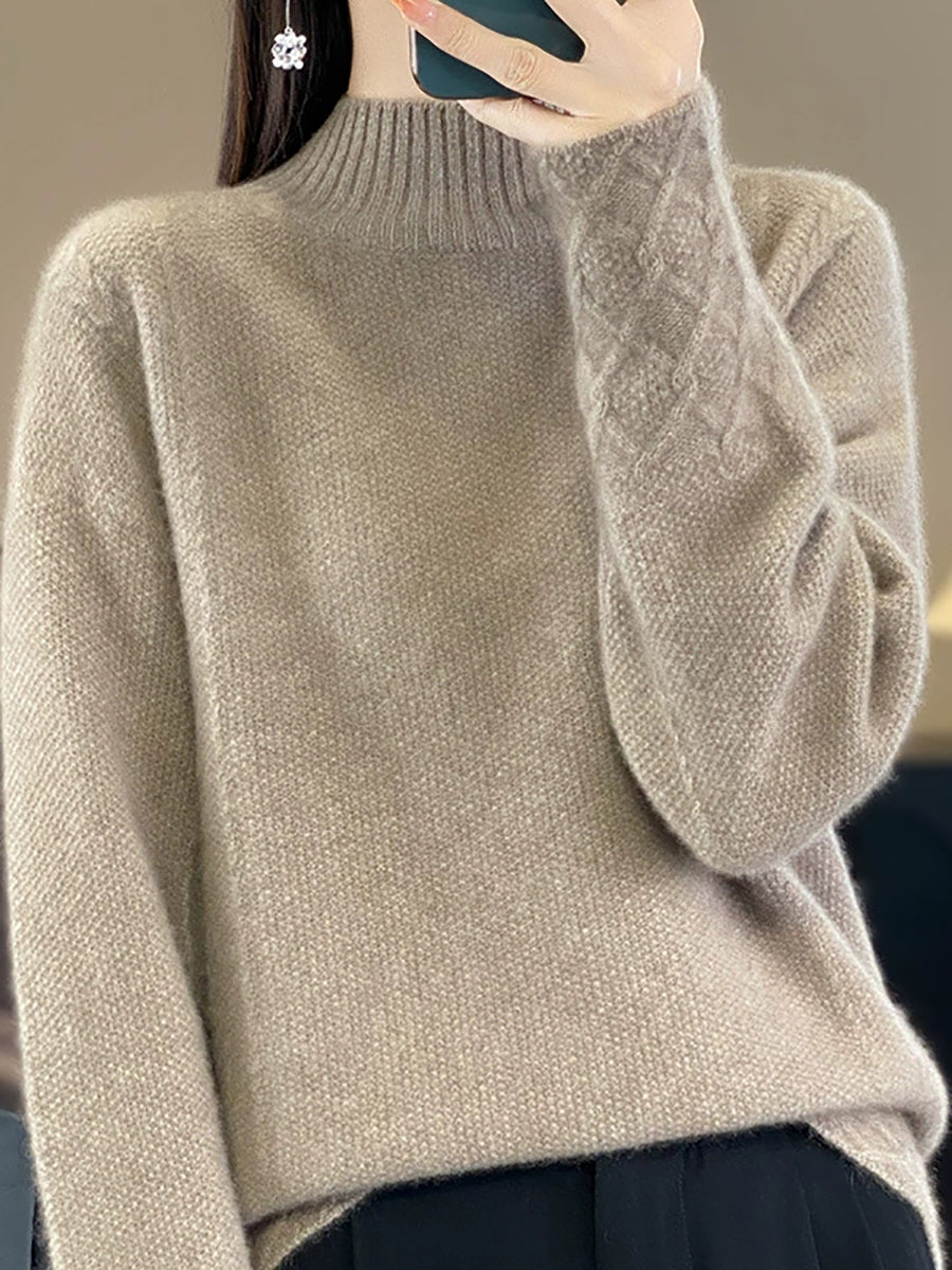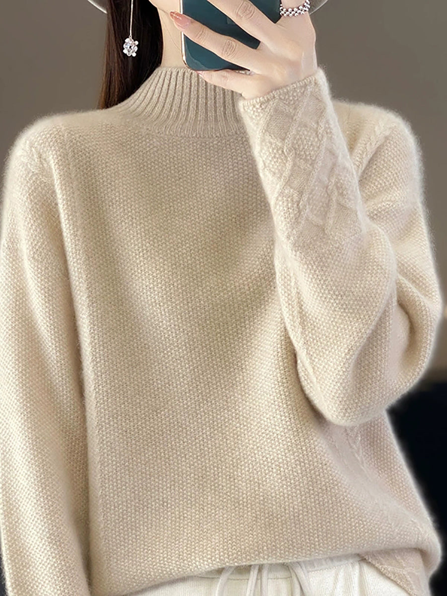 كنزة نسائية خريفية فنية من الصوف بلون موحد بياقة نصف مدورة