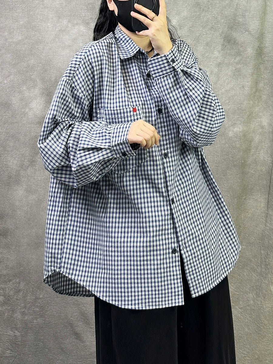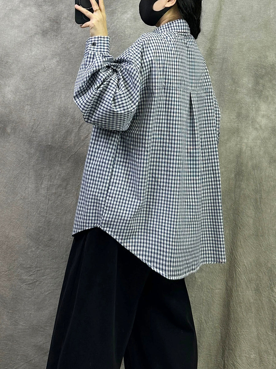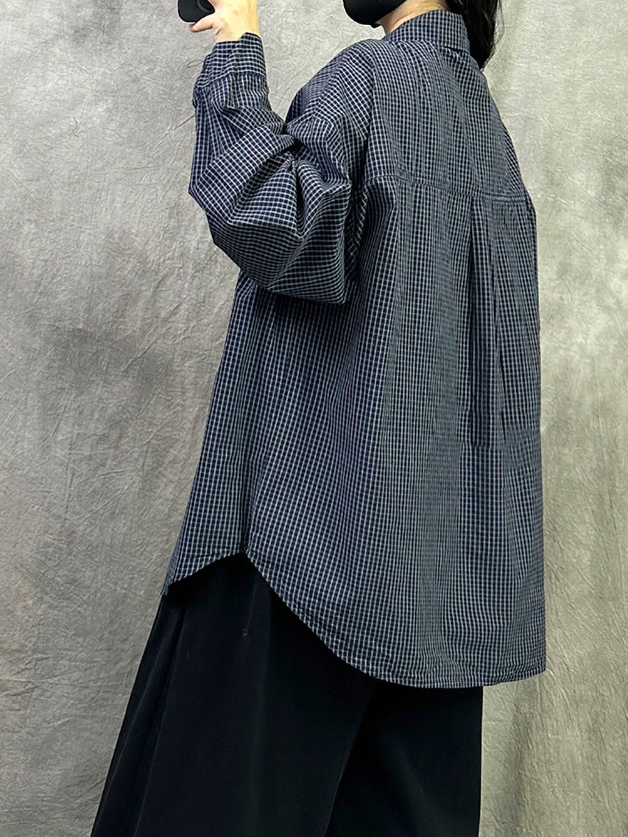 قميص قطني نسائي أنيق بنمط شبكي ربيعي وياقة مطوية