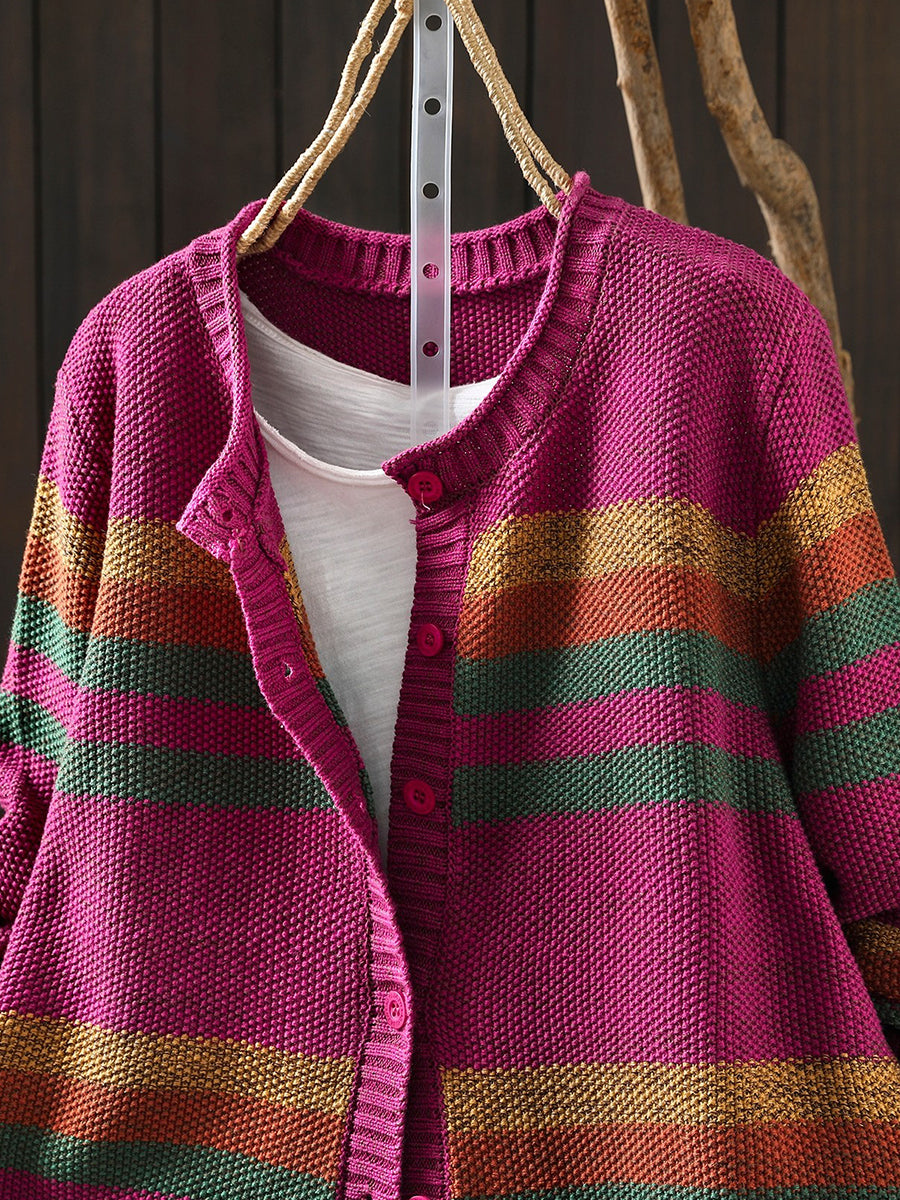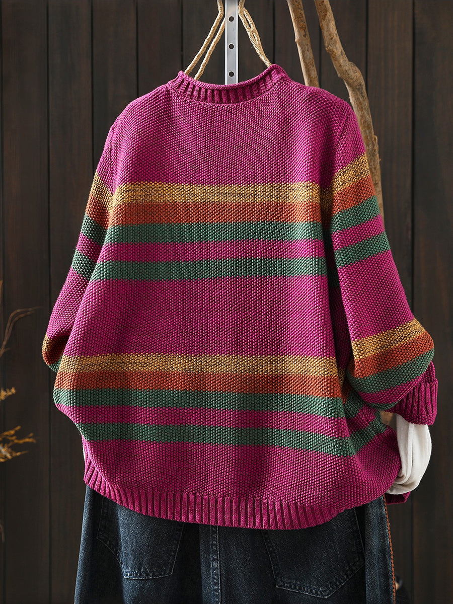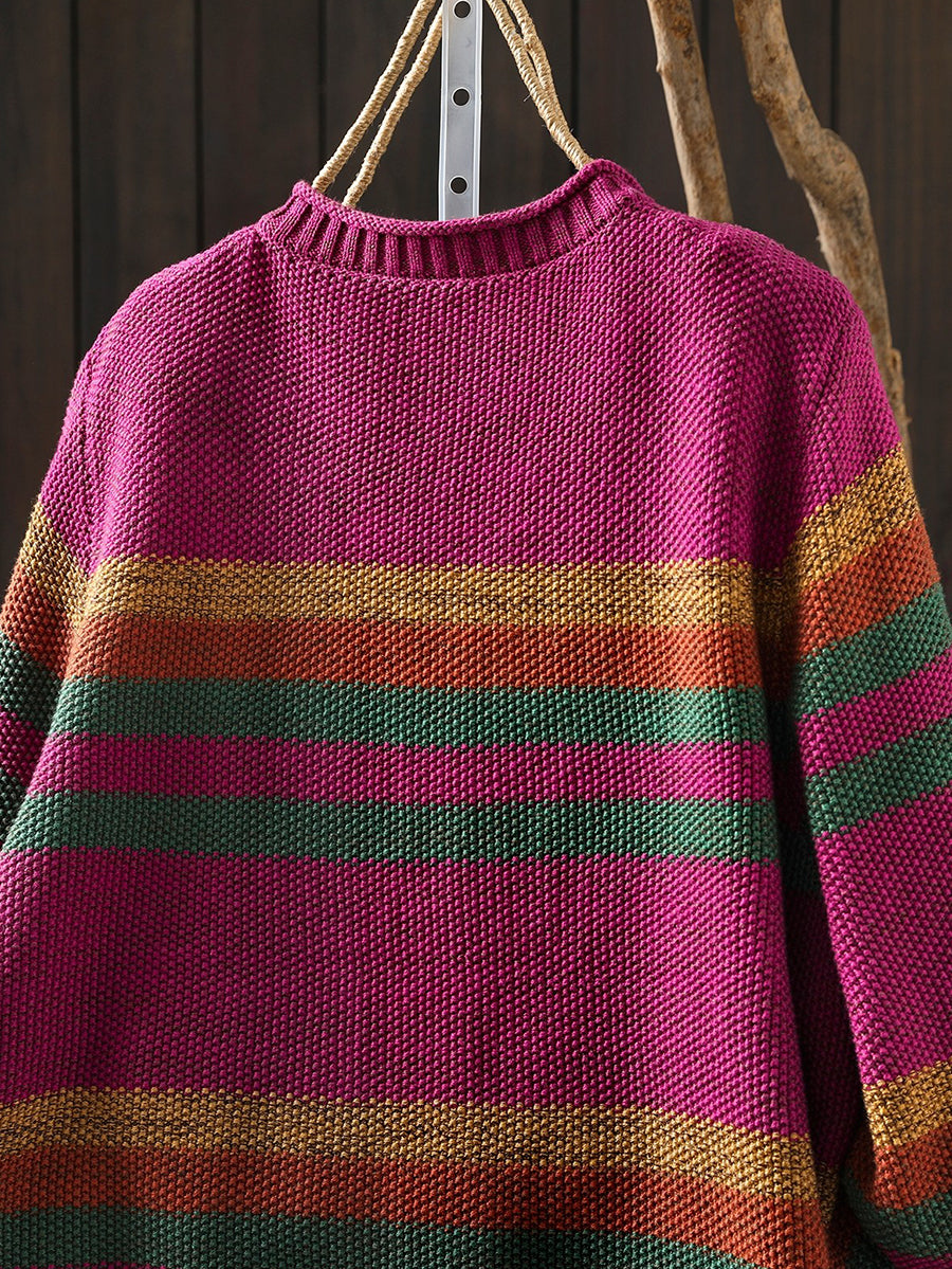 كنزة نسائية ربيعية فنية مخططة بألوان متداخلة وياقة دائرية