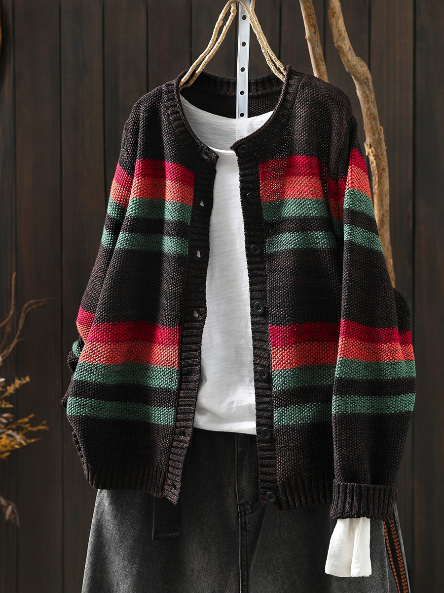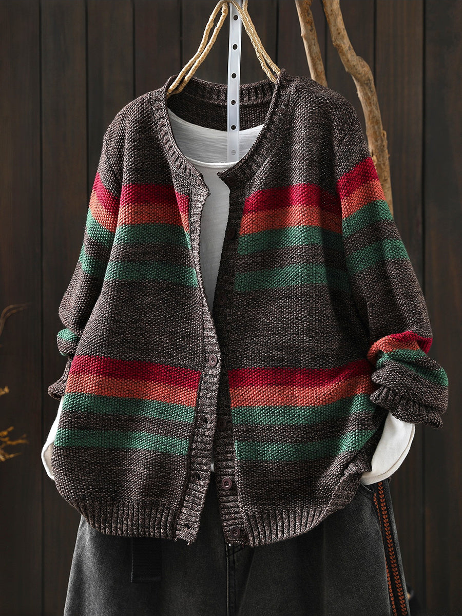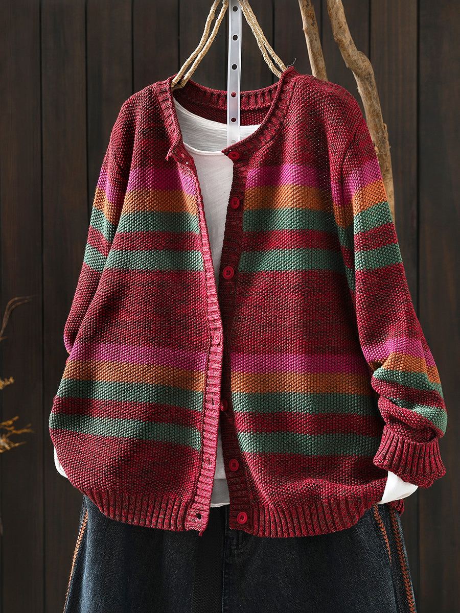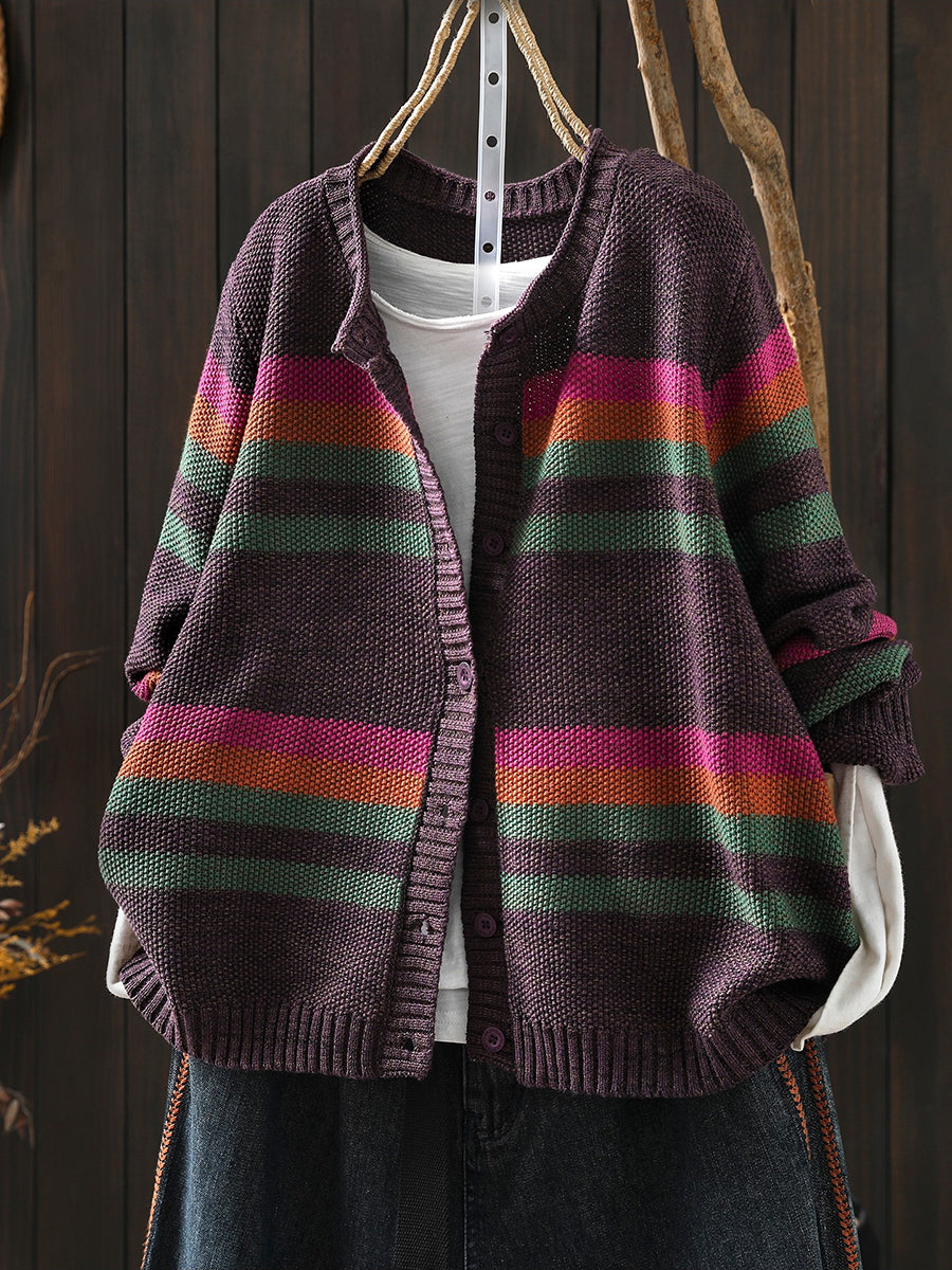 كنزة نسائية ربيعية فنية مخططة بألوان متداخلة وياقة دائرية