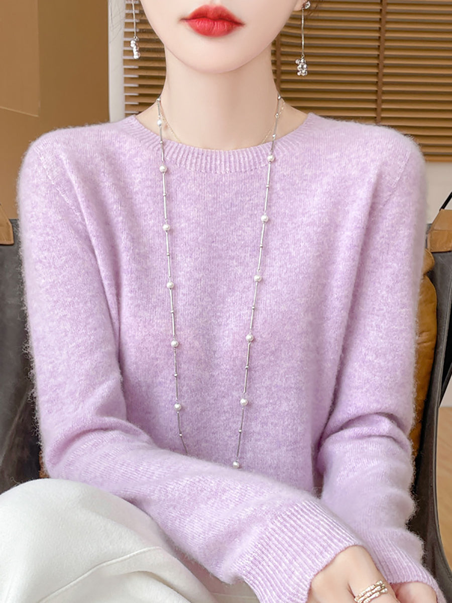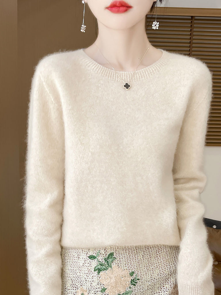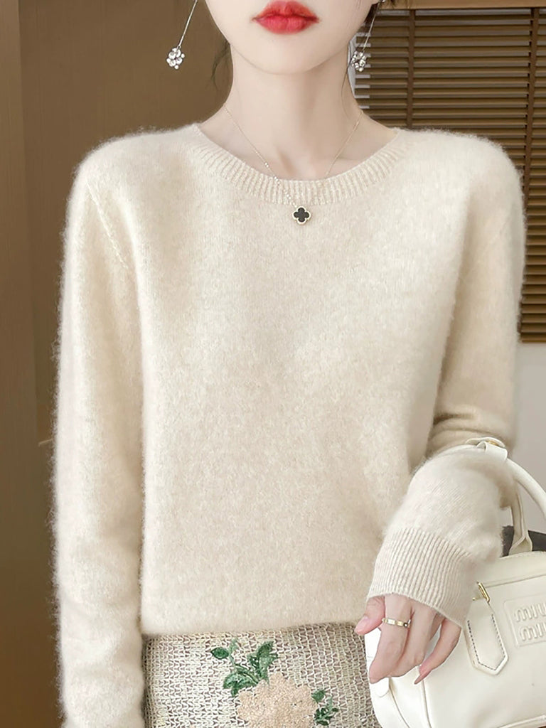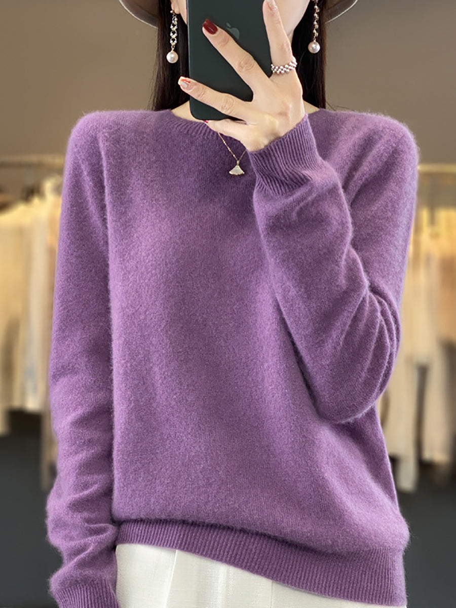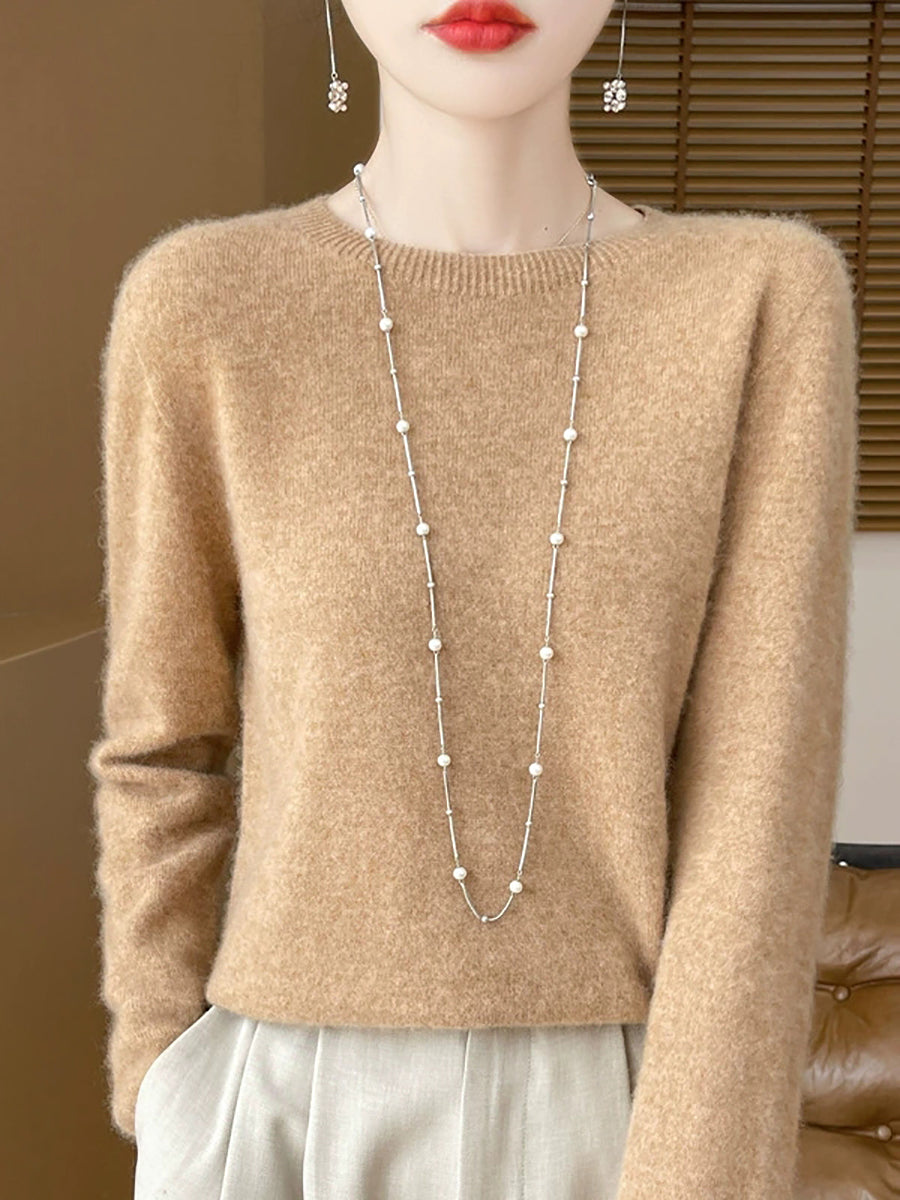 سترة صوفية شتوية نسائية بلون نقي برقبة دائرية