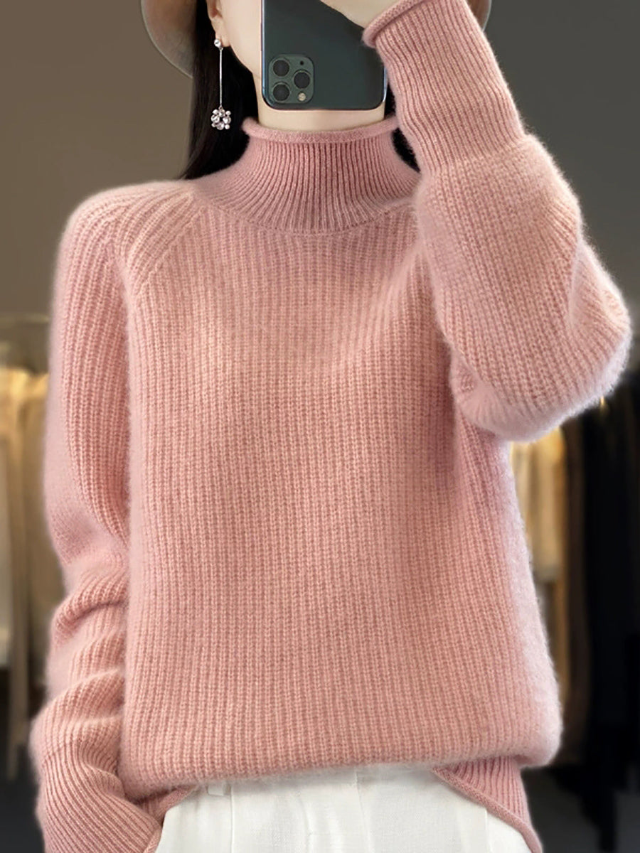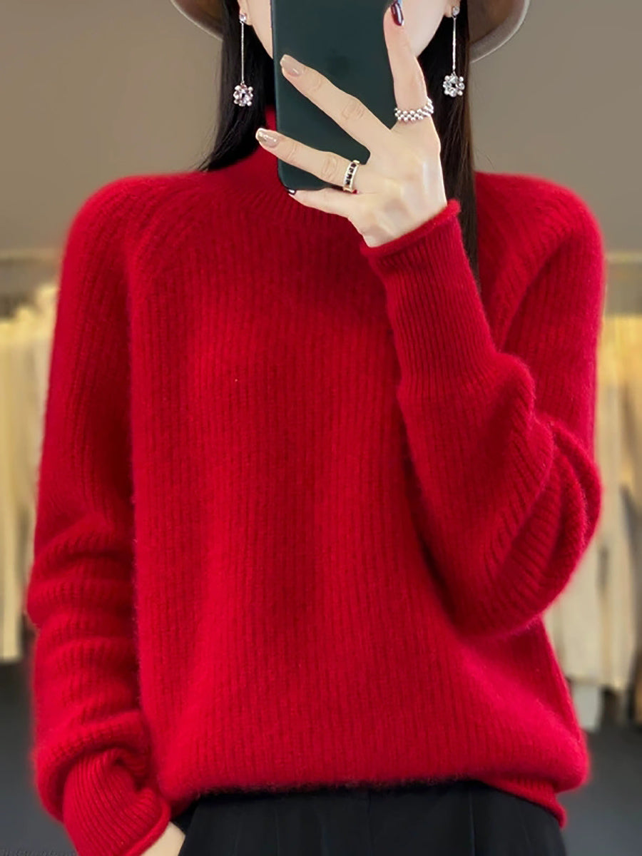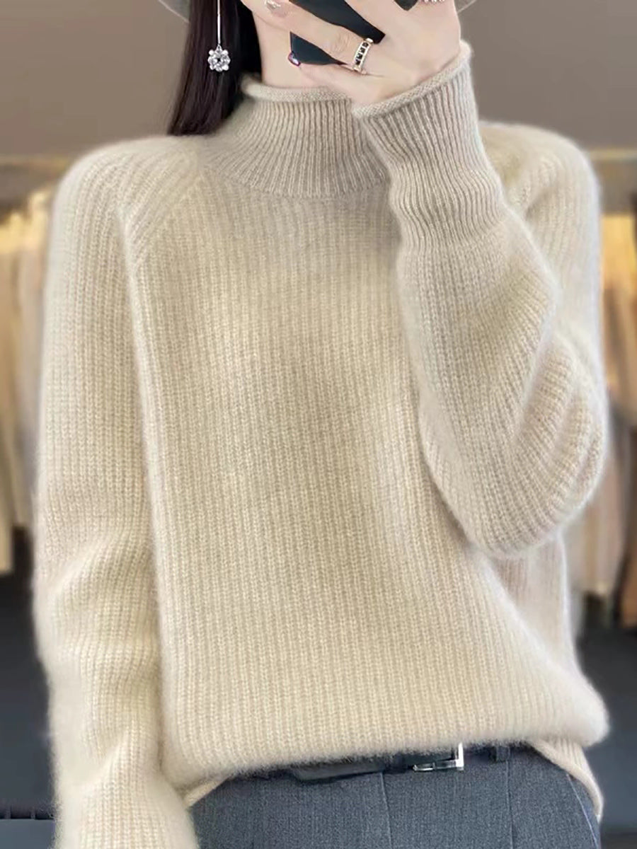 سترة نسائية شتوية من الصوف ذات الياقة المدورة بلون نقي