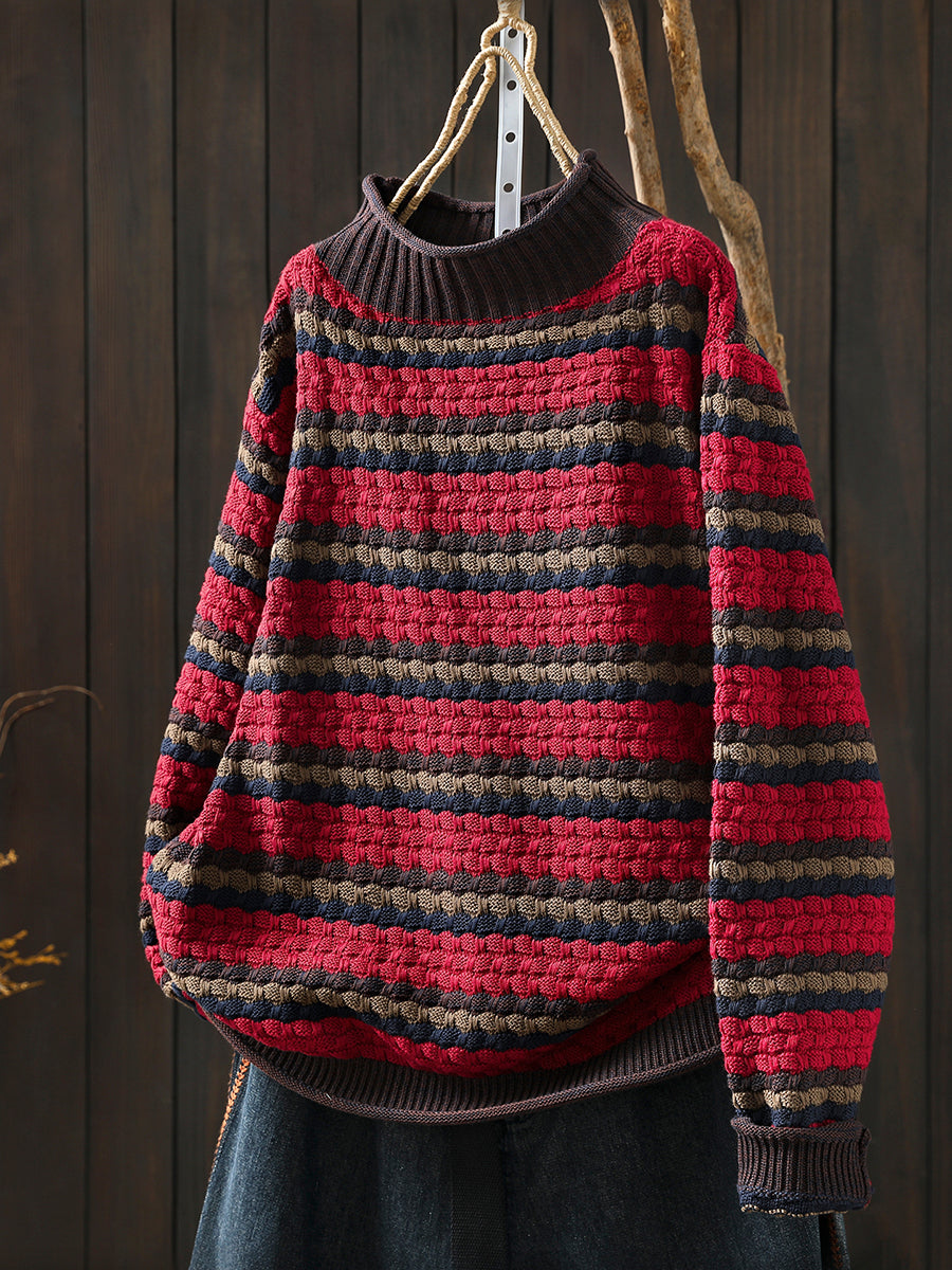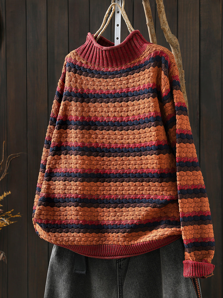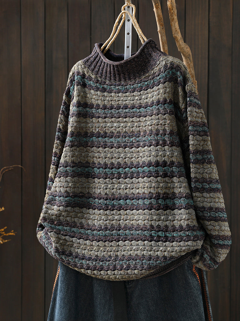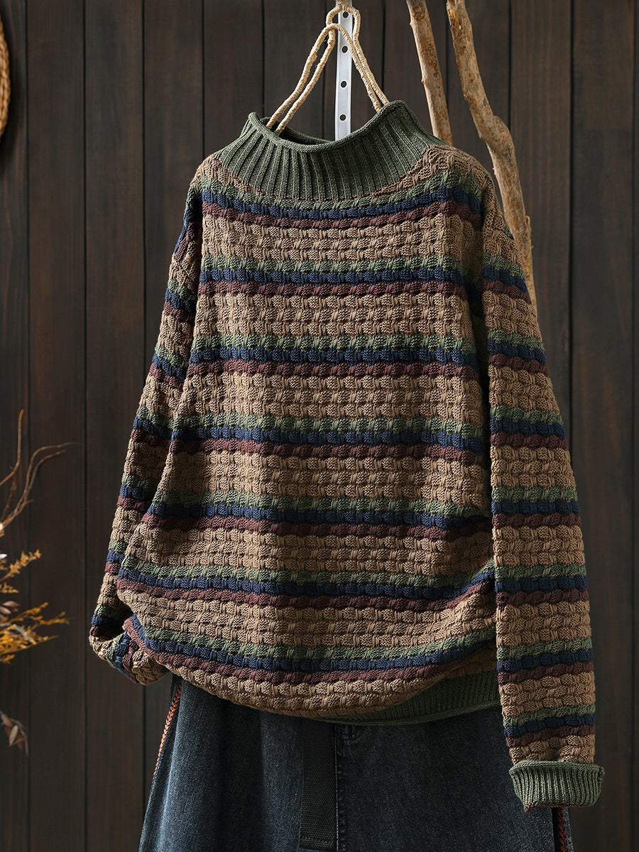 سترة نسائية مخططة بألوان متعددة، بياقة مدورة ونقشة فنية خريفية