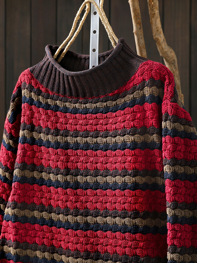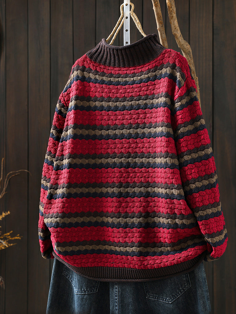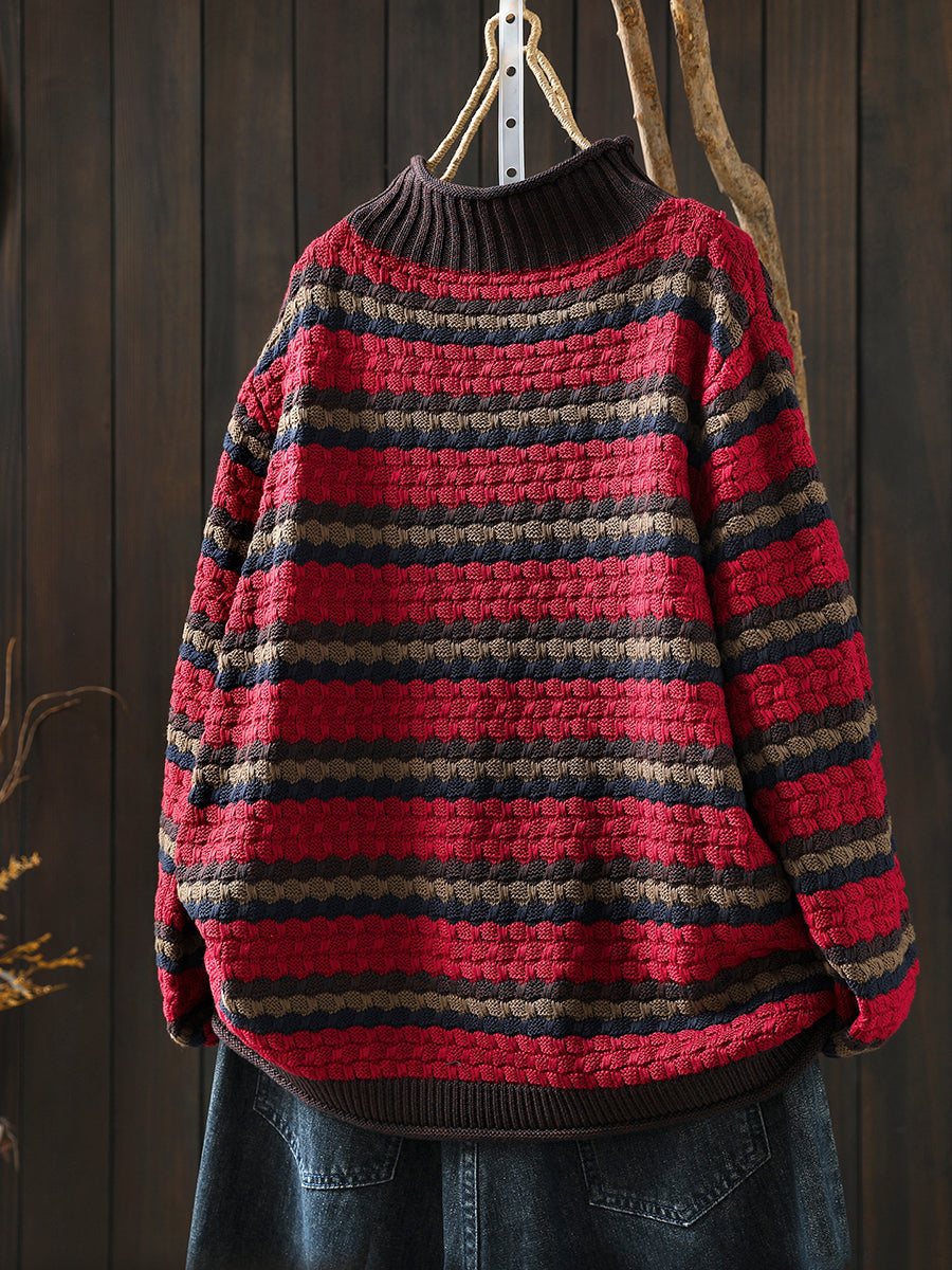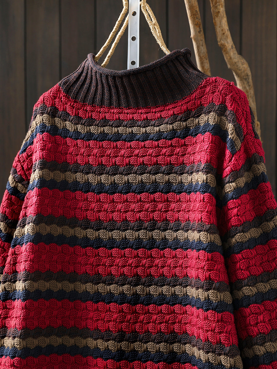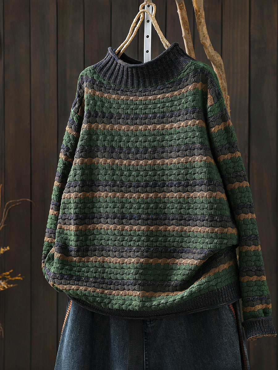 سترة نسائية مخططة بألوان متعددة، بياقة مدورة ونقشة فنية خريفية