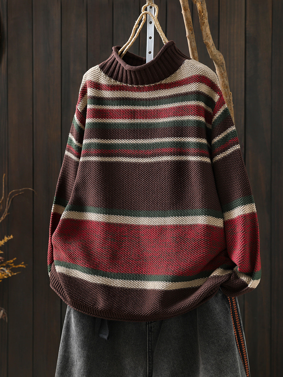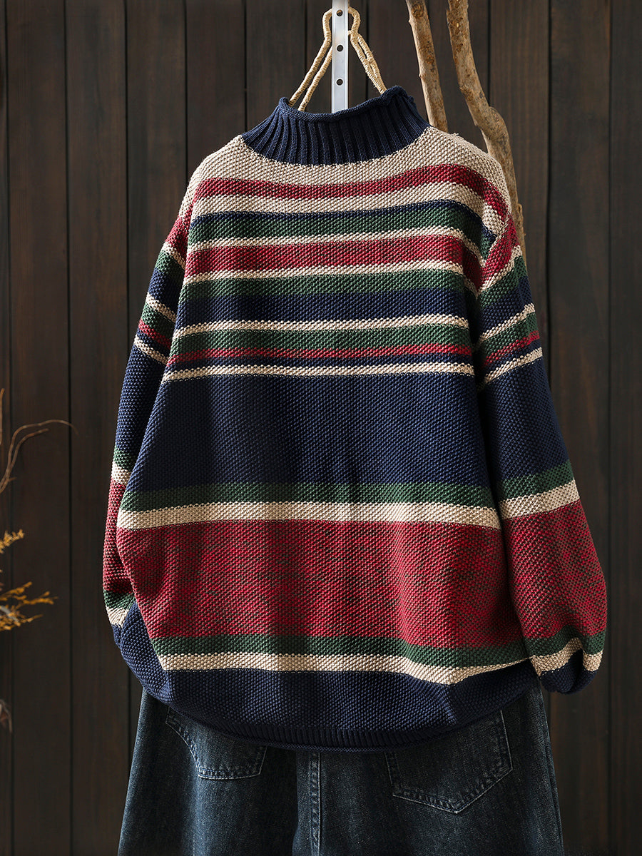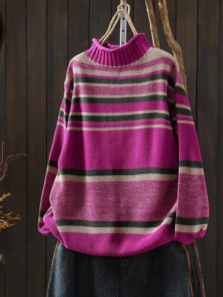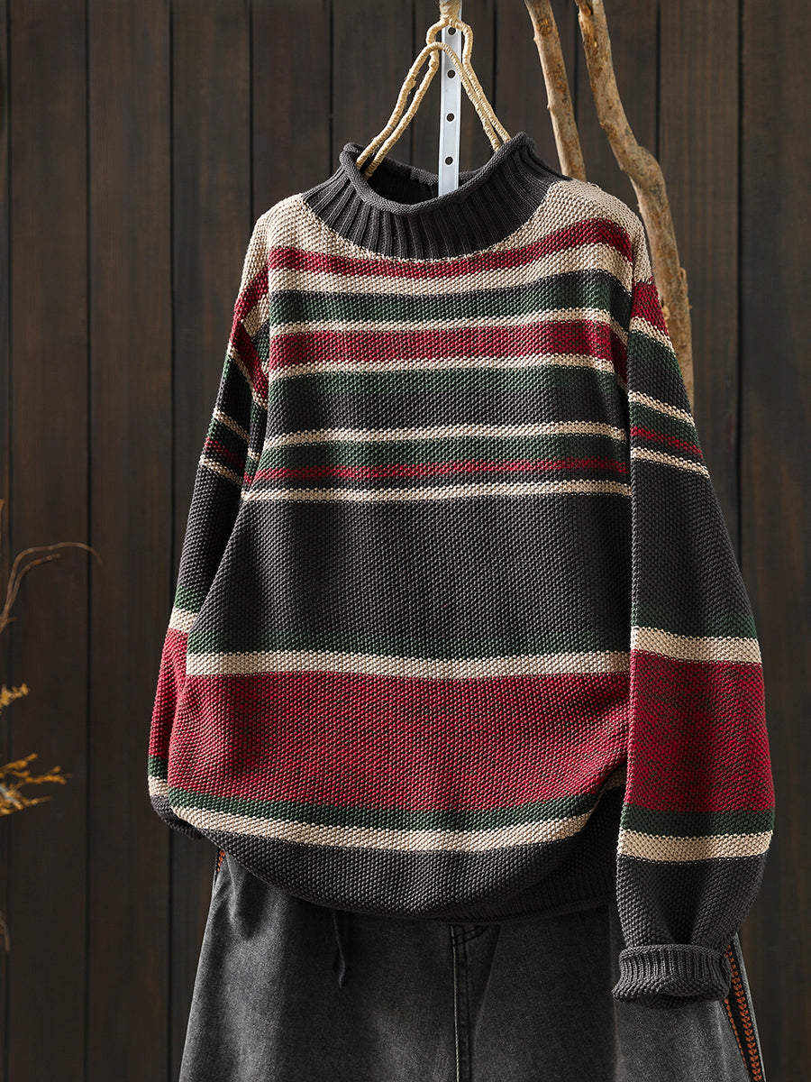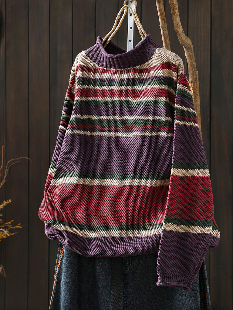 سترة نسائية مخططة بألوان متعددة، بياقة مدورة ونقشة فنية خريفية