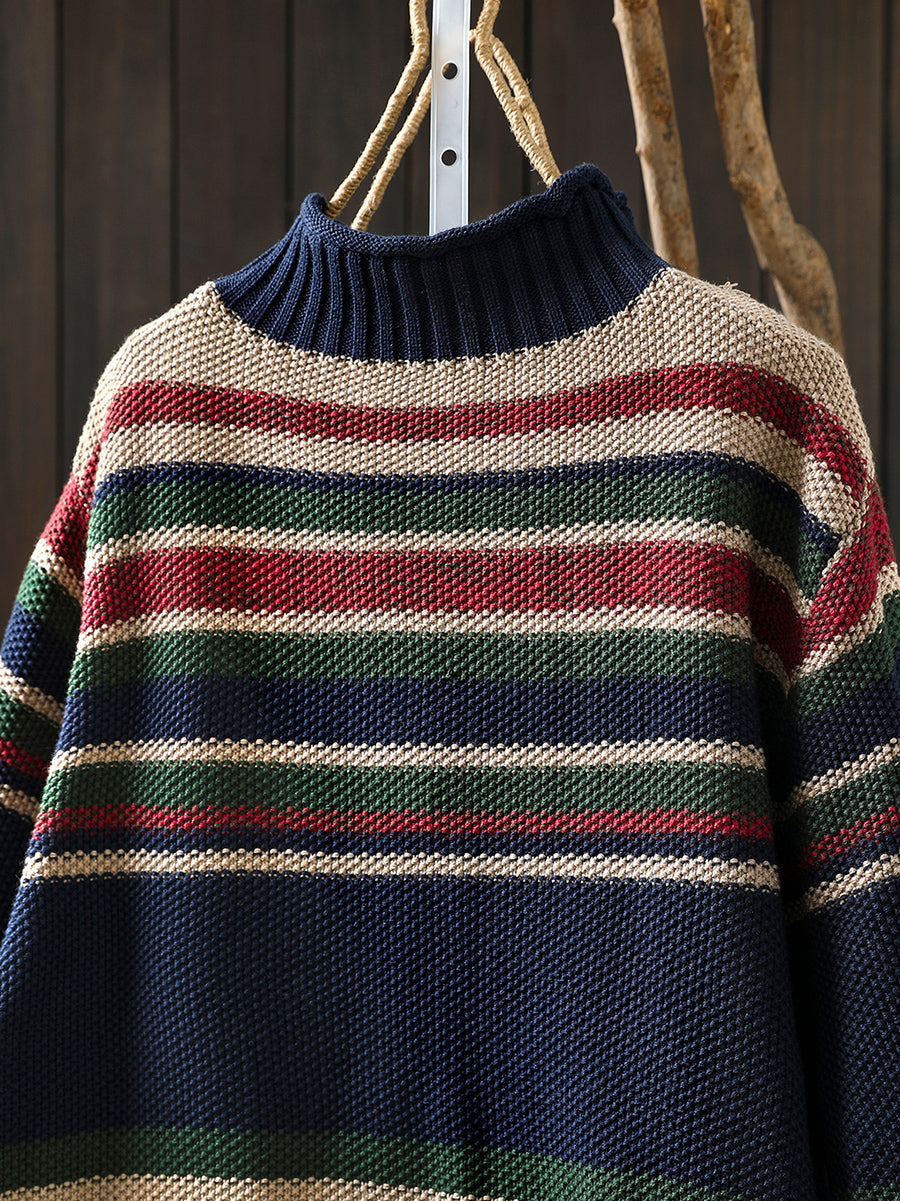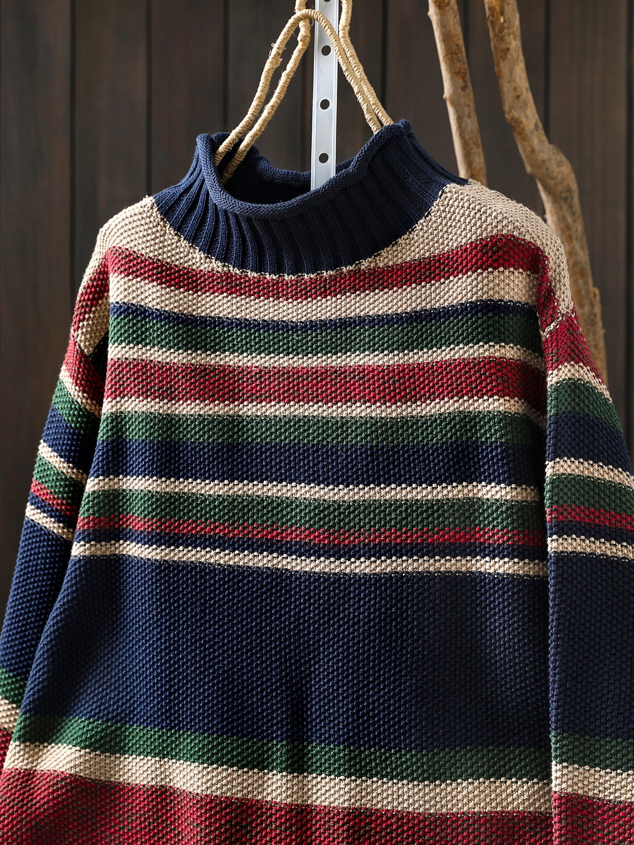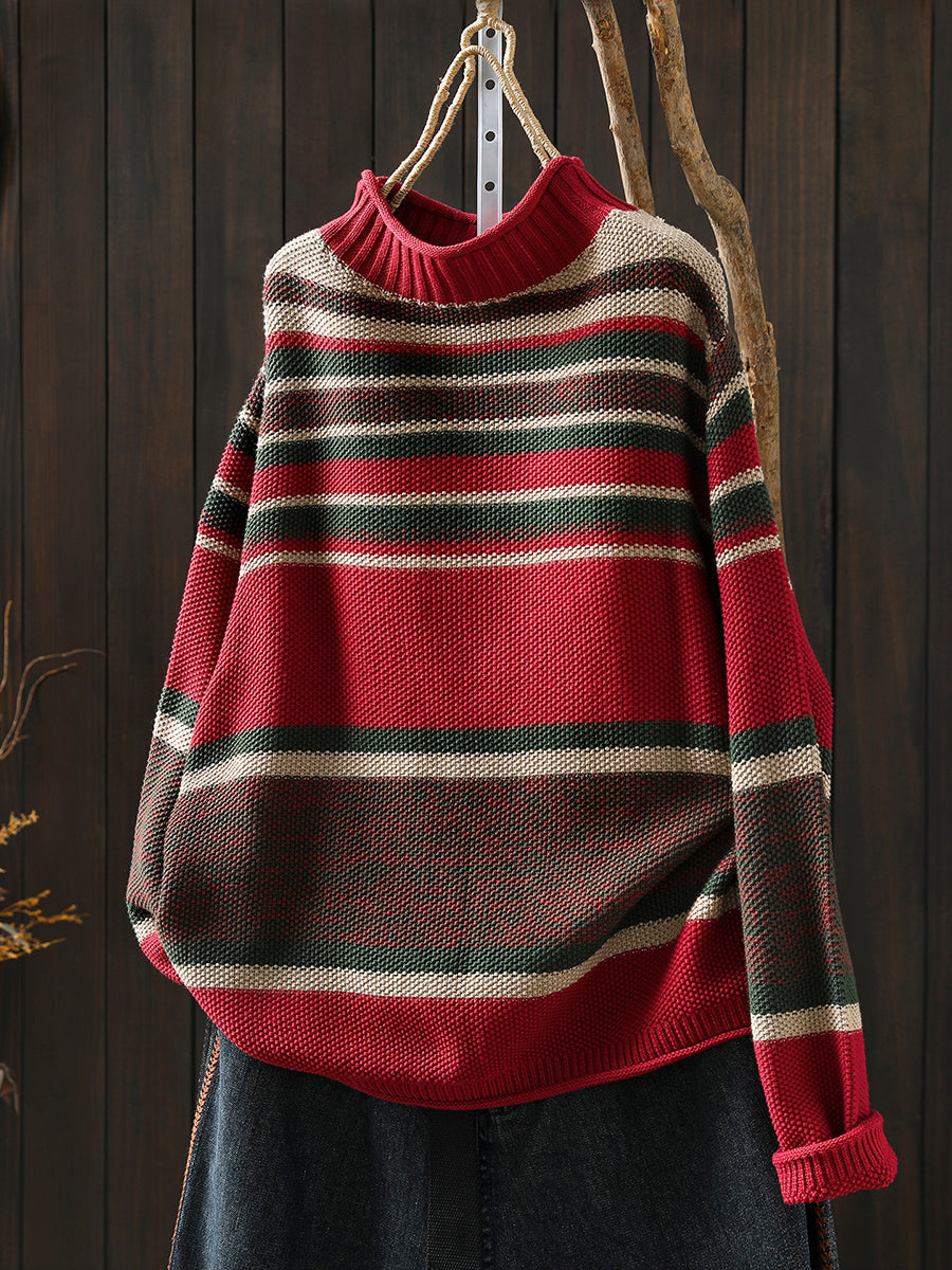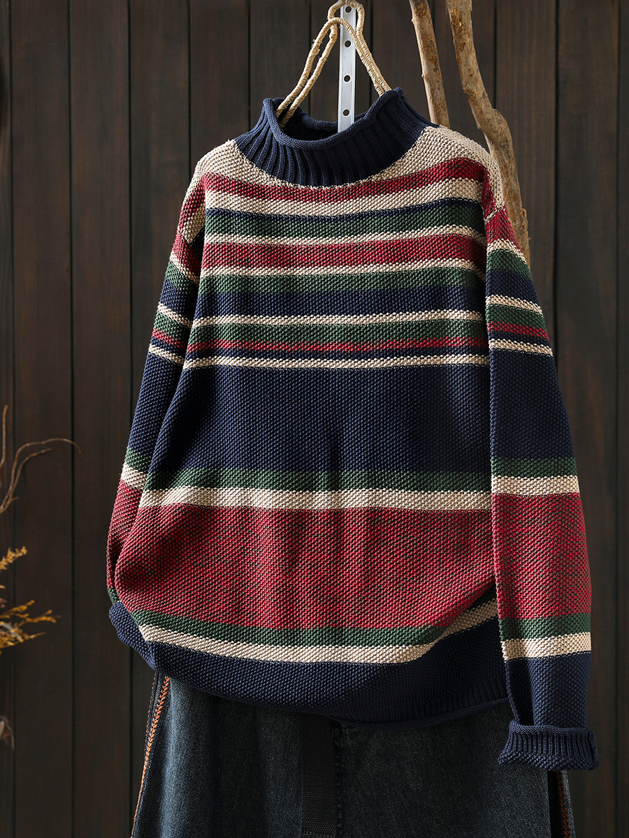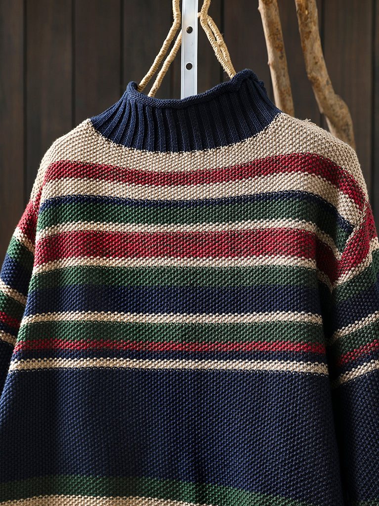 سترة نسائية مخططة بألوان متعددة، بياقة مدورة ونقشة فنية خريفية
