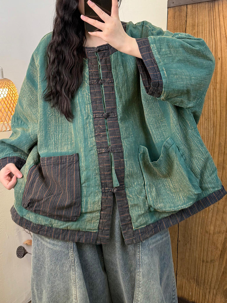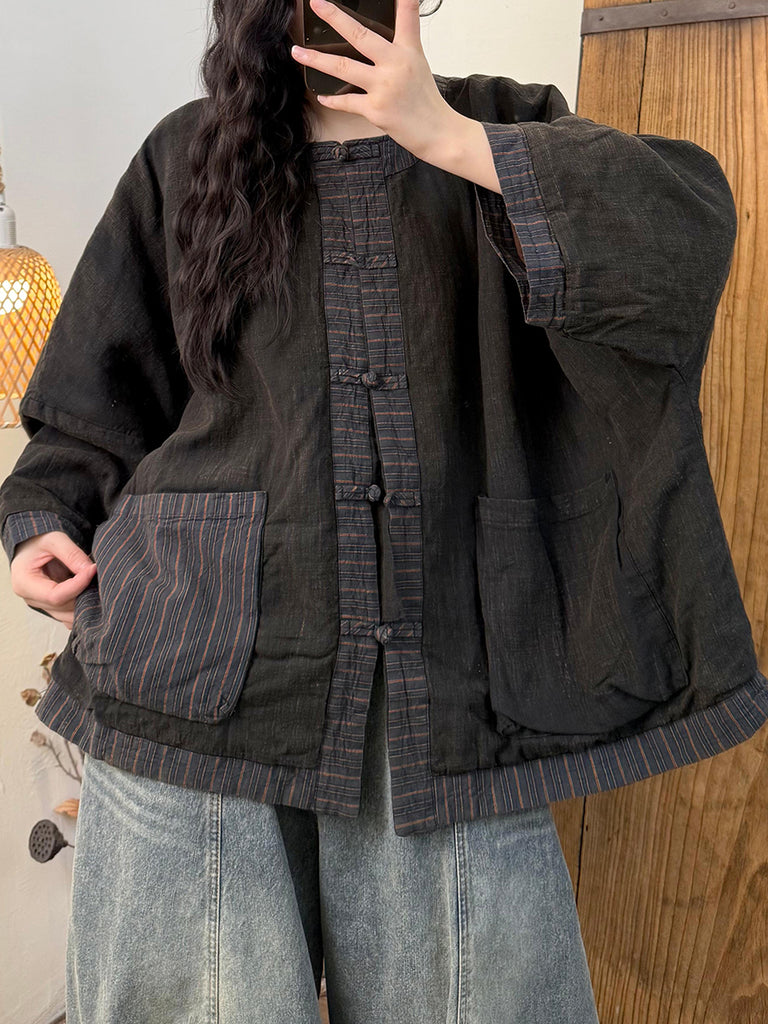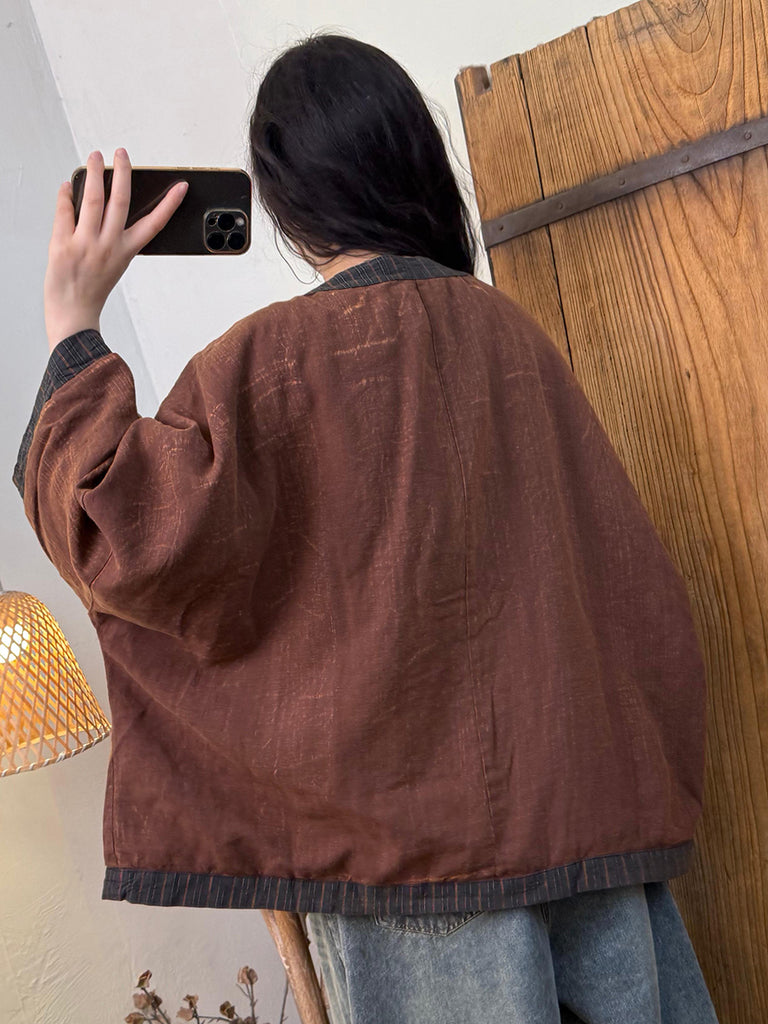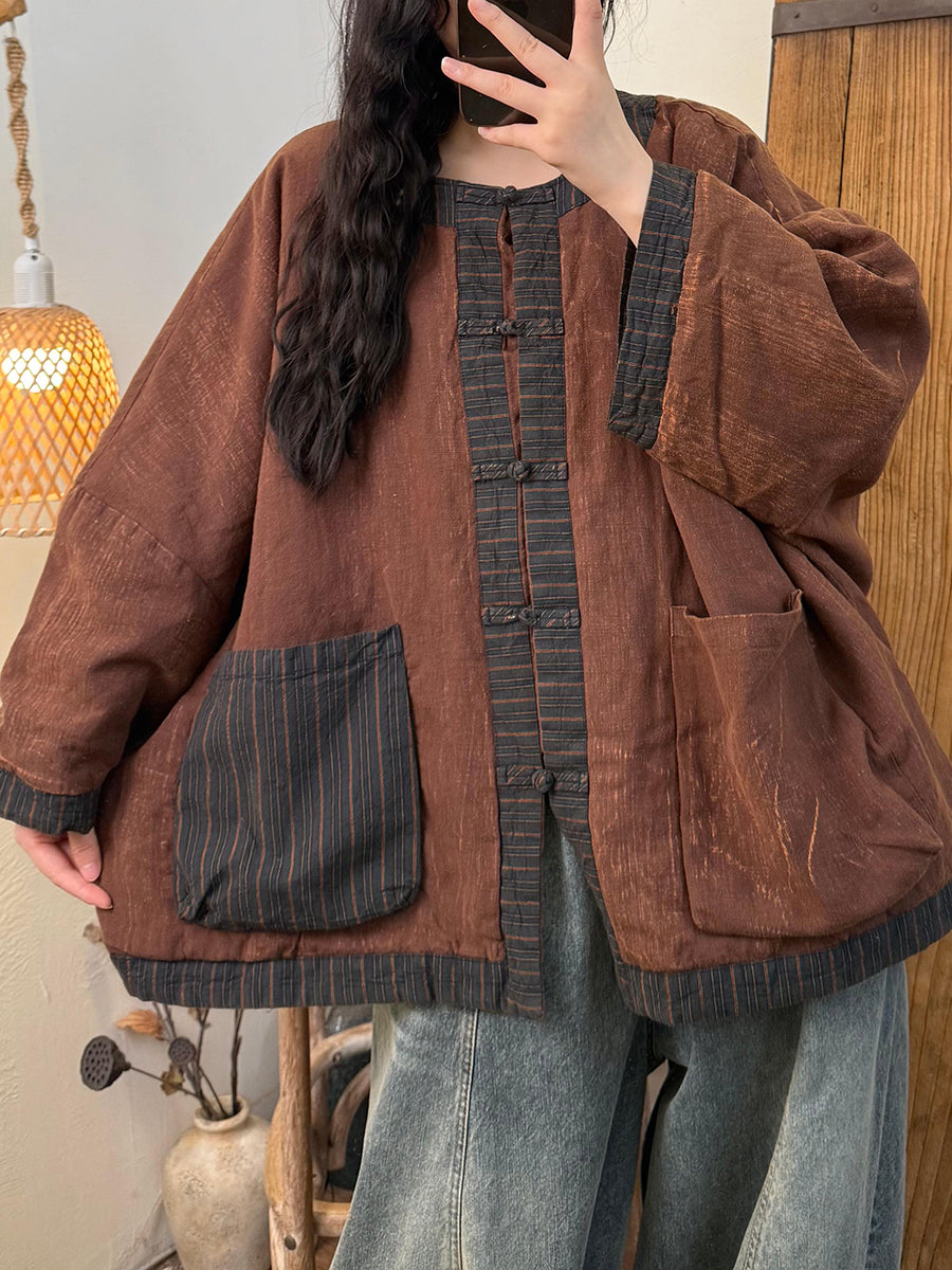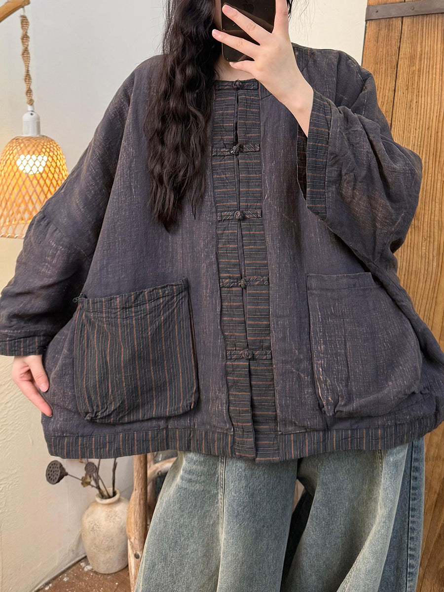 معطف نسائي شتوي عتيق مخطط برقبة دائرية مبطن