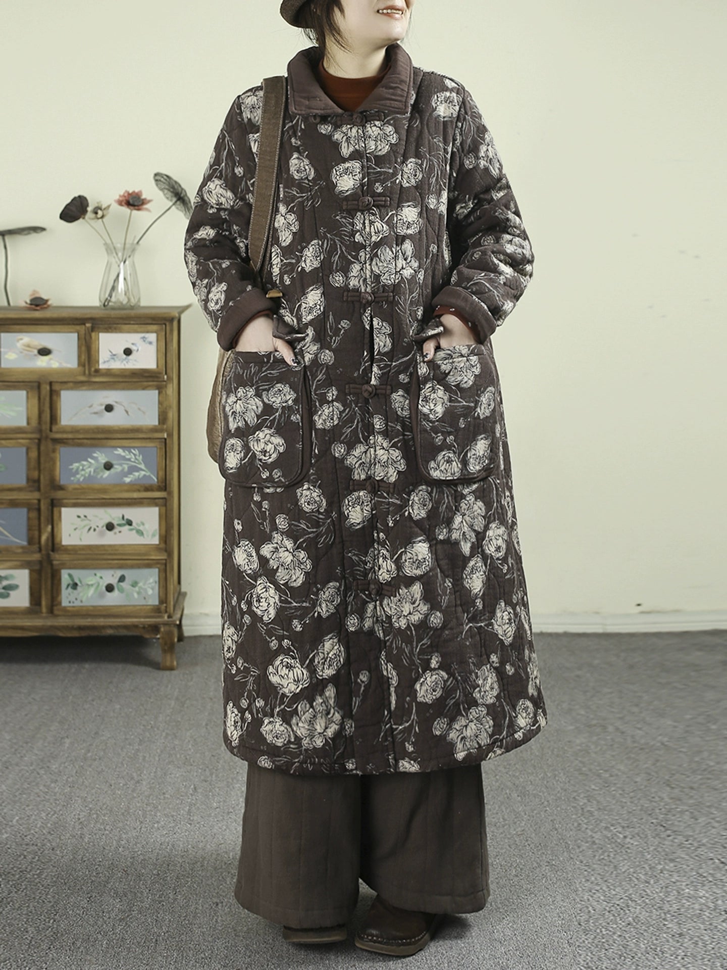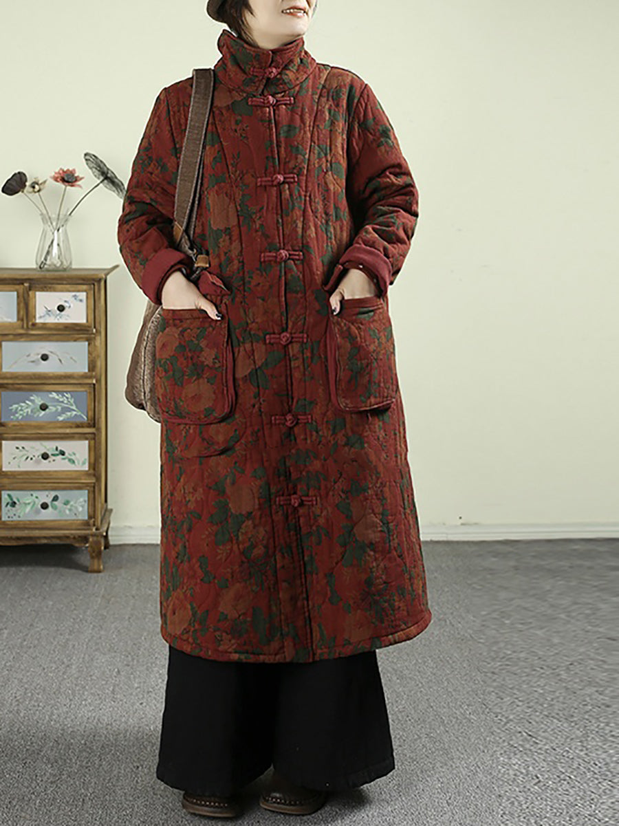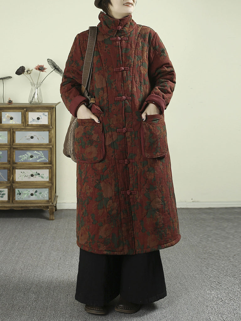 معطف نسائي شتوي مبطن بياقة مطوية ومزين بنقشة زهور عتيقة
