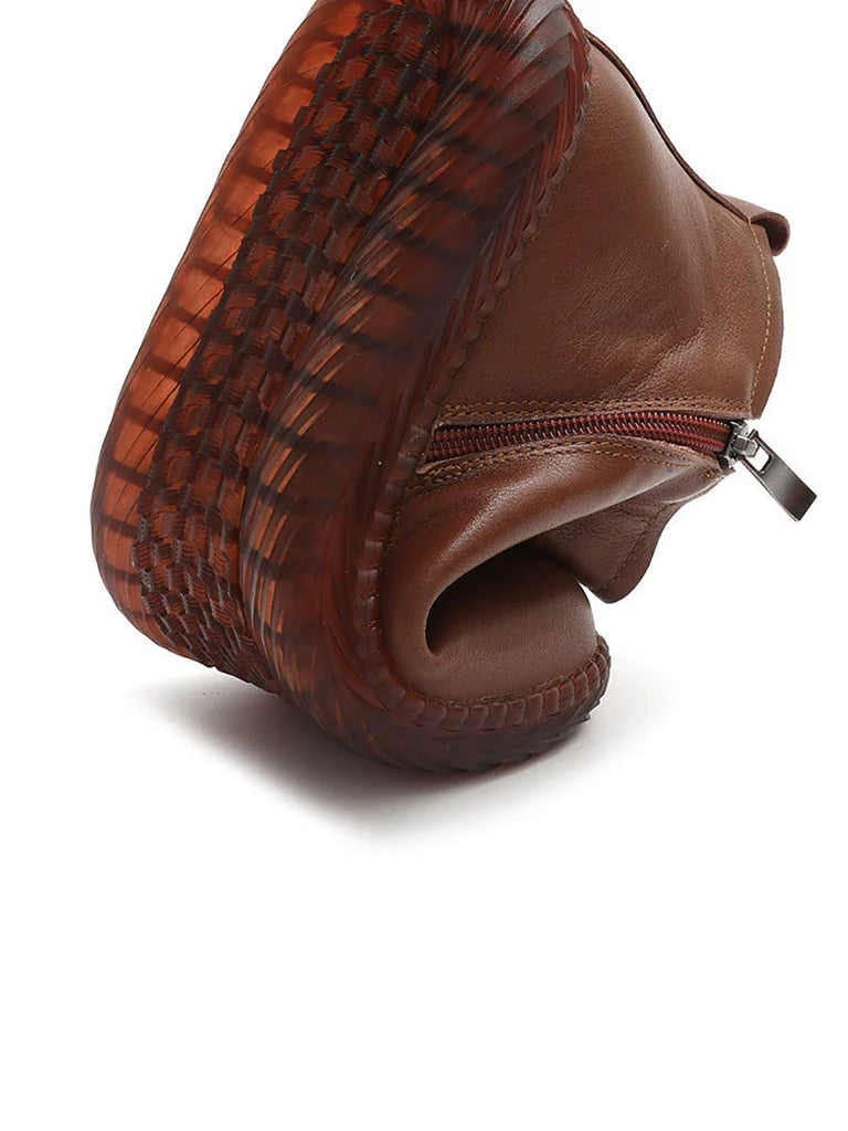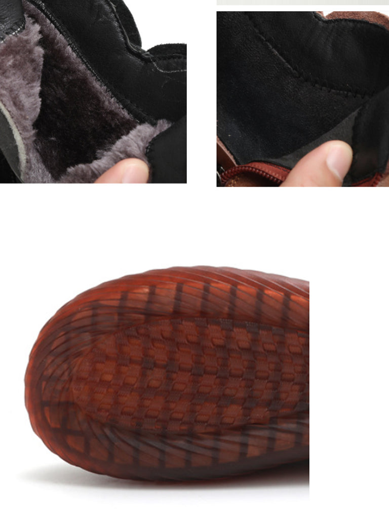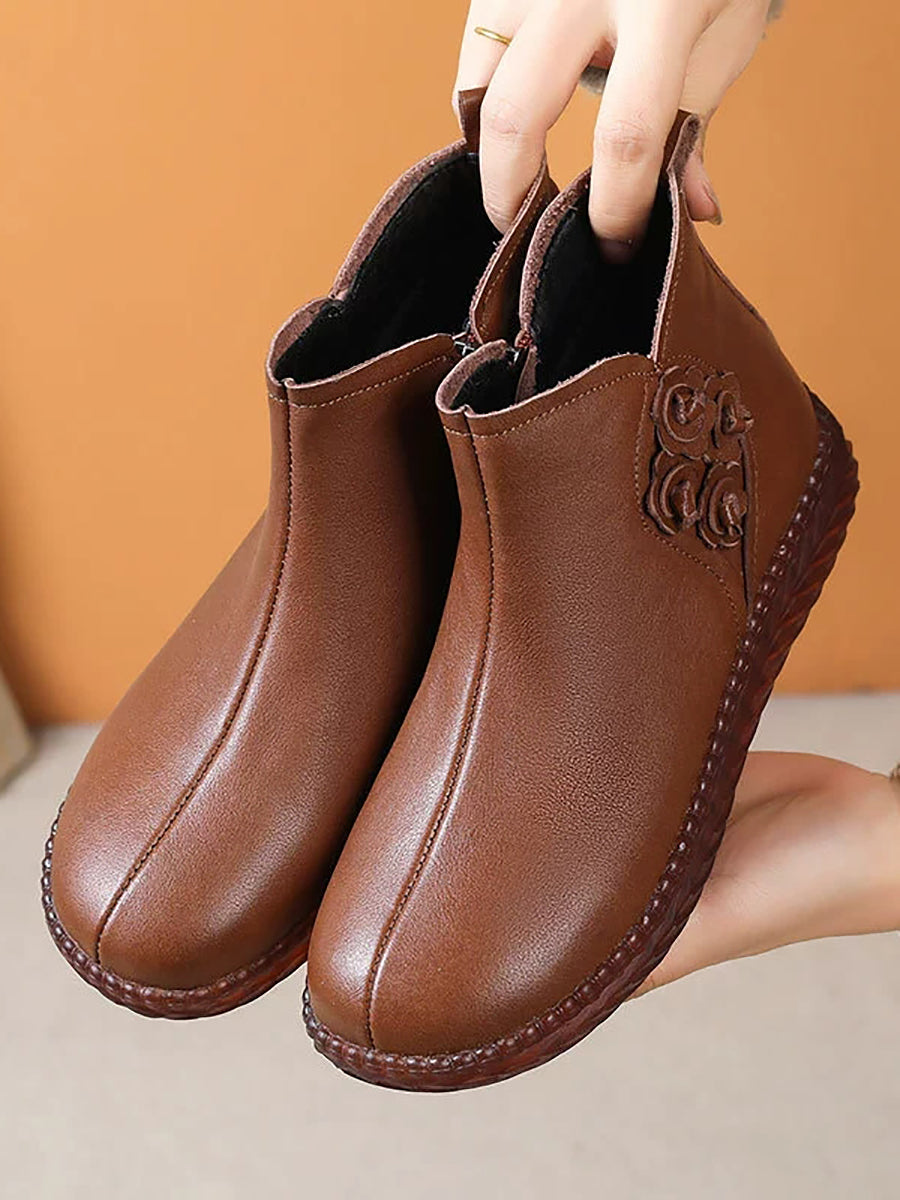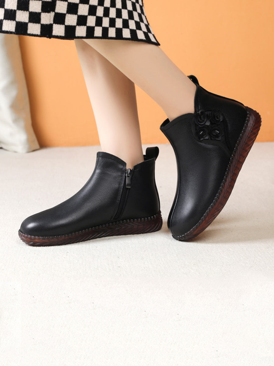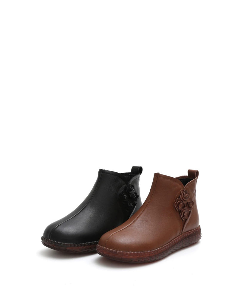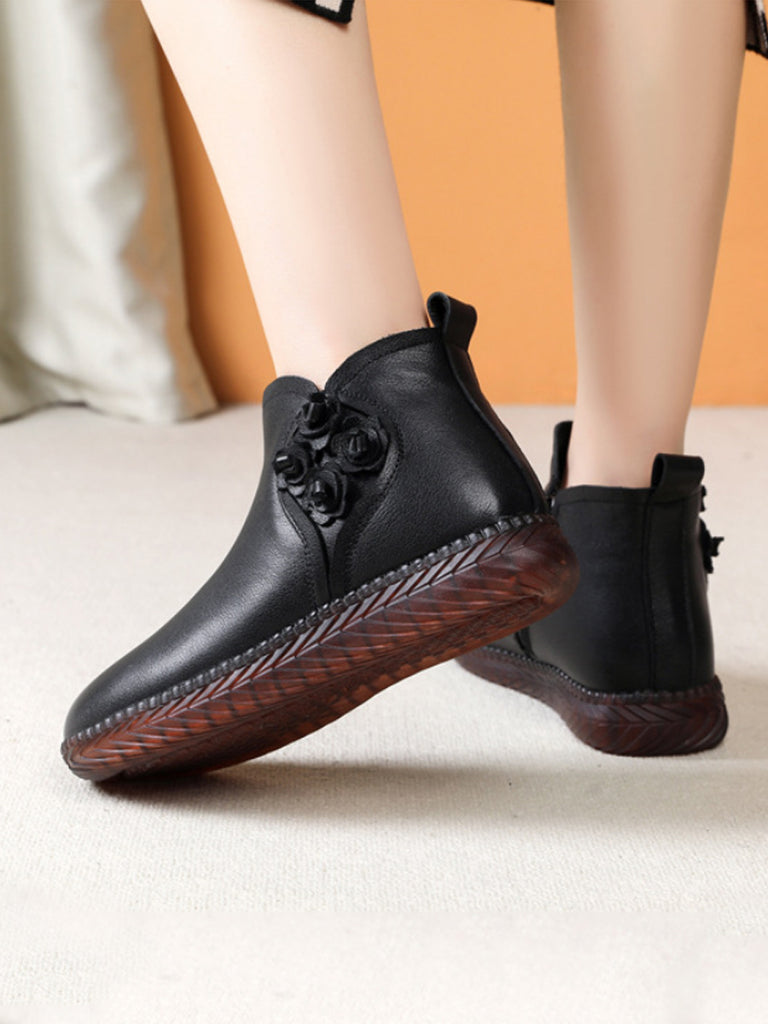 حذاء نسائي شتوي عتيق من الجلد مبطن بالصوف ومزين بزهرة