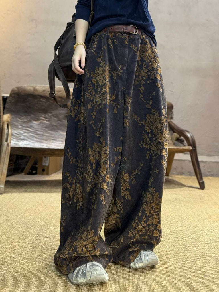 بنطلون نسائي واسع الساق من القطن بنسبة 100% بتصميم زهور الخريف الرجعية
