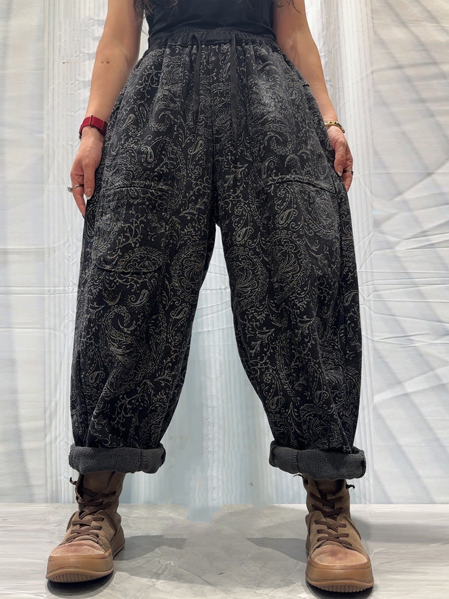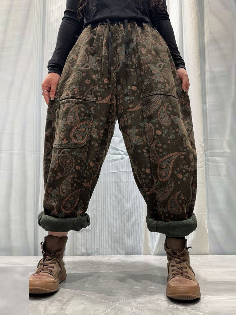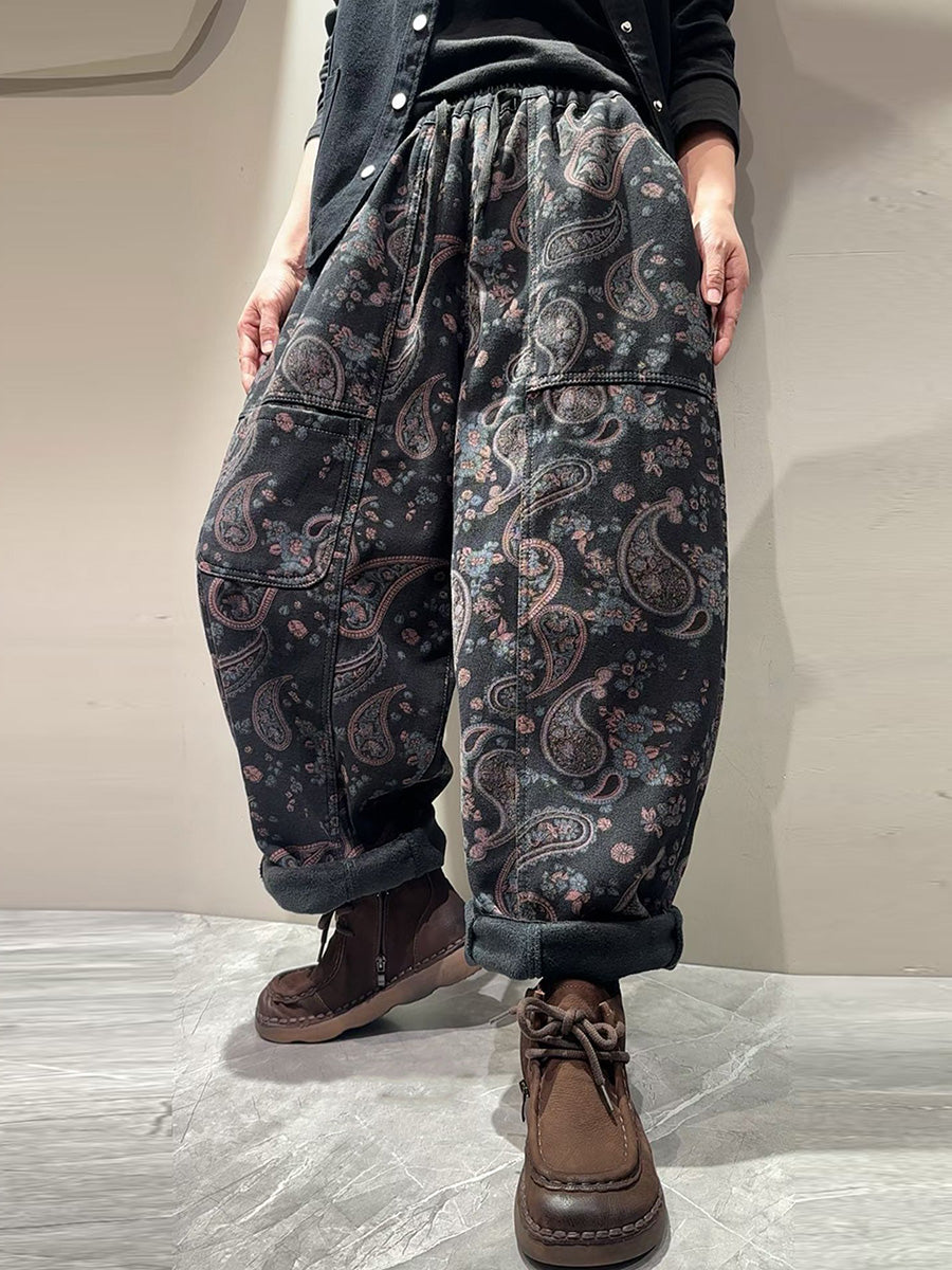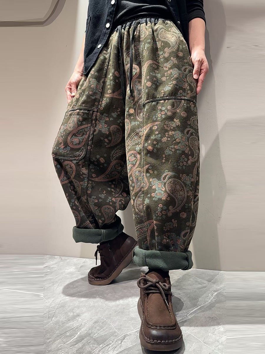 بنطلون حريم نسائي مبطن بالصوف بنقشة زهور عتيقة