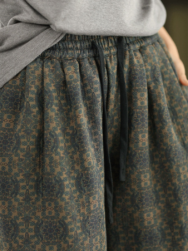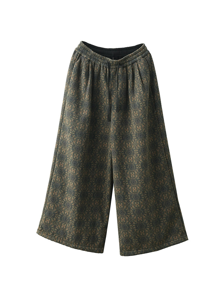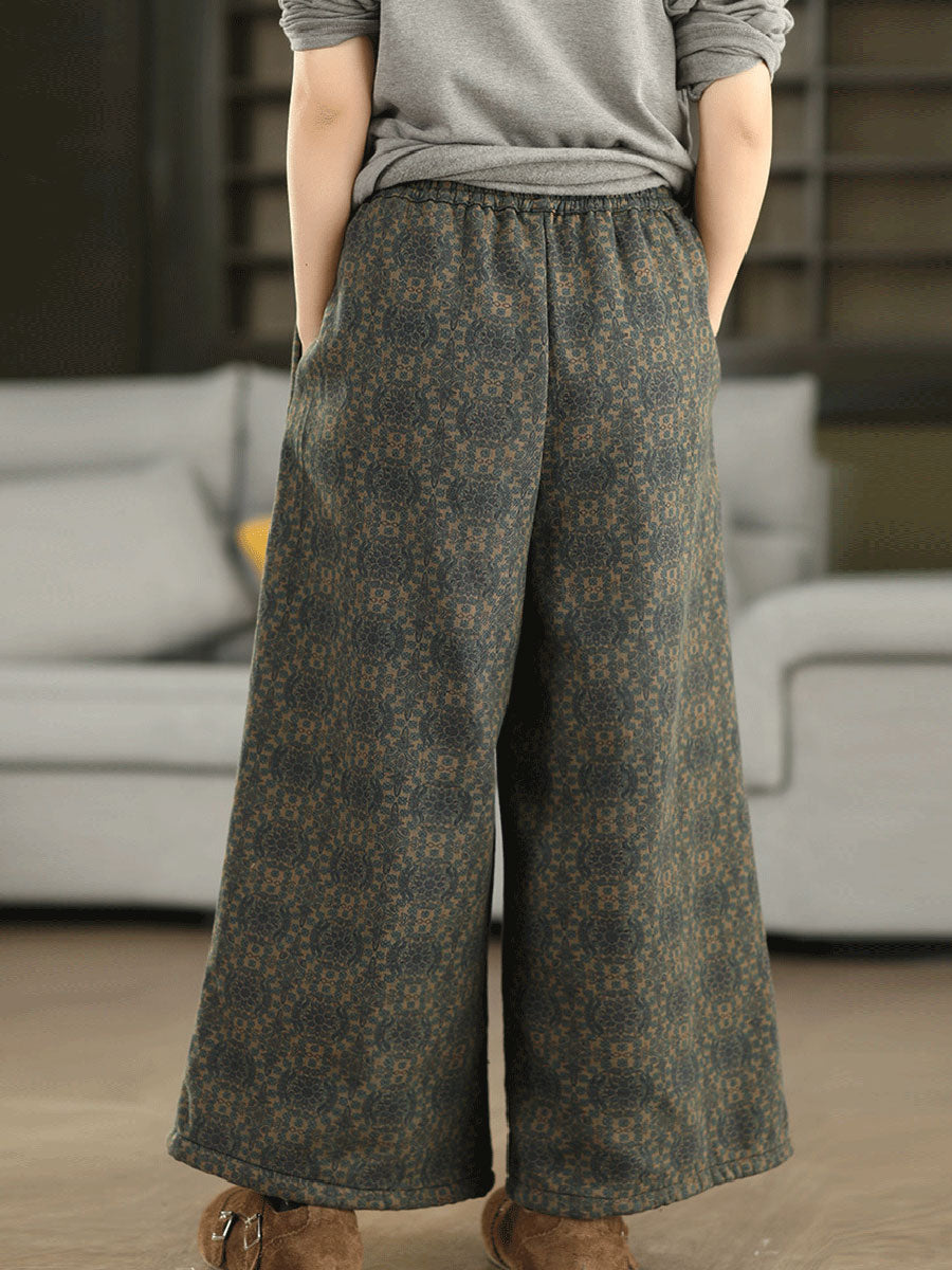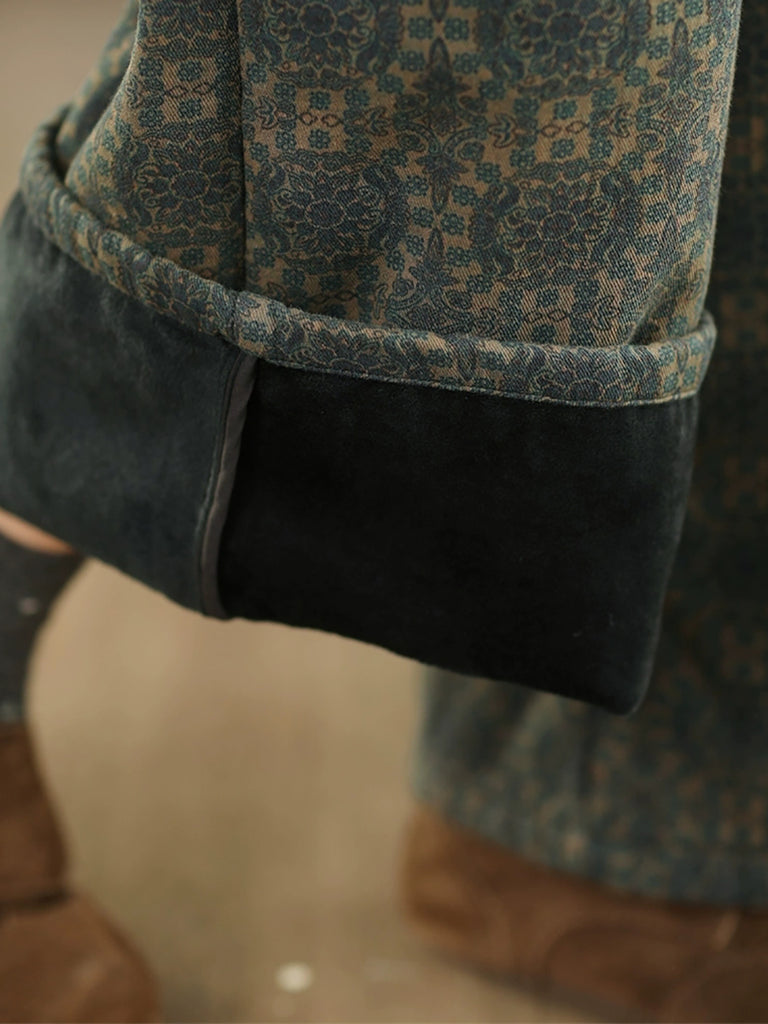 بنطلون نسائي شتوي مستقيم مبطن بالصوف بنقشة زهور عتيقة