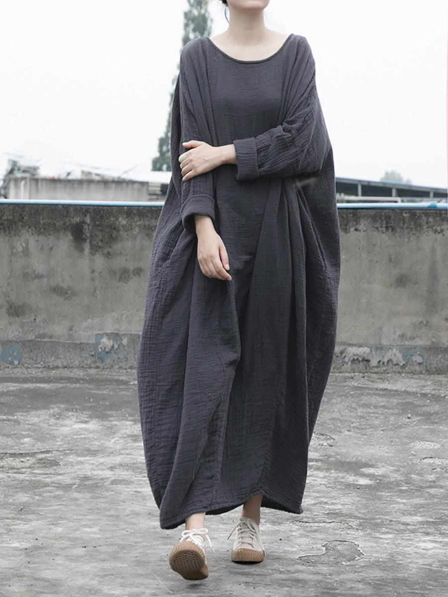 فستان نسائي كاجوال من القطن والكتان برقبة دائرية لفصل الخريف