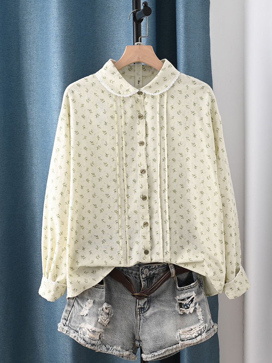 قميص نسائي ربيعي مزين بنقوش زهور فنية، مصنوع من القطن الخالص 100%، بياقة مطوية.
