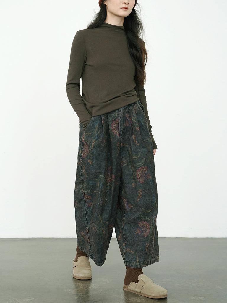 بنطلون جينز نسائي شتوي واسع الساق مزين بزهور عتيقة