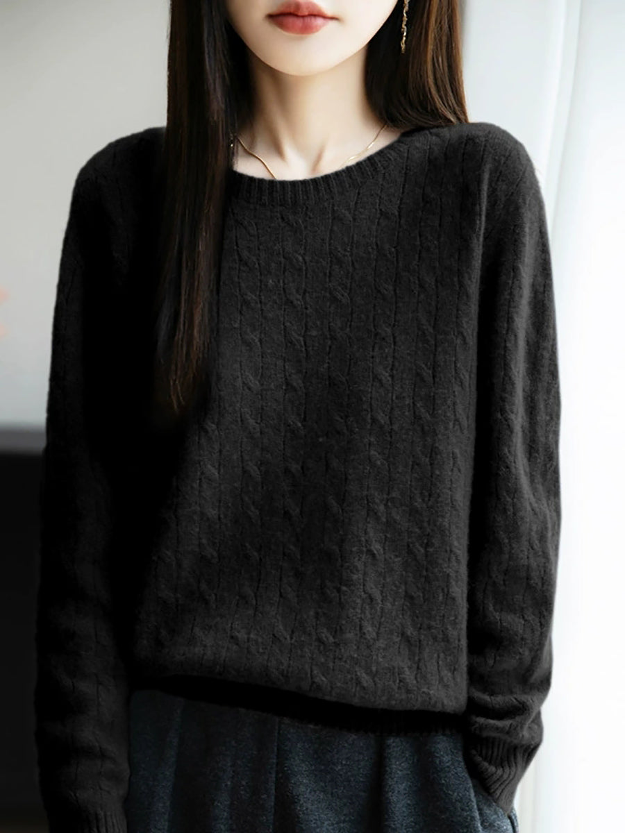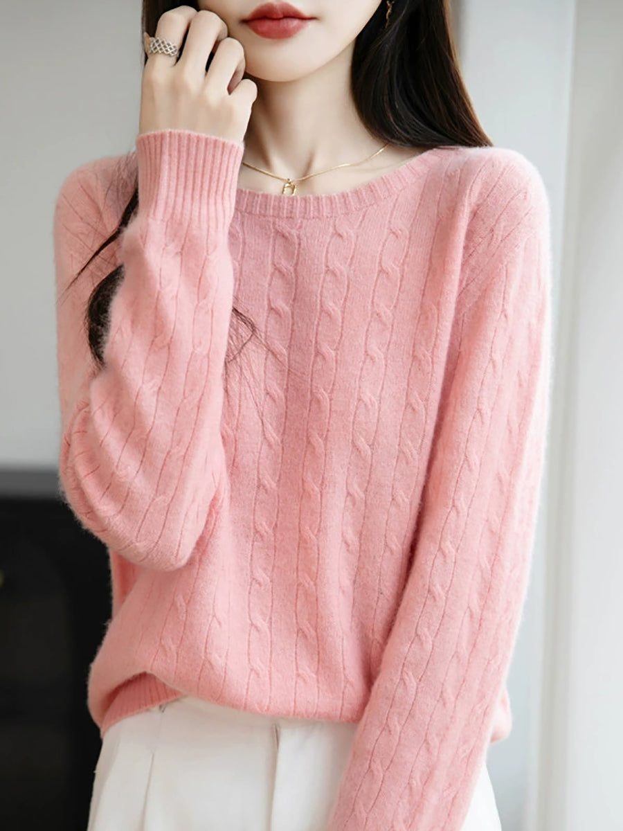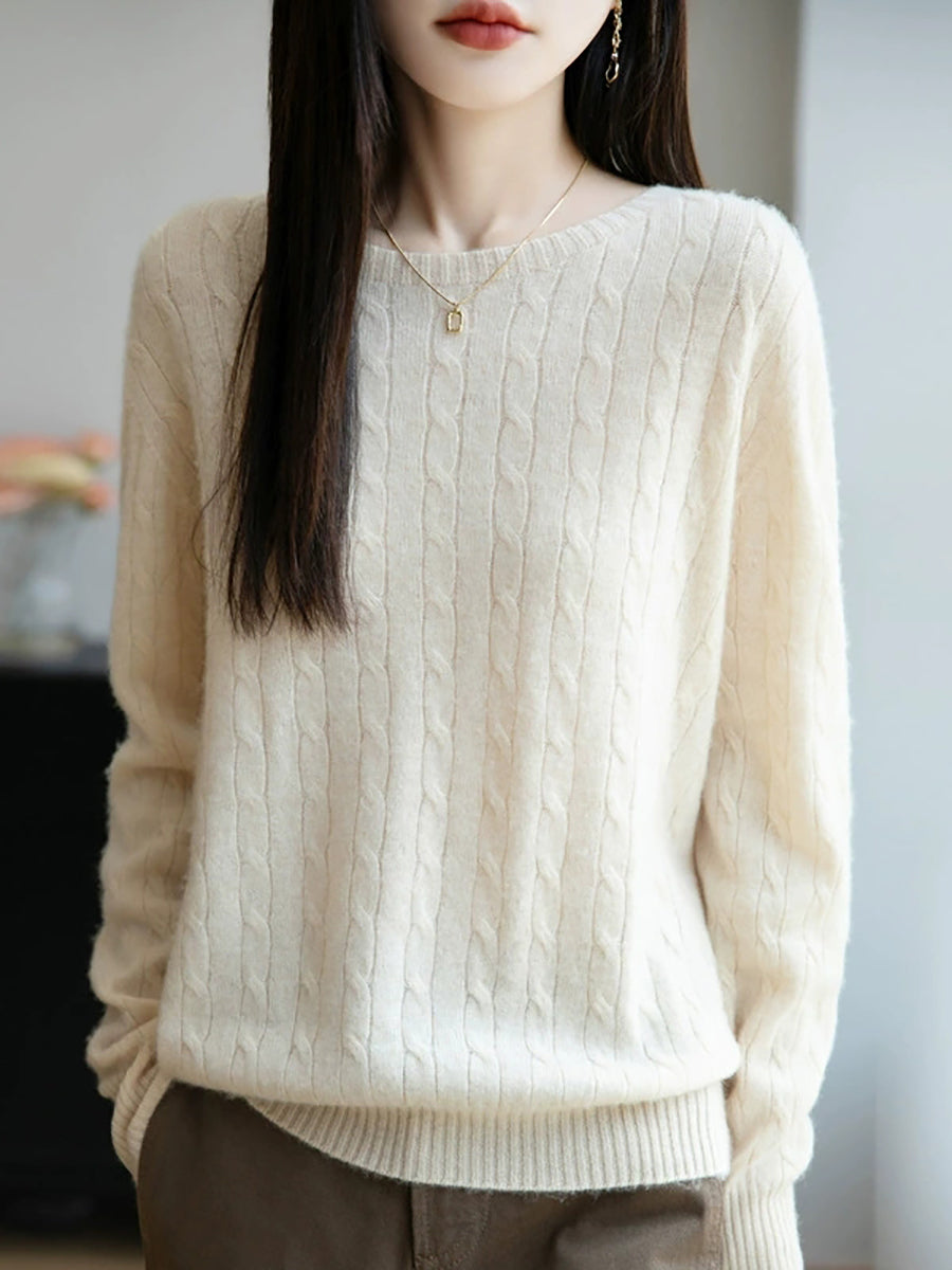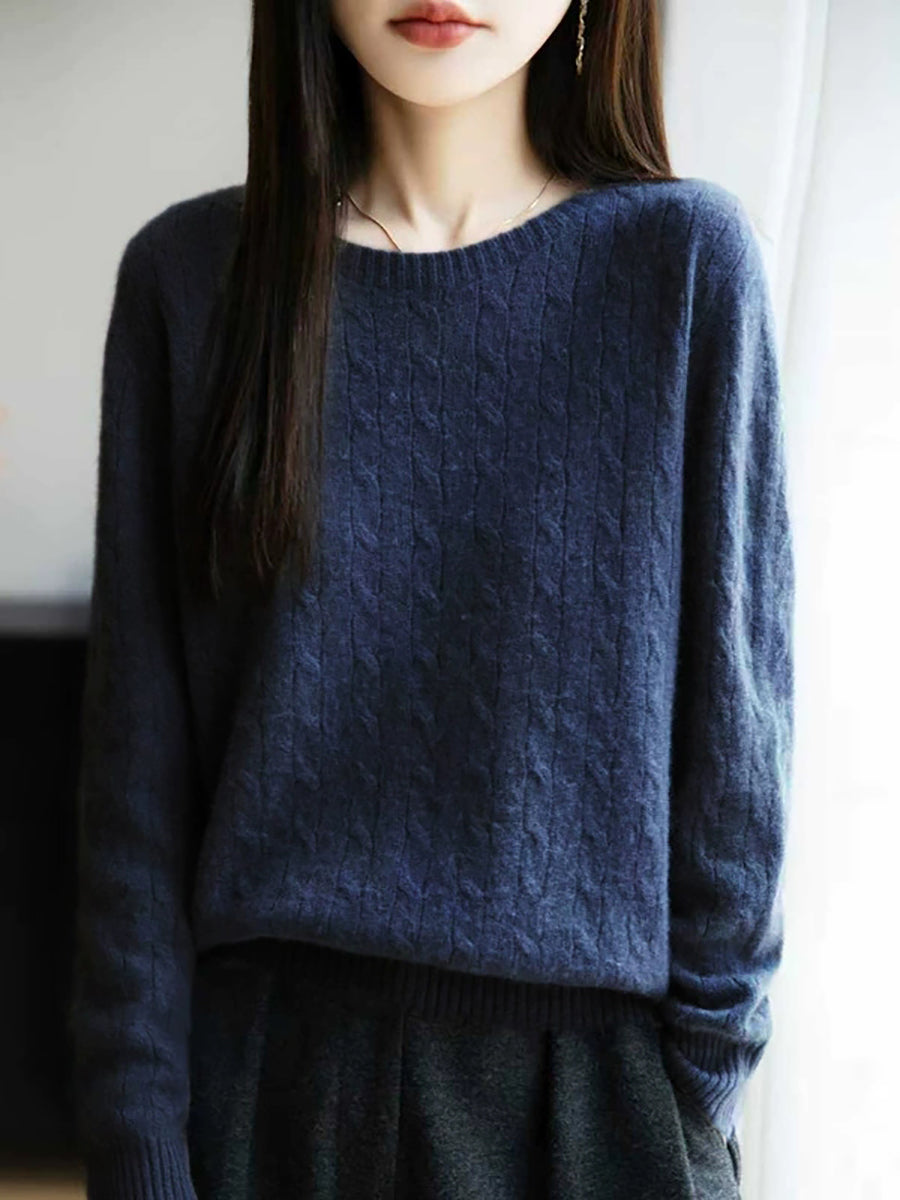 كنزة نسائية ربيعية بلون موحد، محبوكة بنمط كابل، بياقة دائرية