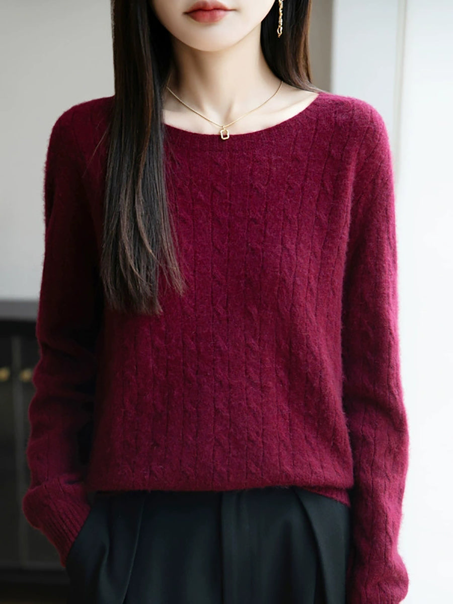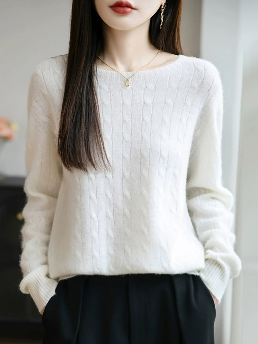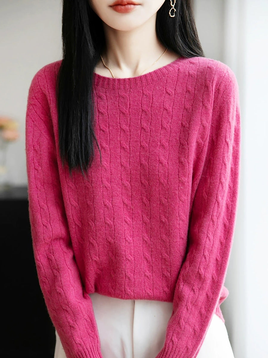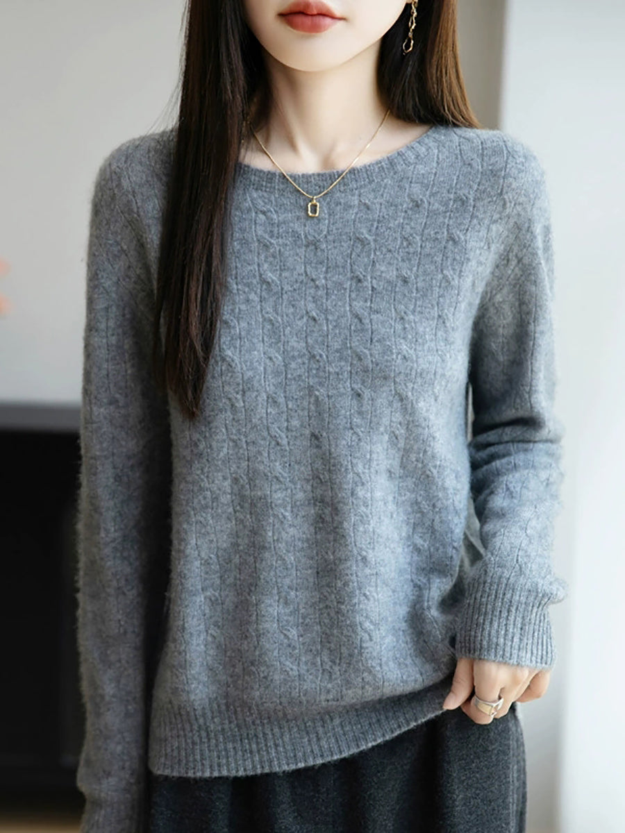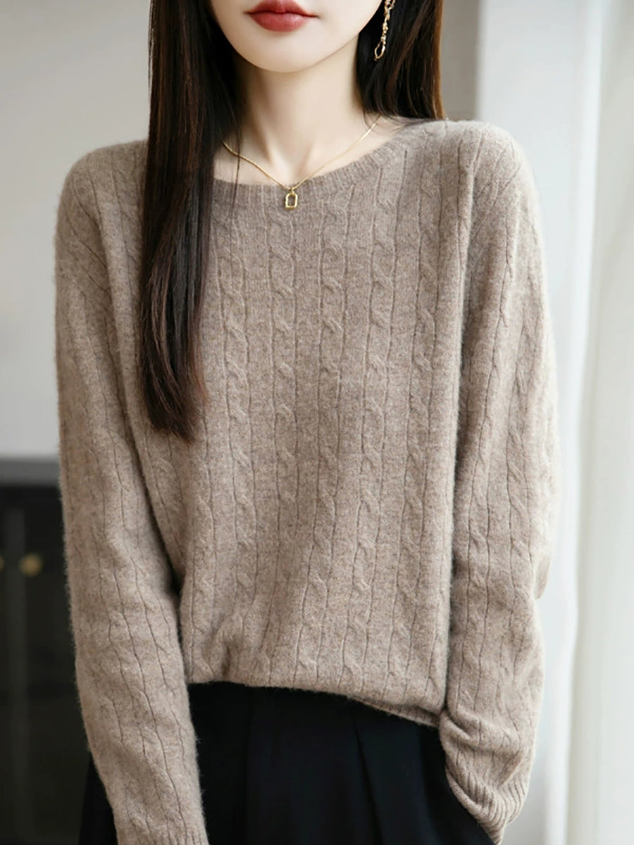 كنزة نسائية ربيعية بلون موحد، محبوكة بنمط كابل، بياقة دائرية