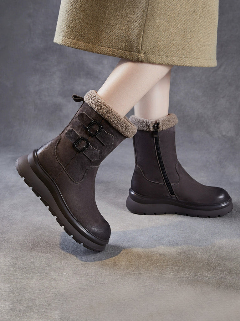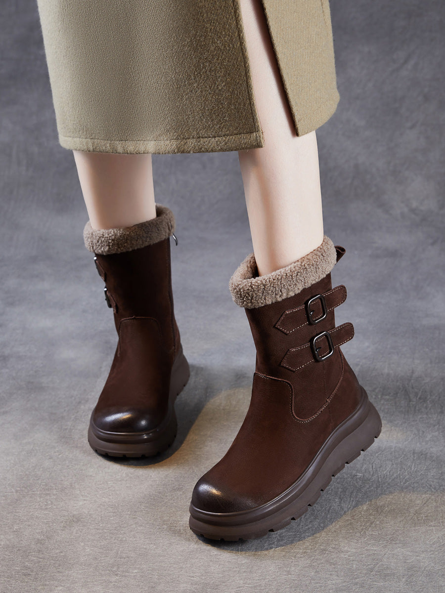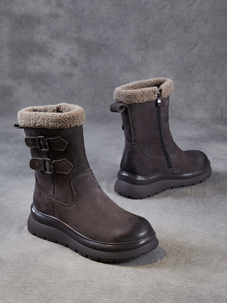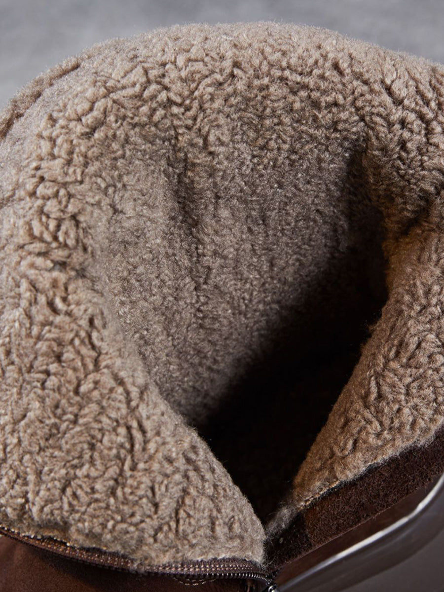 حذاء نسائي شتوي بكعب متوسط مبطن بالصوف من الجلد الطبيعي