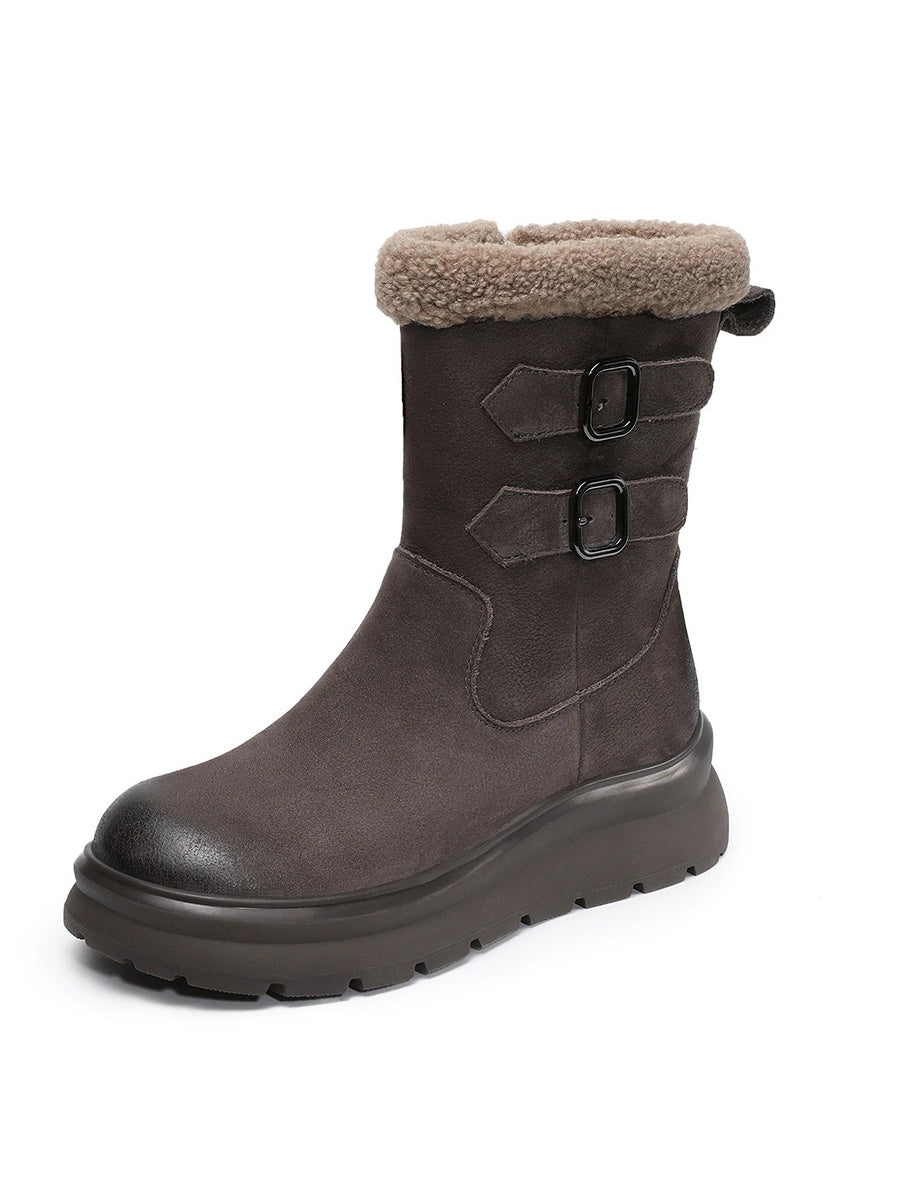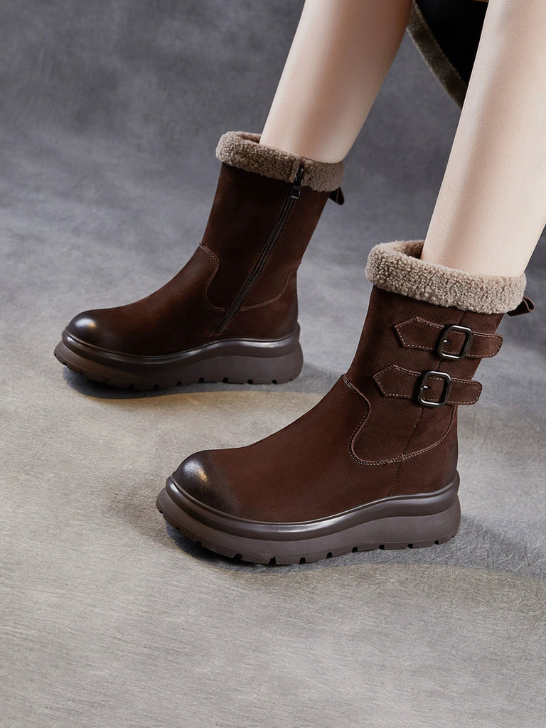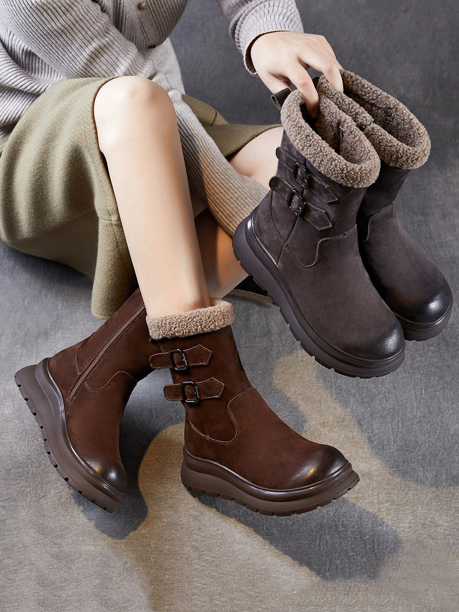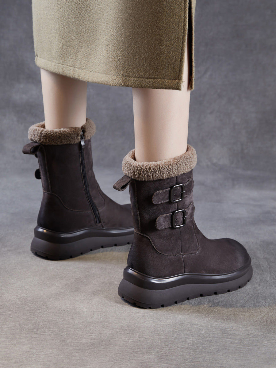 حذاء نسائي شتوي بكعب متوسط مبطن بالصوف من الجلد الطبيعي