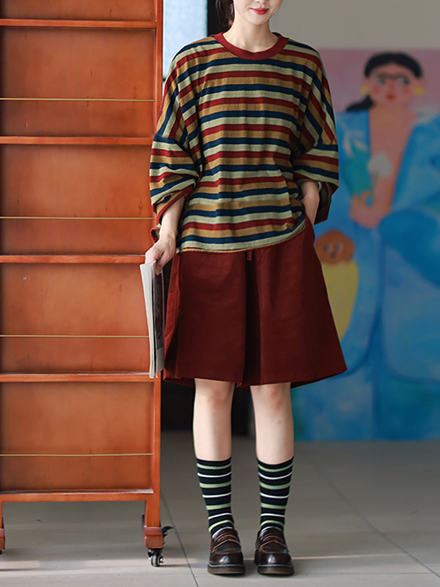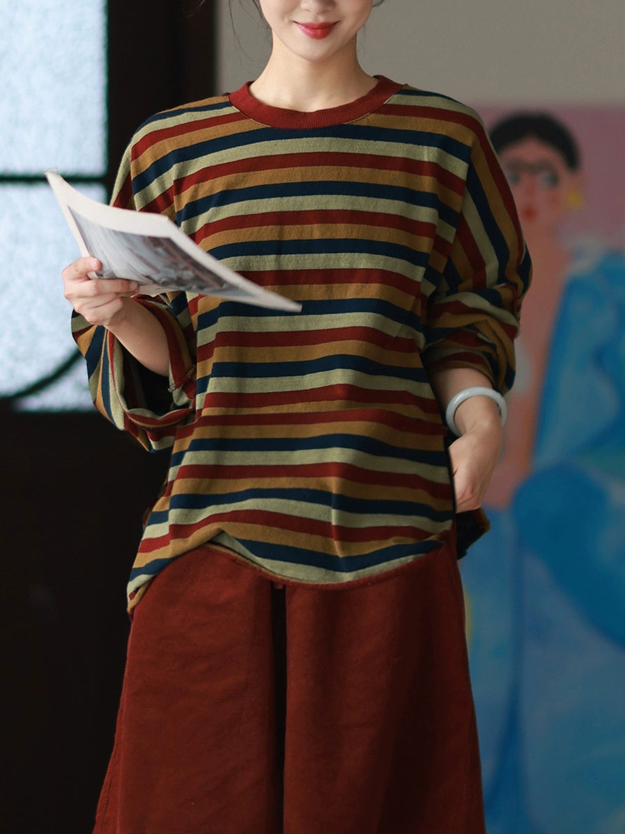 بلوزة نسائية كاجوال مخططة برقبة دائرية مصنوعة من القطن بنسبة 100% لفصل الخريف