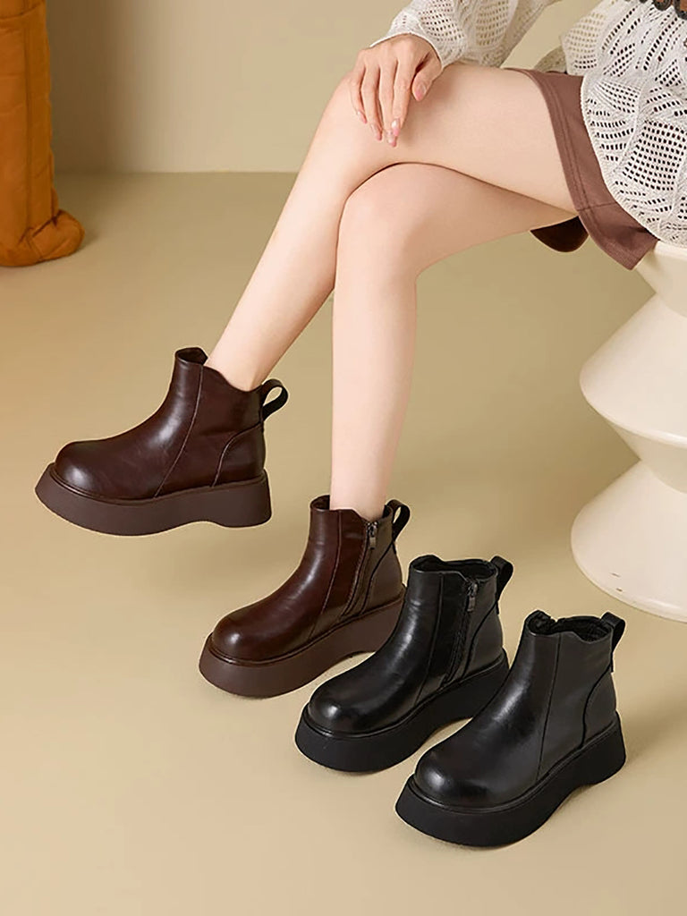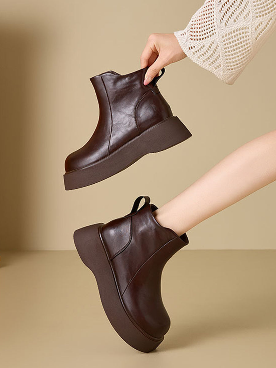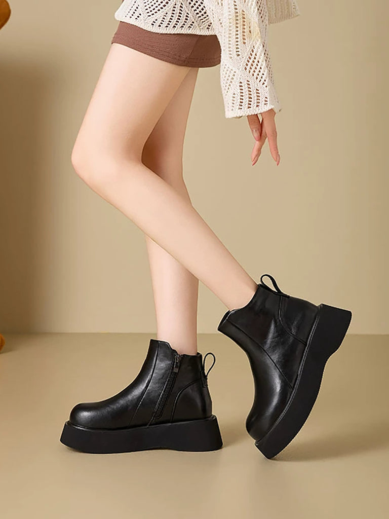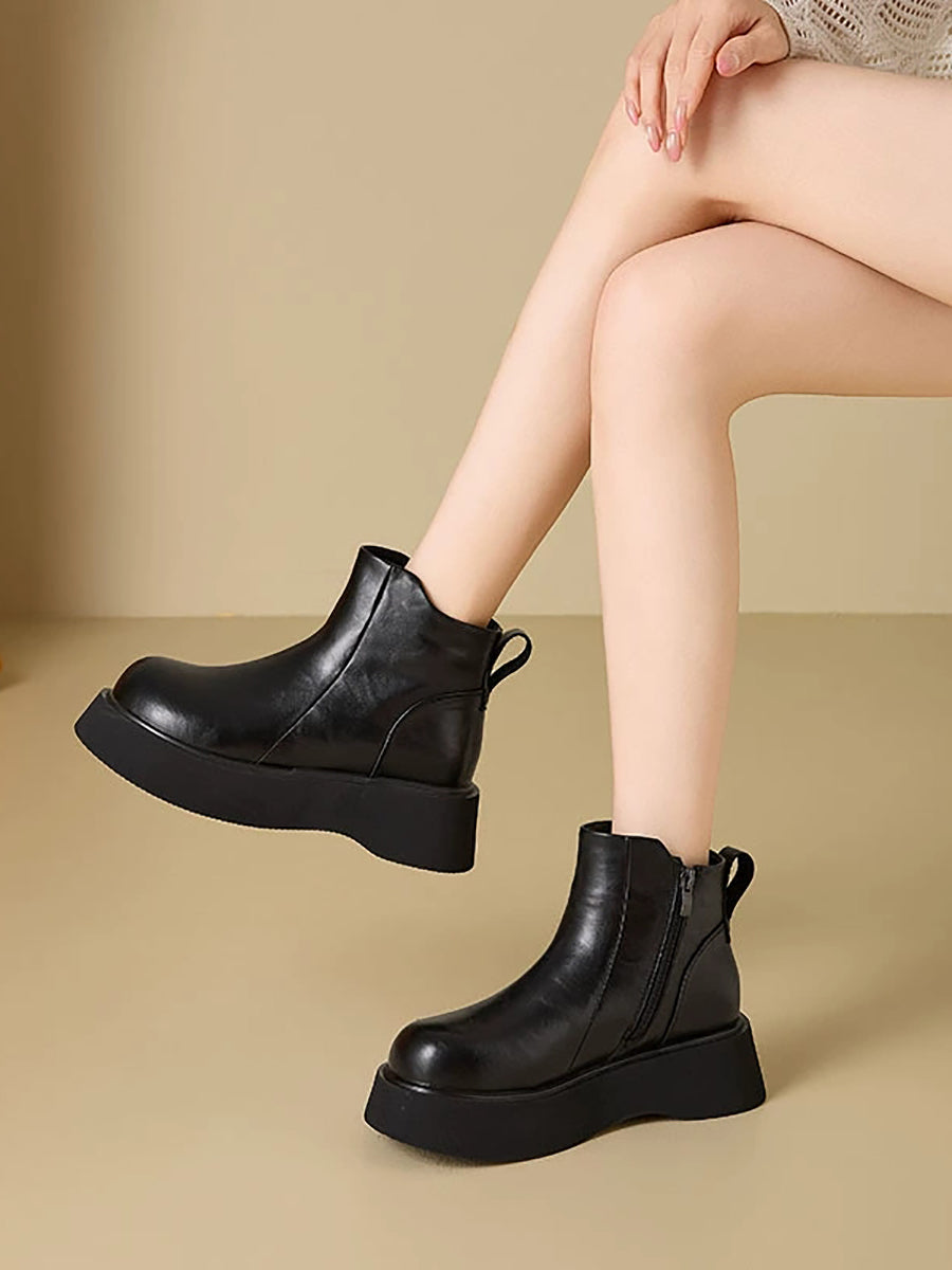 حذاء نسائي شتوي من الجلد بلون نقي بكعب سميك