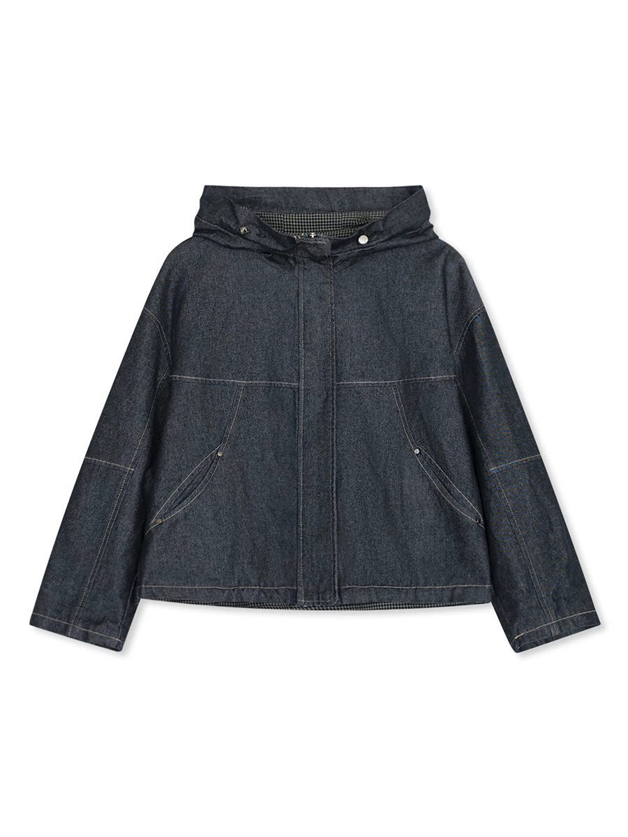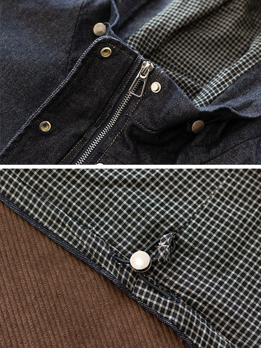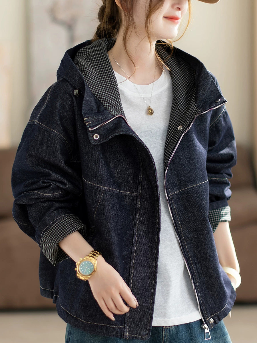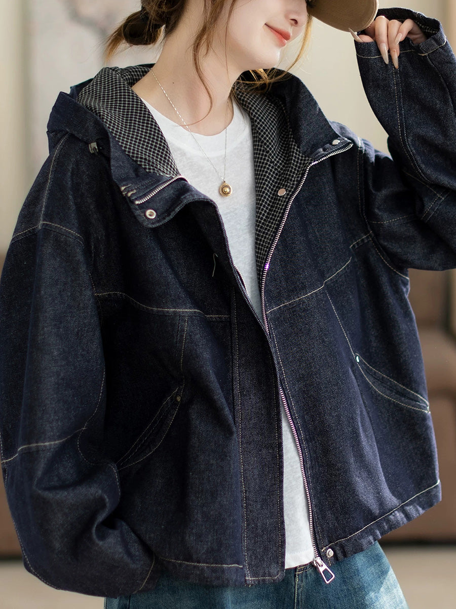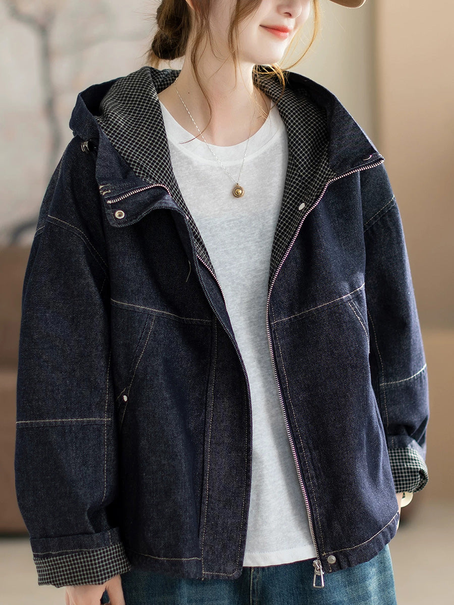 معطف نسائي ربيعي ريترو من الدنيم بلون موحد وغطاء رأس