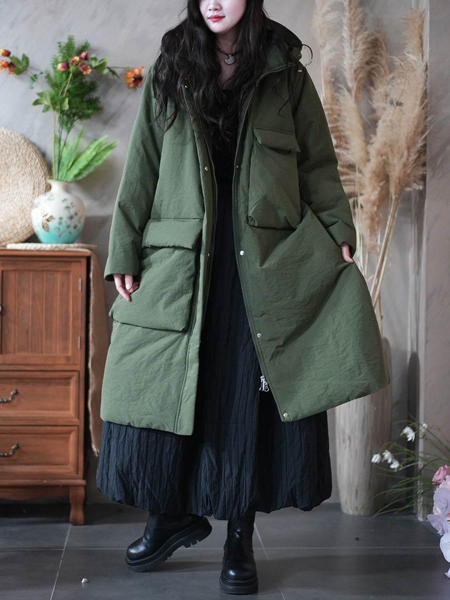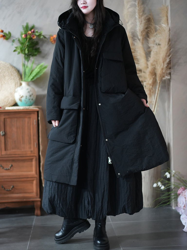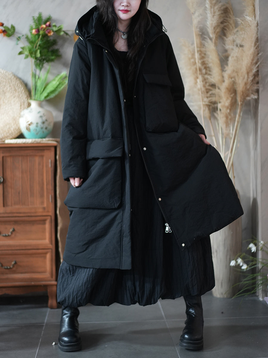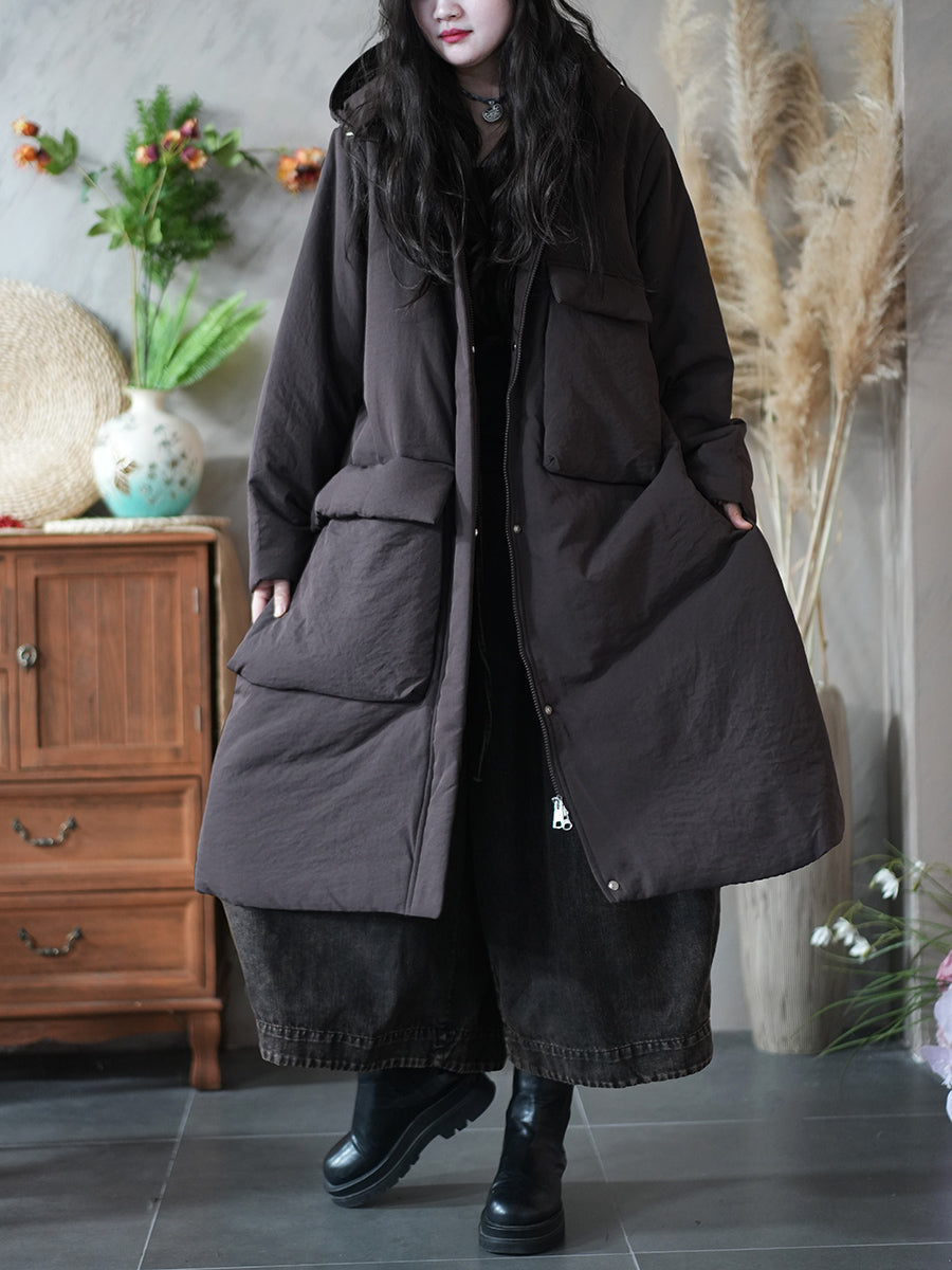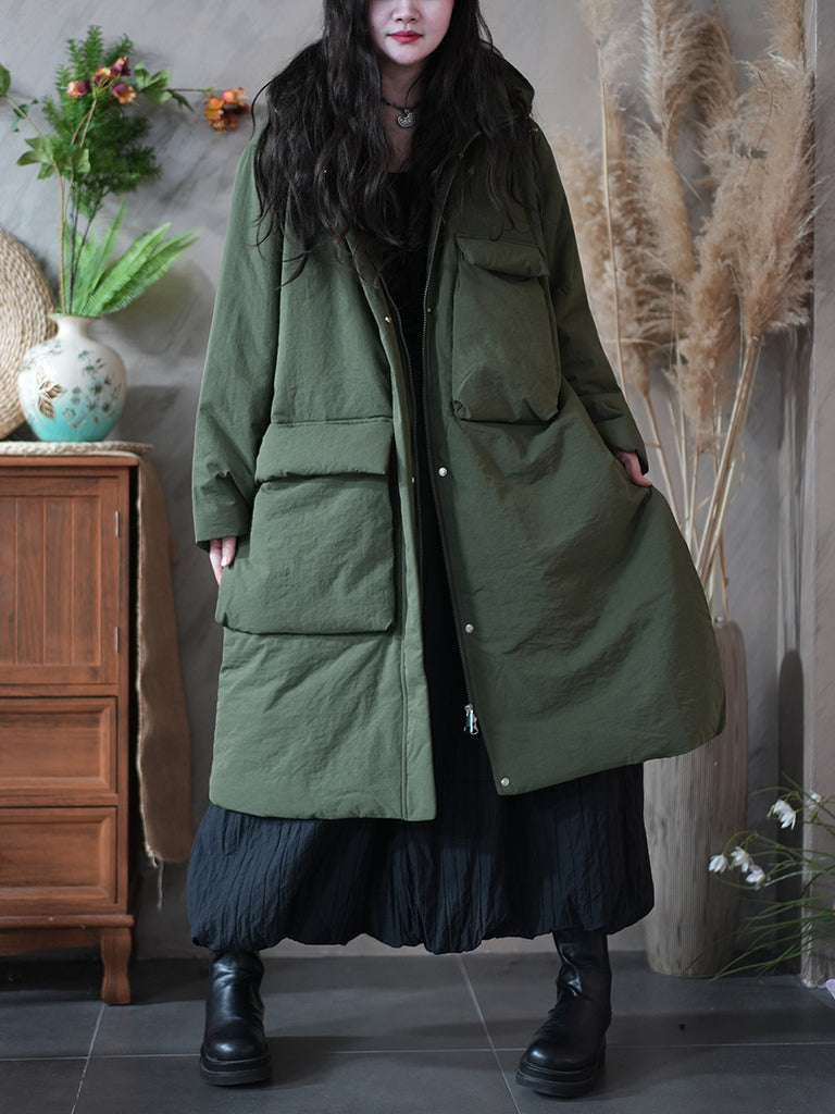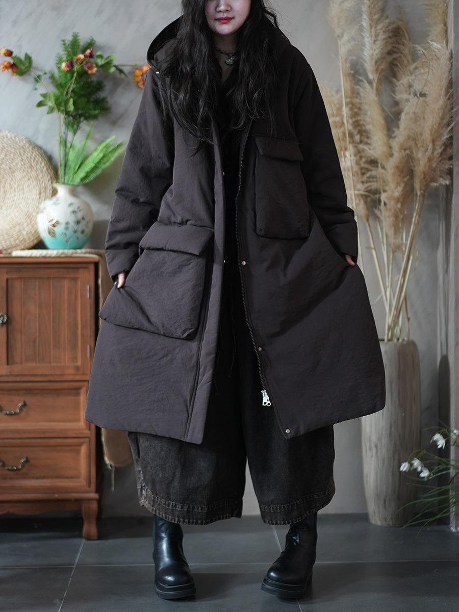معطف نسائي شتوي مبطن بغطاء للرأس مع جيب بلون نقي