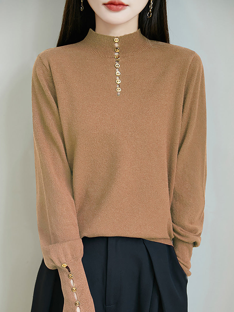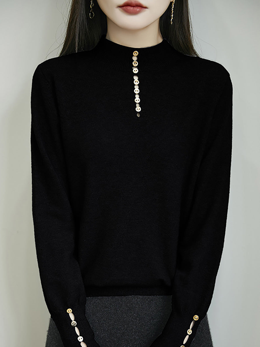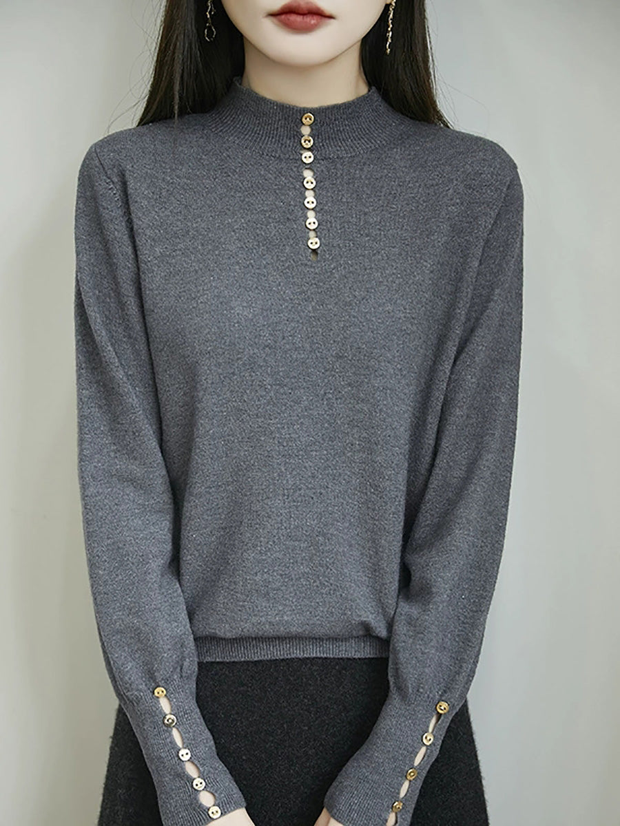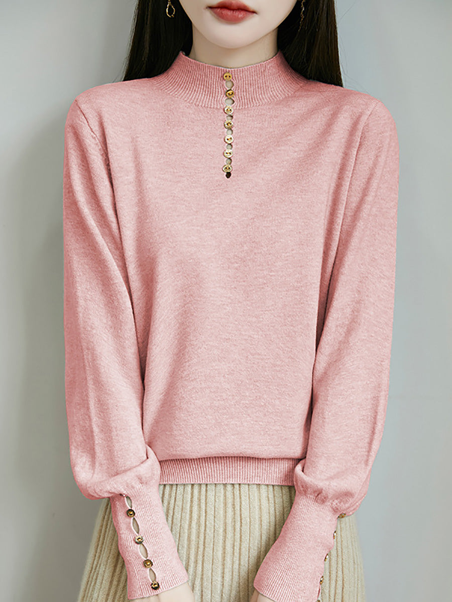 كنزة نسائية خريفية فنية بلون موحد بأزرار وياقة نصف مدورة