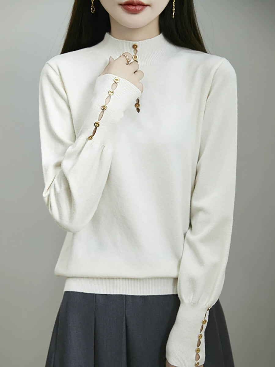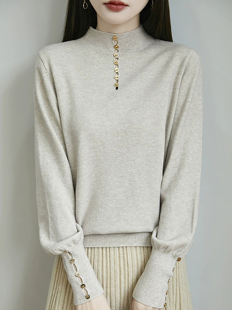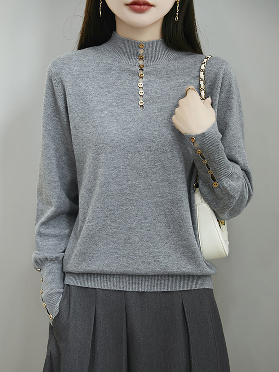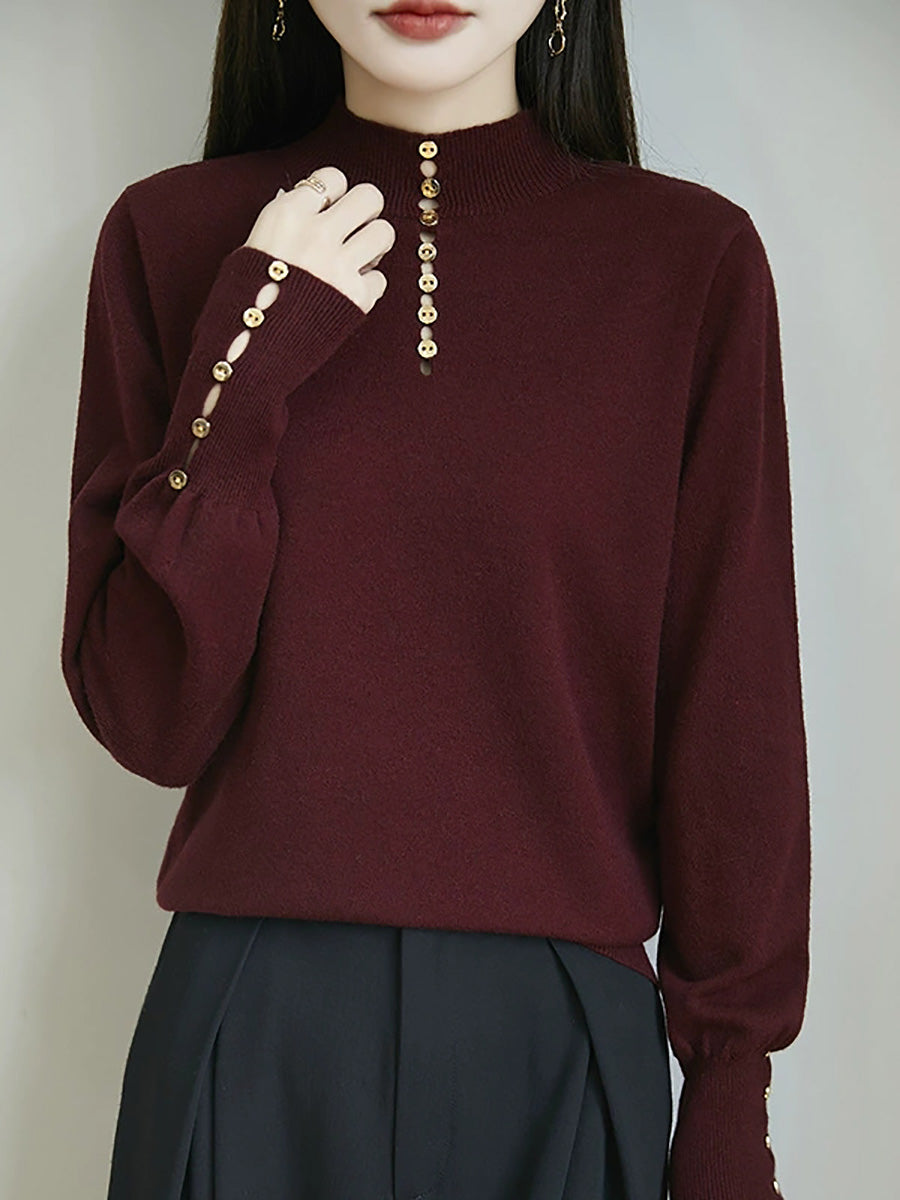 كنزة نسائية خريفية فنية بلون موحد بأزرار وياقة نصف مدورة