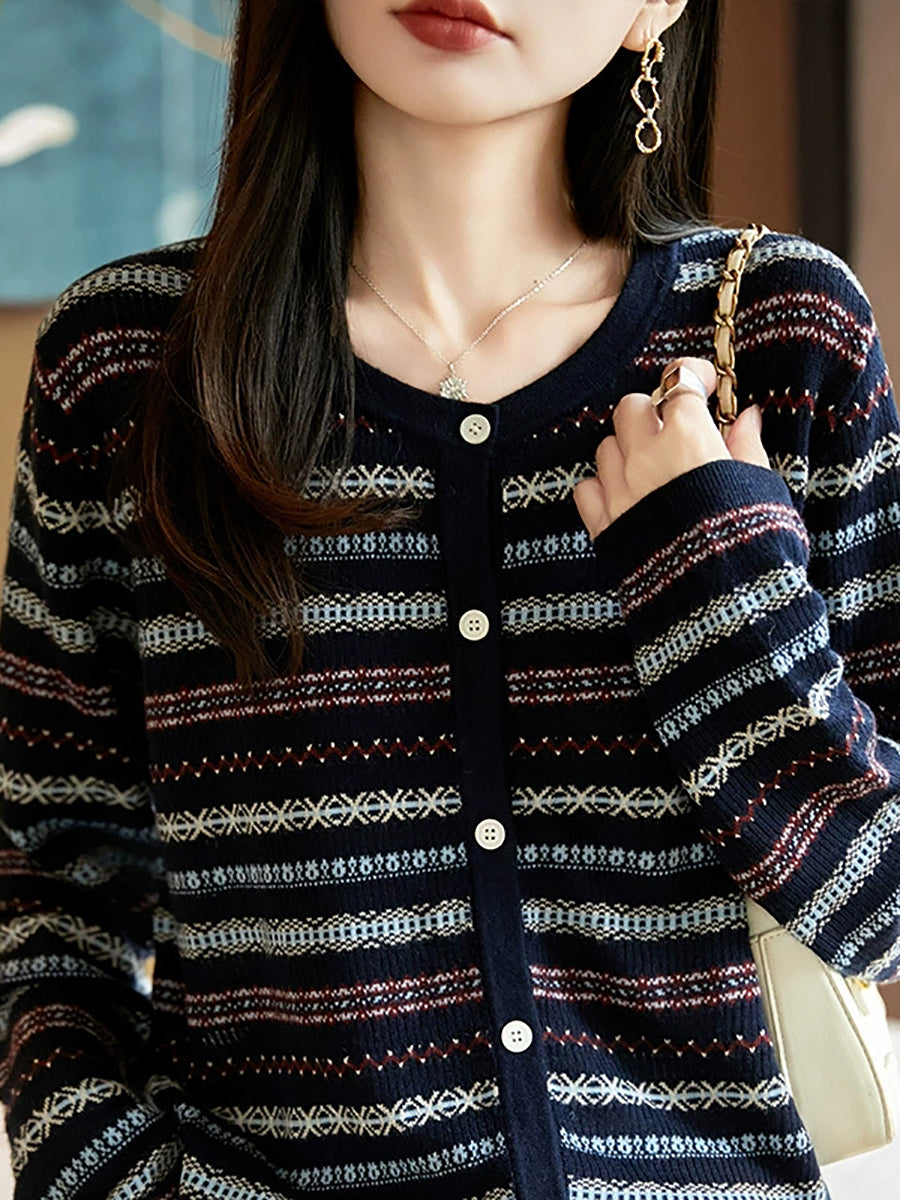 سترة نسائية محبوكة مخططة برقبة دائرية مناسبة للخريف