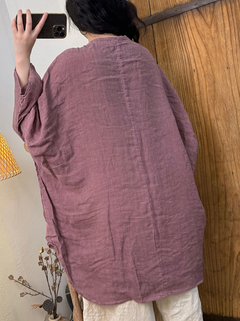 قميص نسائي خريفي من الكتان بلون نقي وياقة قائمة