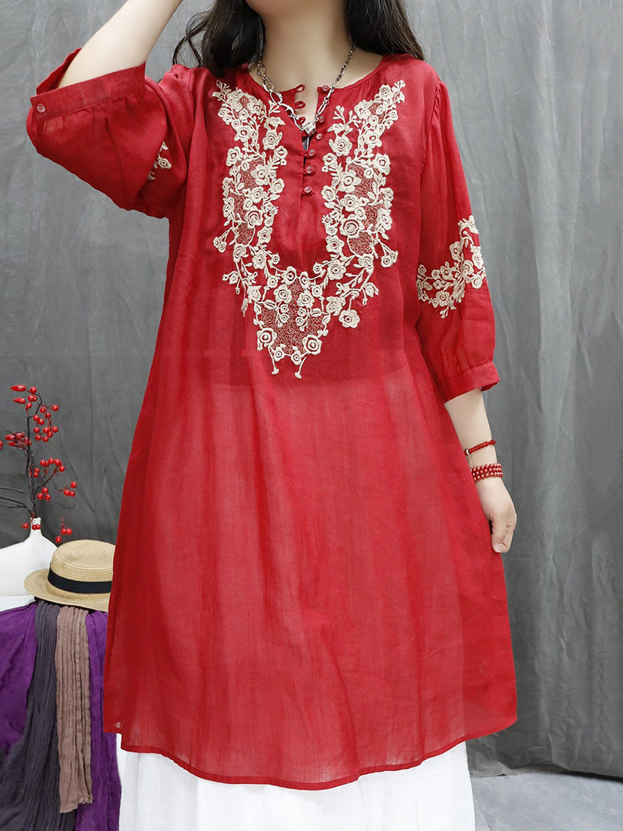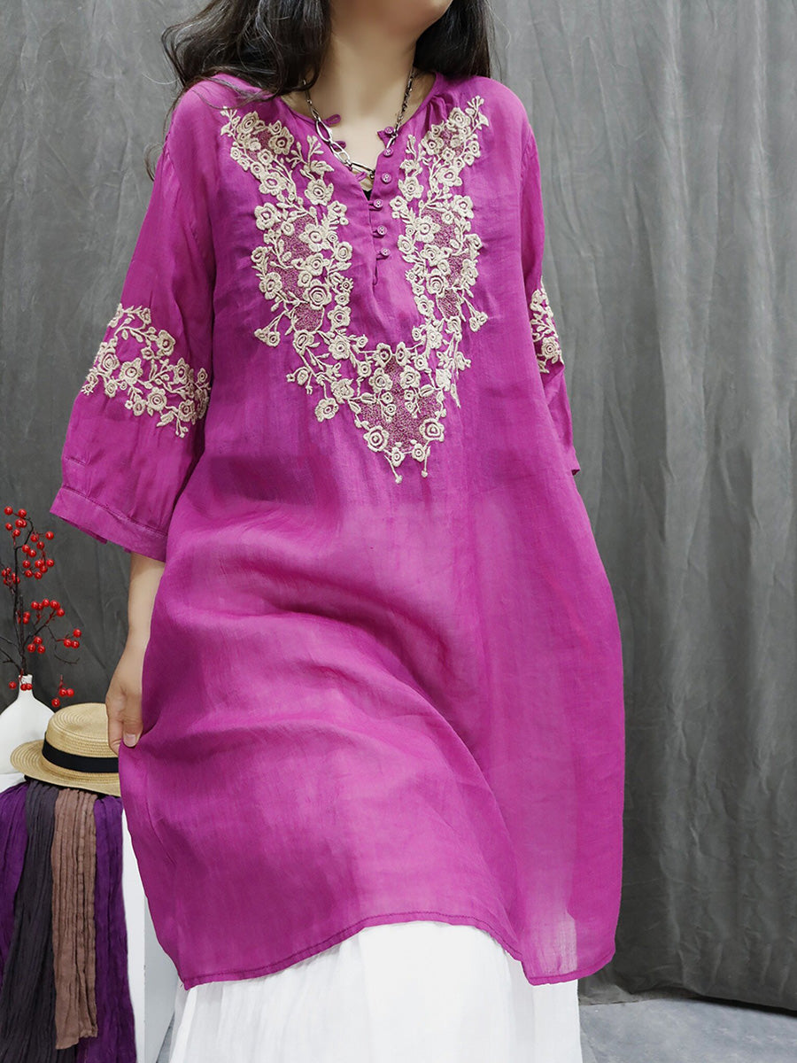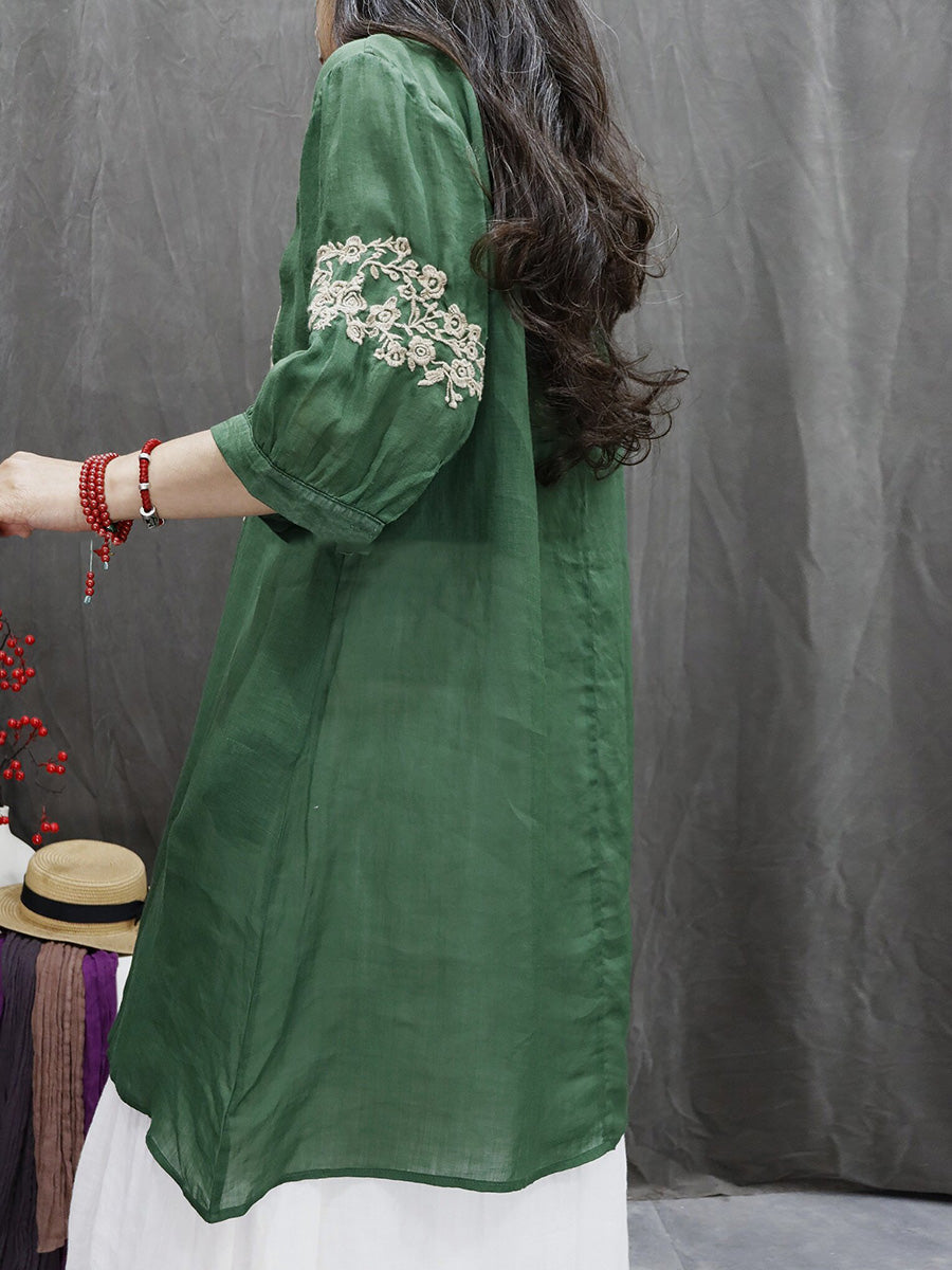 قميص نسائي ربيعي مطرز بالزهور الفنية، مصنوع من قماش الرامي بنسبة 100%، بياقة على شكل حرف V