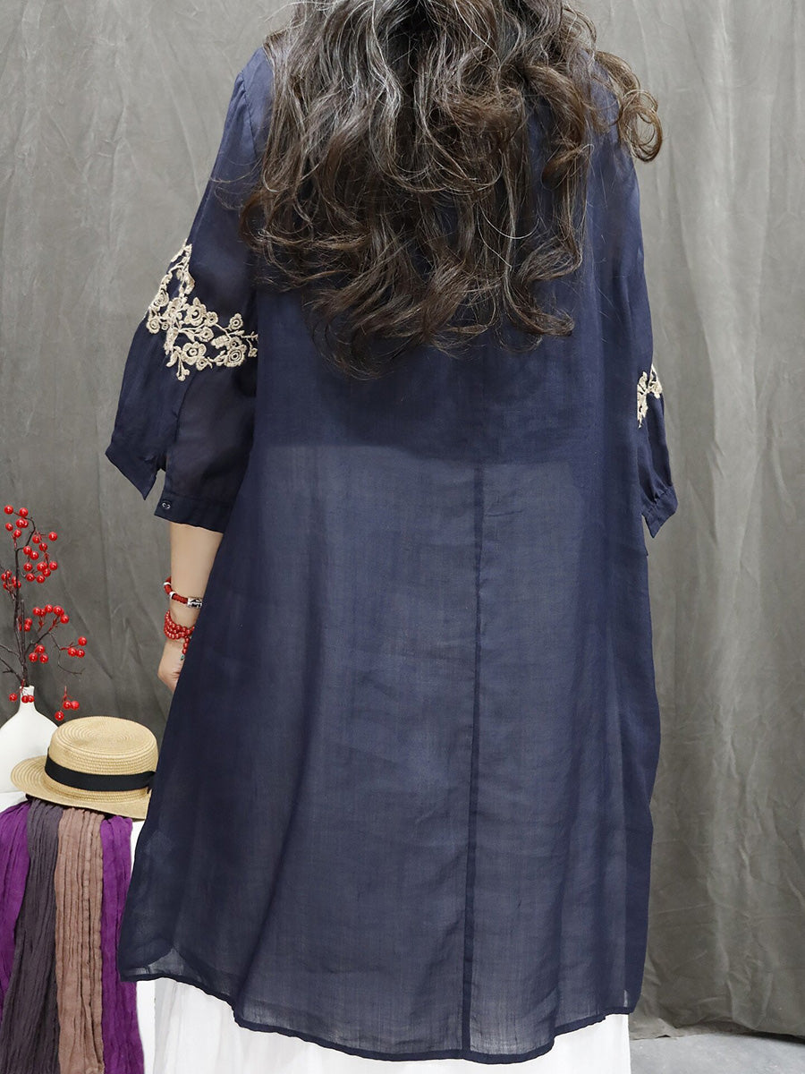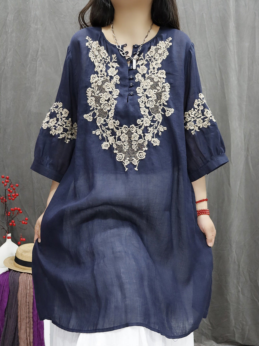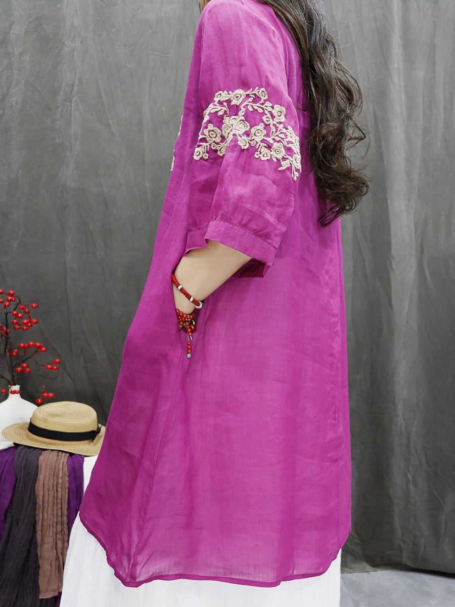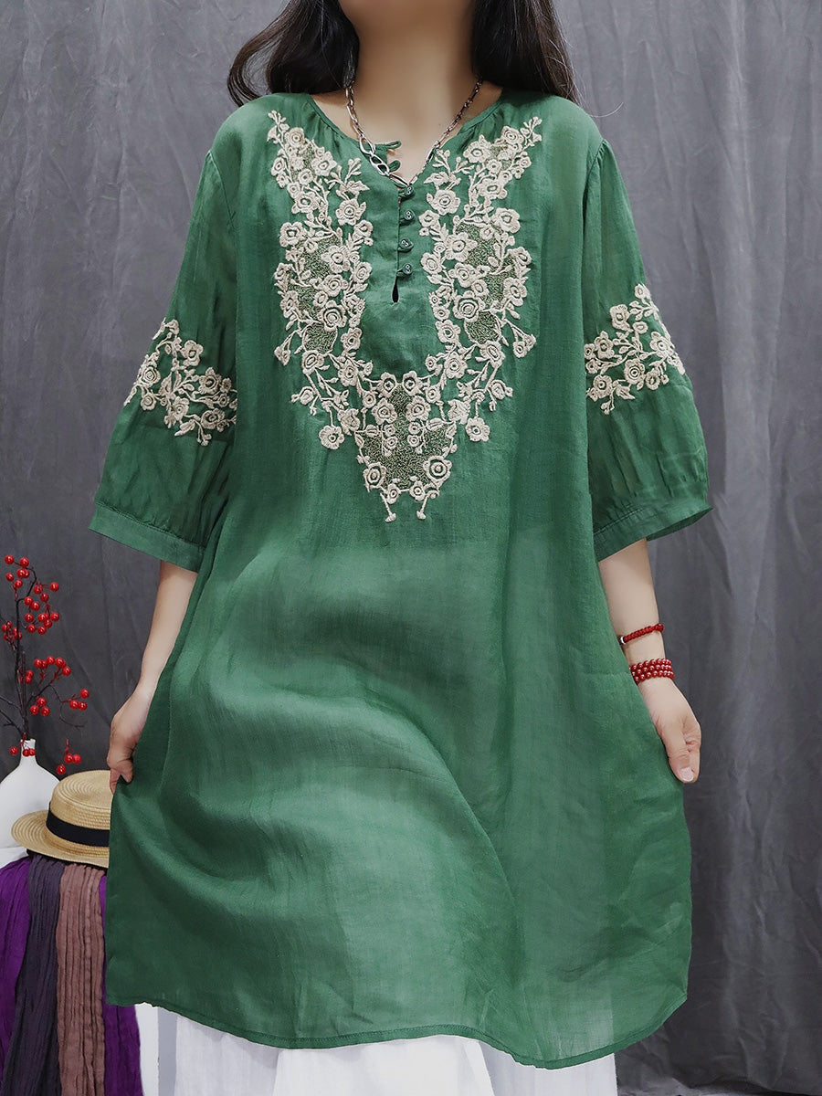 قميص نسائي ربيعي مطرز بالزهور الفنية، مصنوع من قماش الرامي بنسبة 100%، بياقة على شكل حرف V
