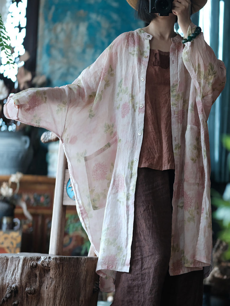 صُنع هذا القميص النسائي الصيفي الطويل الرقيق من قماش الرامي بنسبة 100% بخبرة، ويتميز بنقشة زهور جميلة وياقة كلاسيكية على شكل حرف O. بأكمام راجلان كاملة الطول ونمط عتيق، هذا القميص مثالي لموسمي الربيع والصيف.