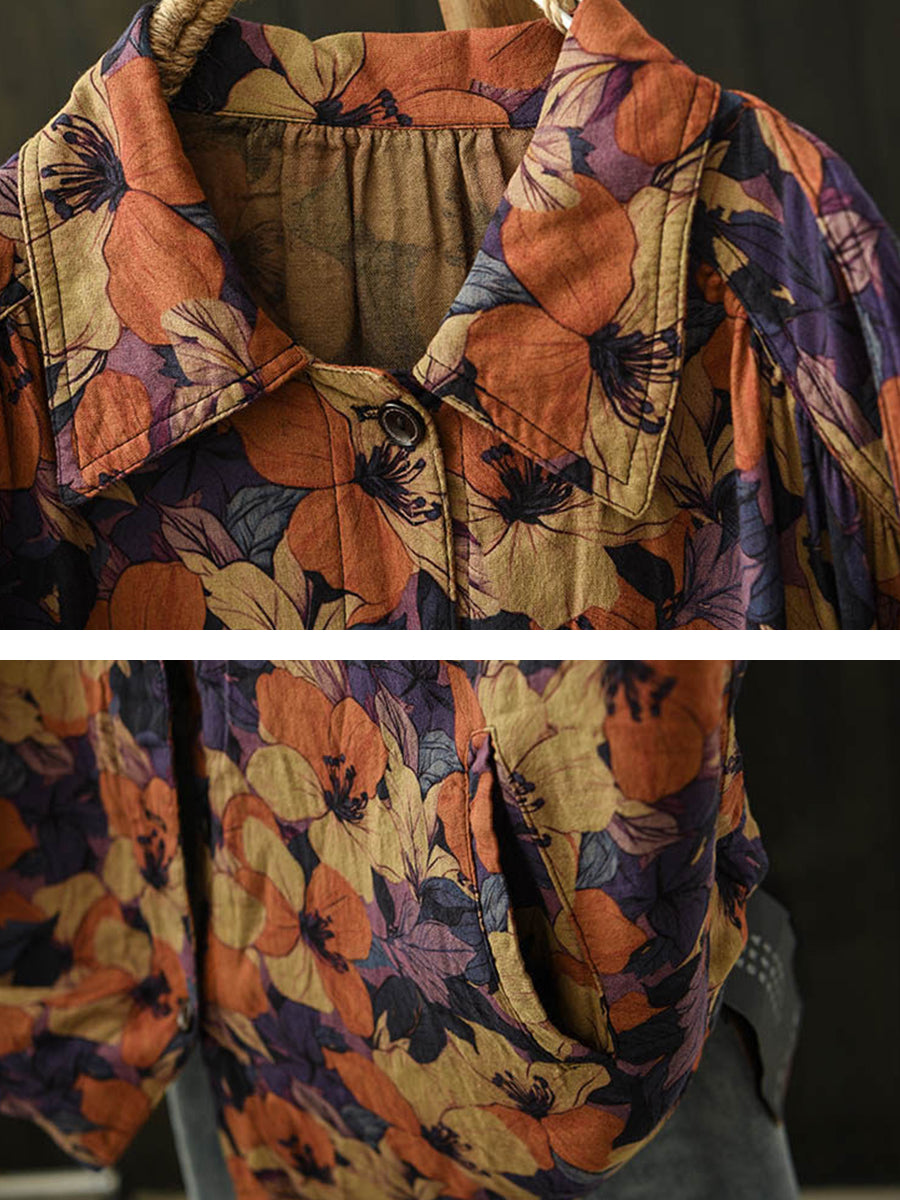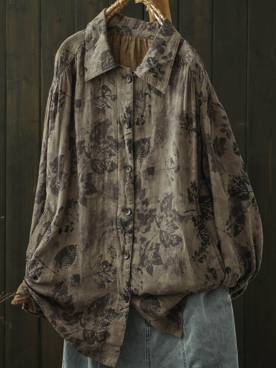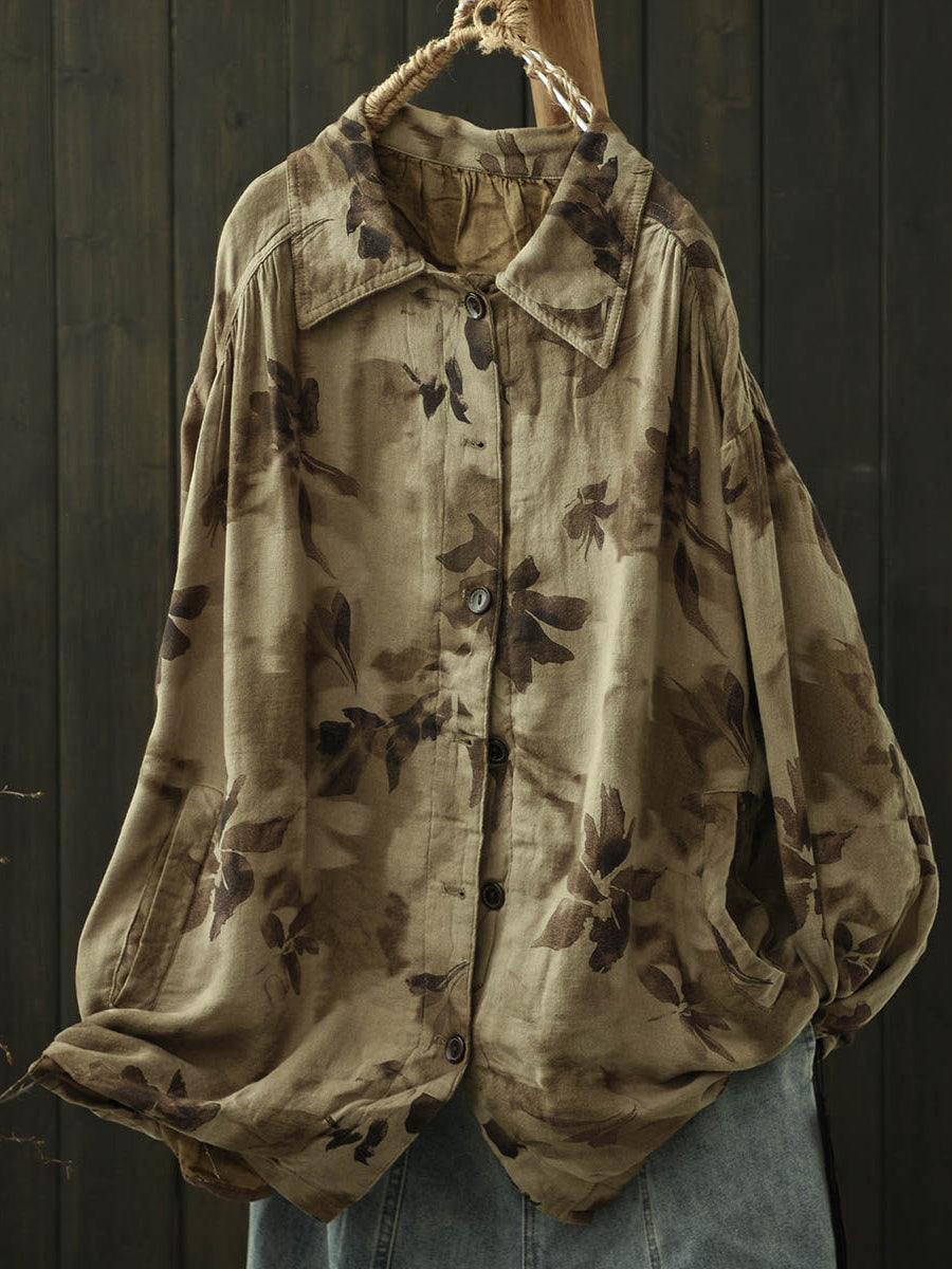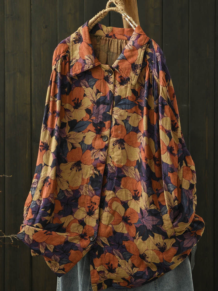 Women Autumn Artsy Flower Turn-down Collar Cotton Shirt
