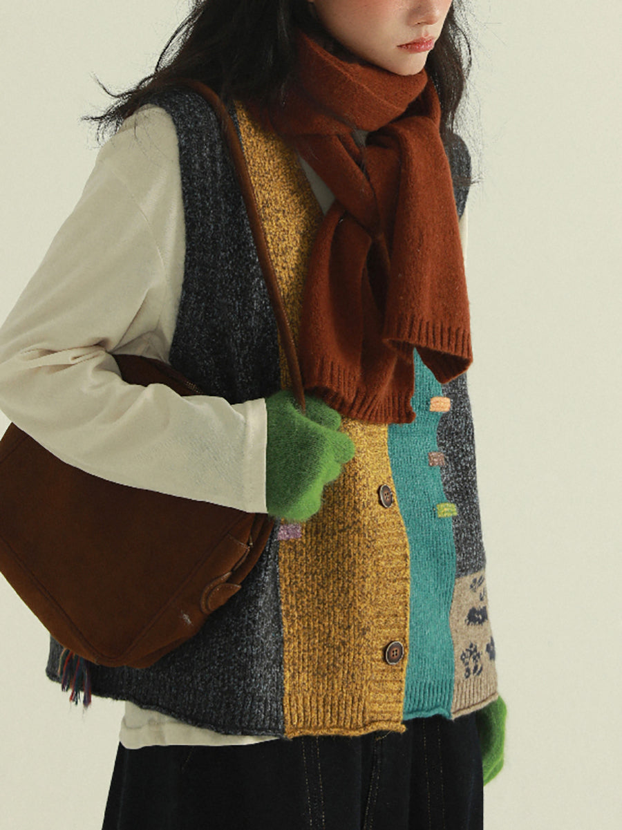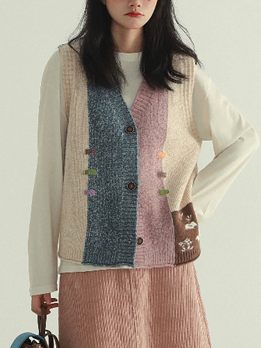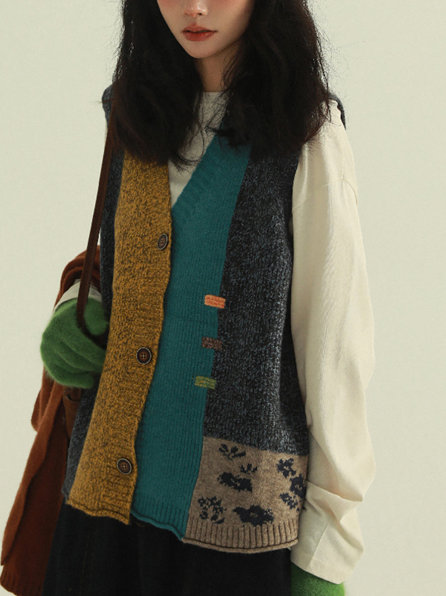 Women Autumn Artsy Patchwork V-Neck Knitted Vest