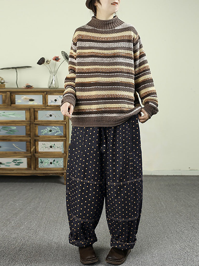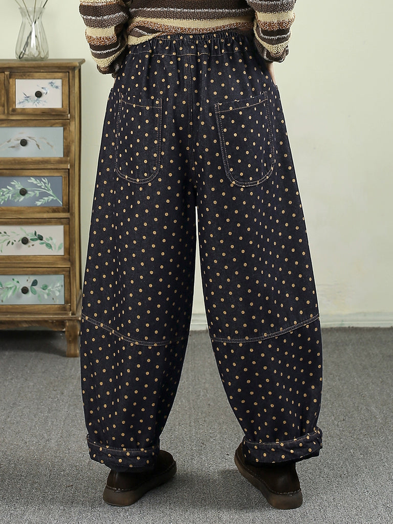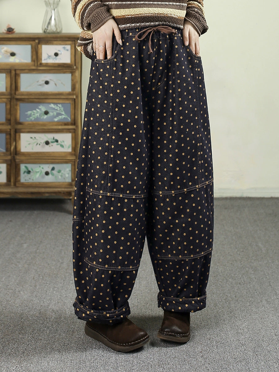 Women Winter Retro Dot Denim Fleece-lined Harem Pants