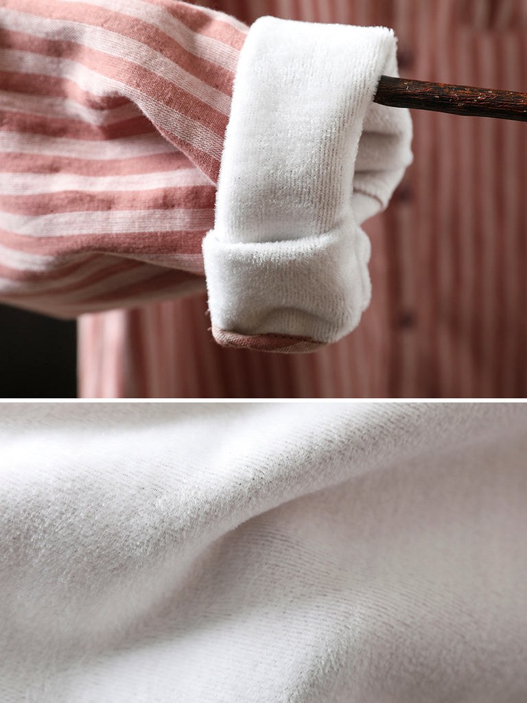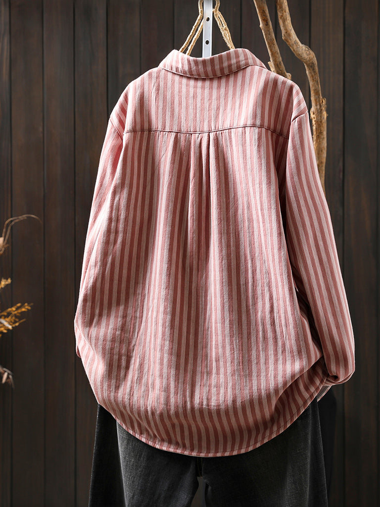 Women Winter Stripe Turn-down Collar 100%Cotton Blouse