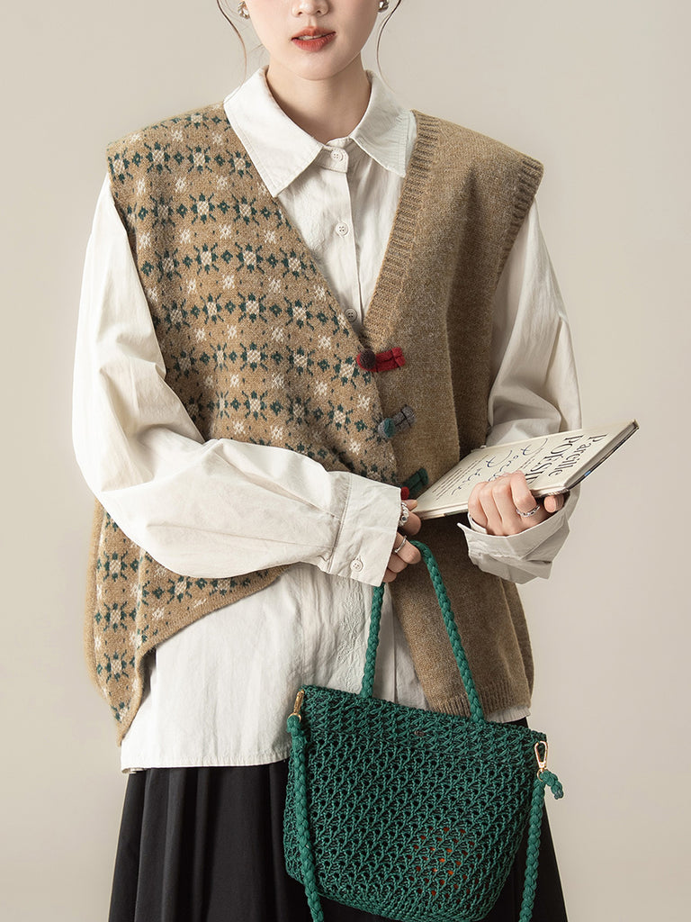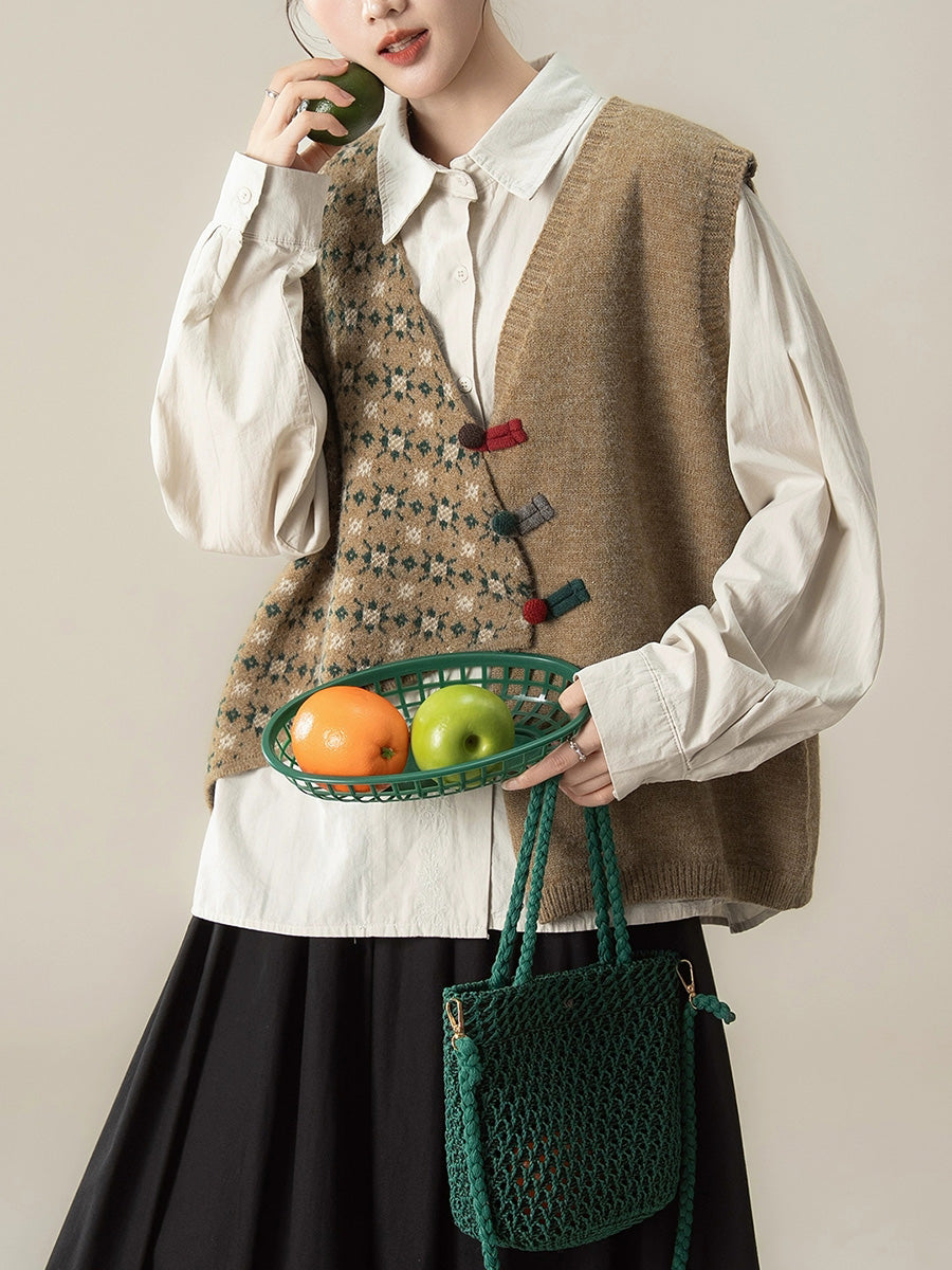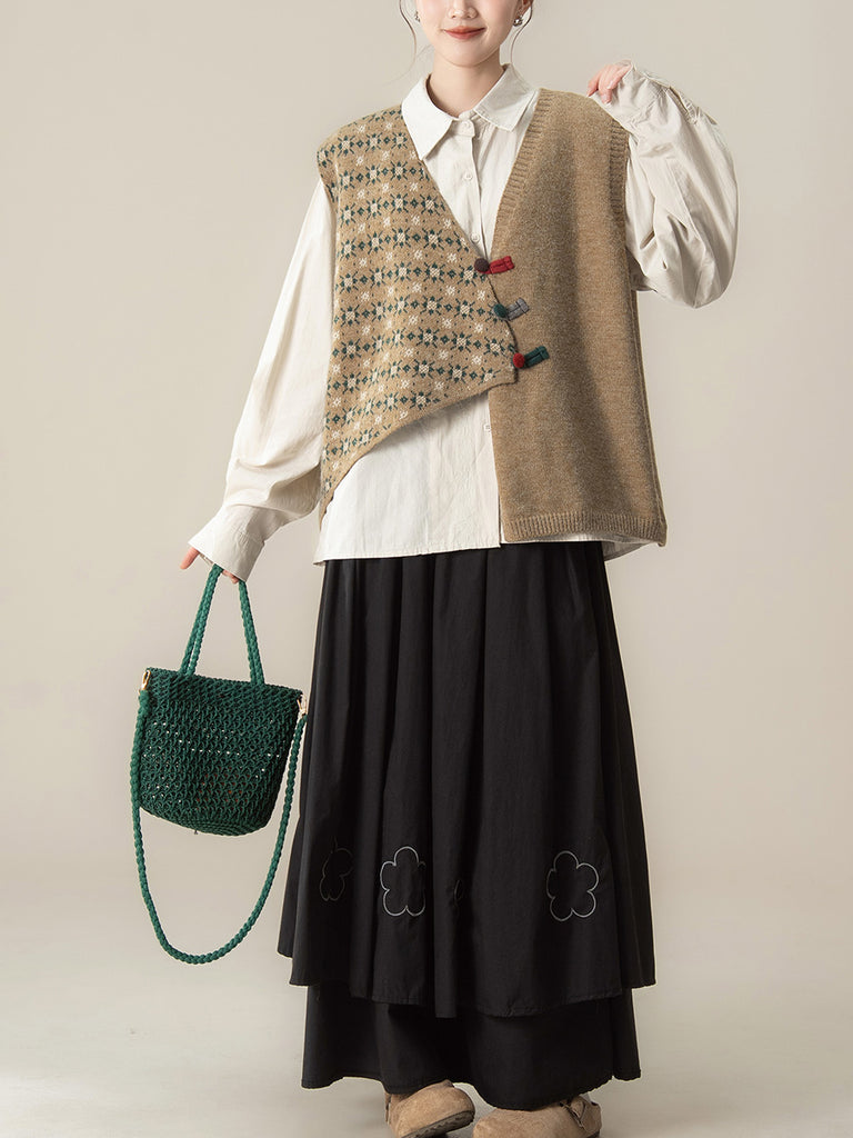 This versatile knitted vest combines timeless retro aesthetics with contemporary design sensibilities. Featuring a distinctive flower collar and clean solid colorway, it delivers sophisticated layering for transitional seasons. The irregular spliced construction at the V-neckline adds visual interest and modern edge, while the structured knit fabric ensures lasting wear. Ideal for autumn and winter wardrobes, this piece transitions ef