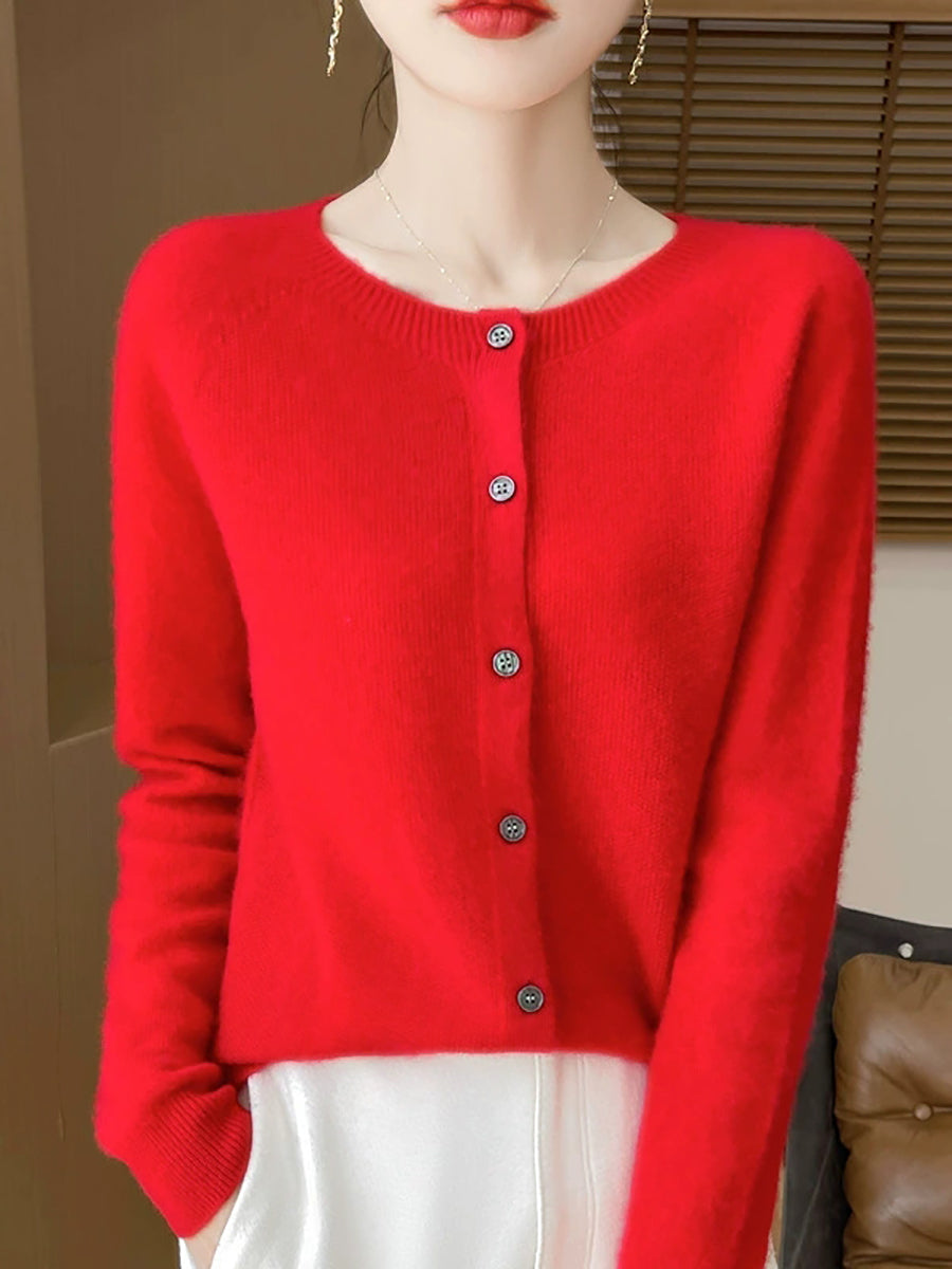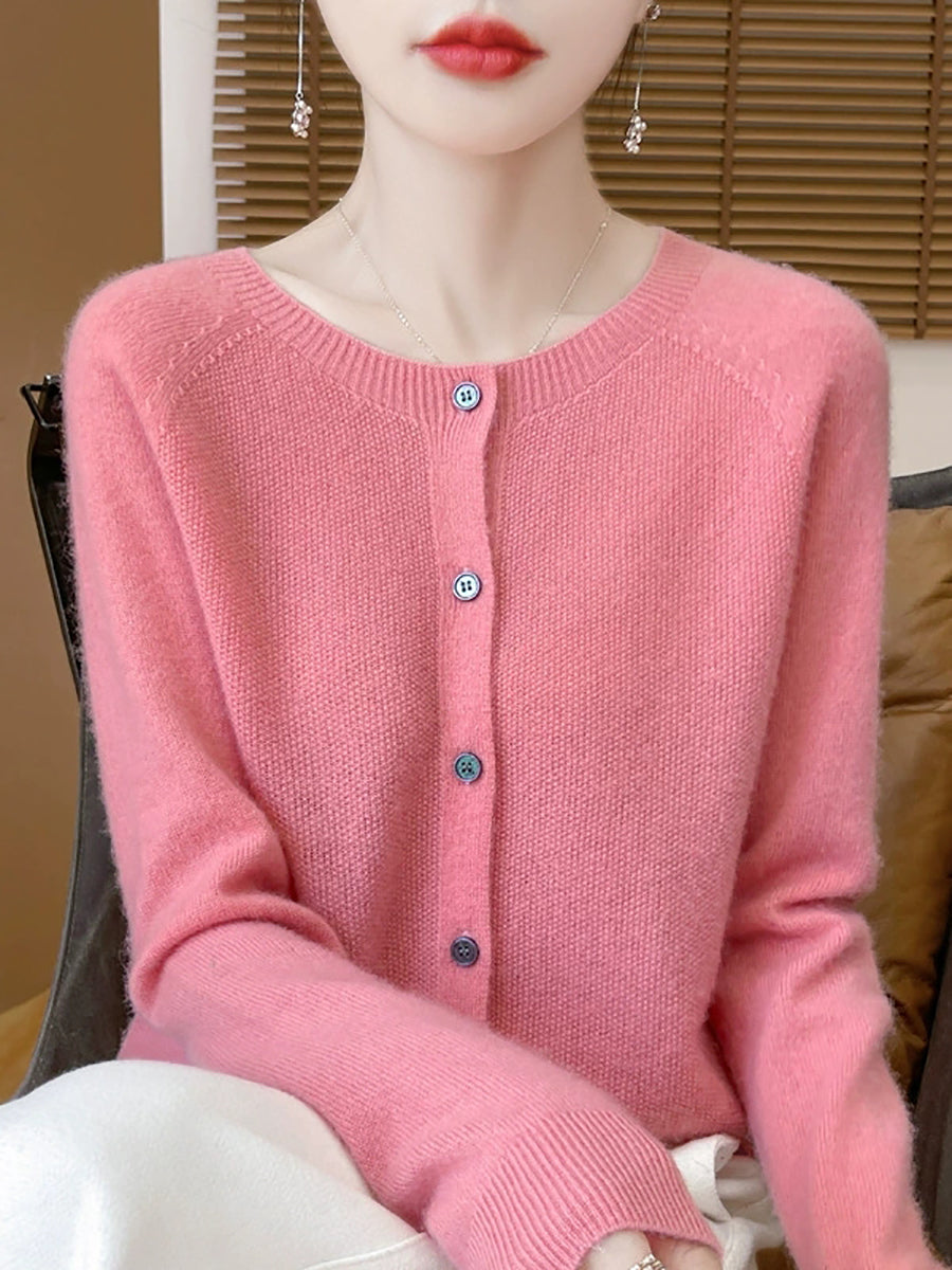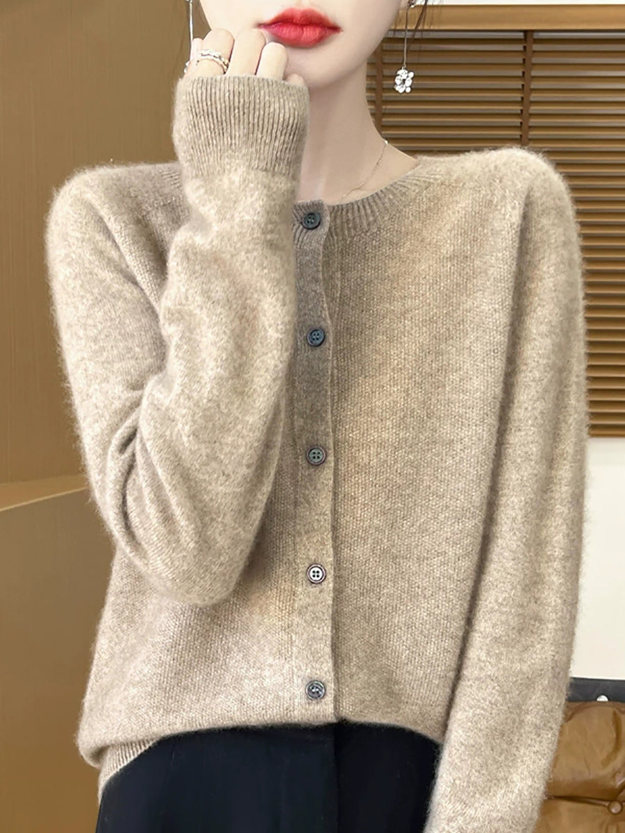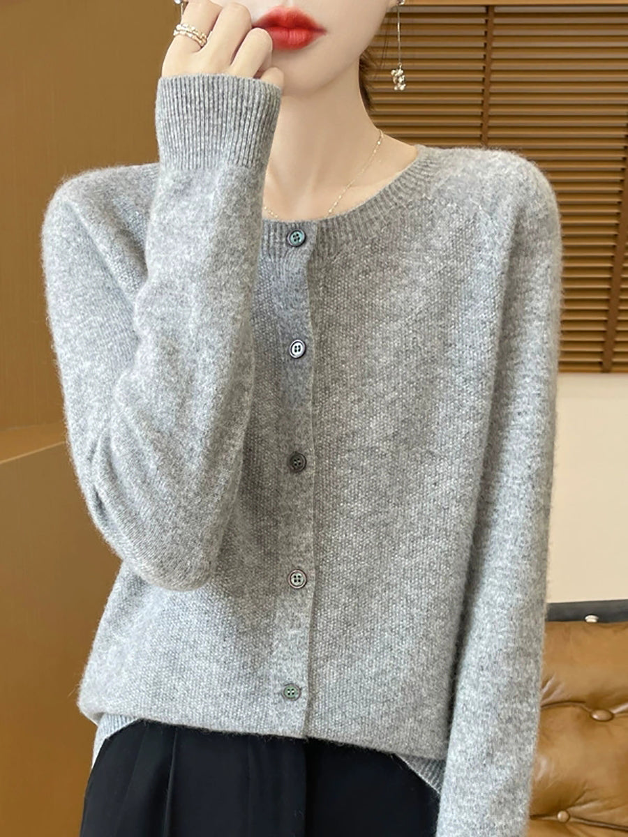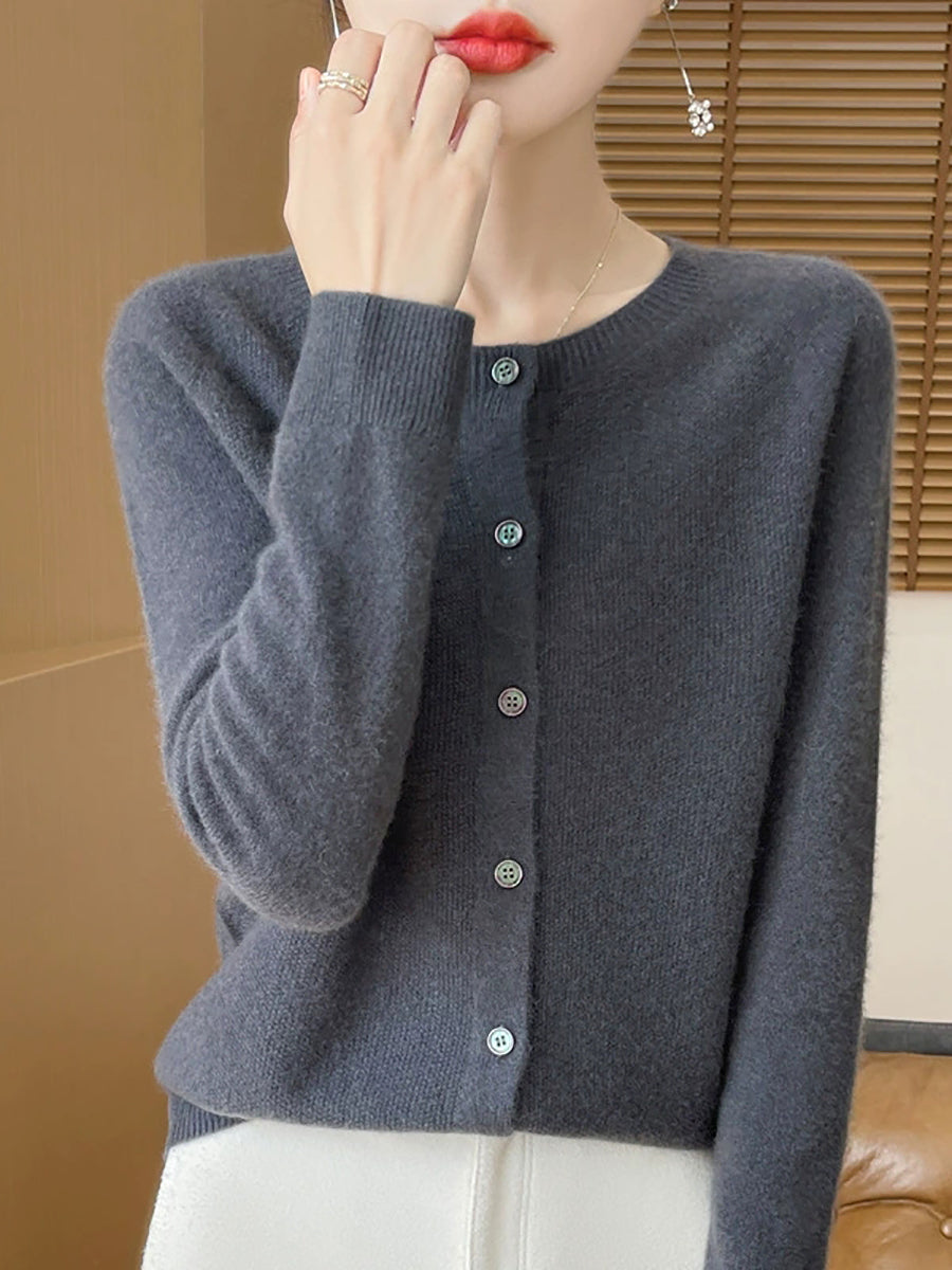 Women Autumn Artsy Pure Color O-Neck Cardigan