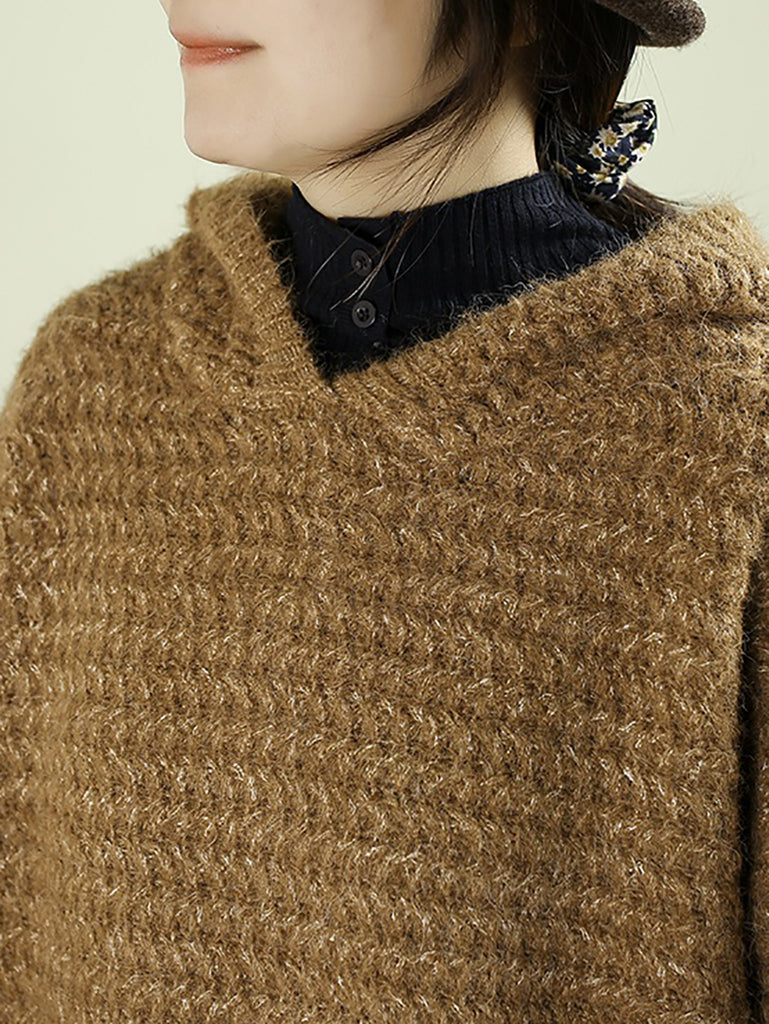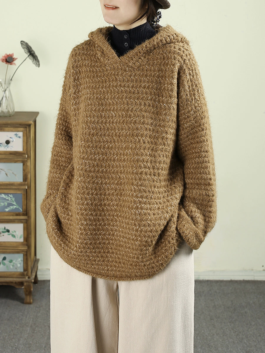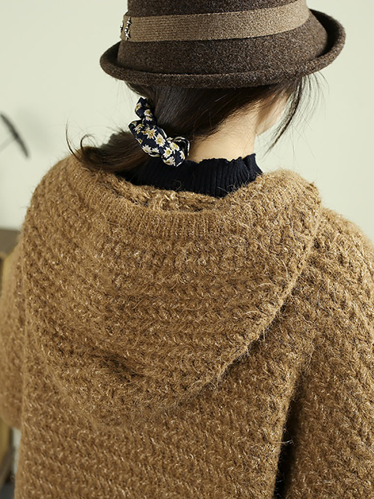 Women Winter Retro Pure Color Knitted Hooded Coat