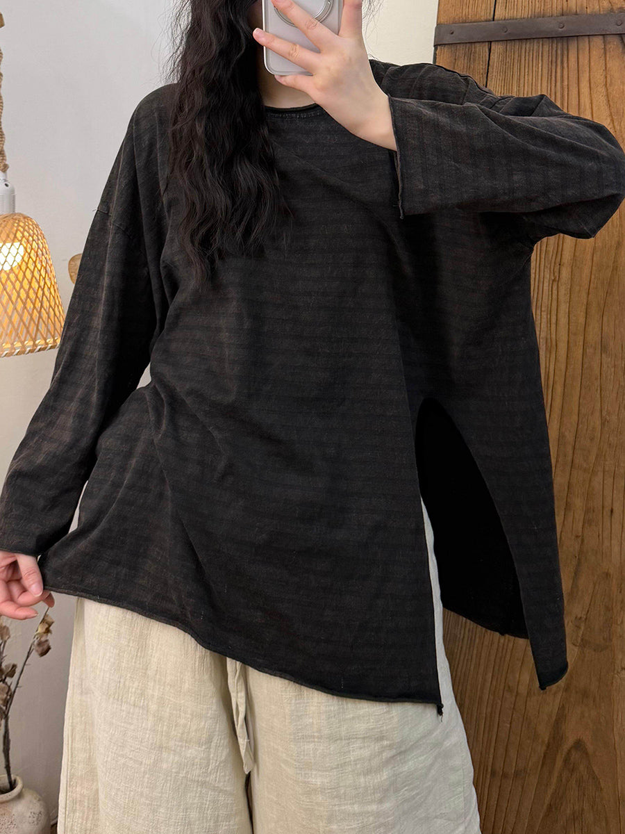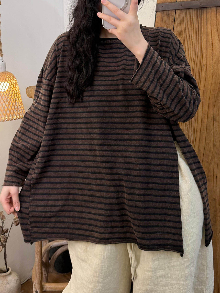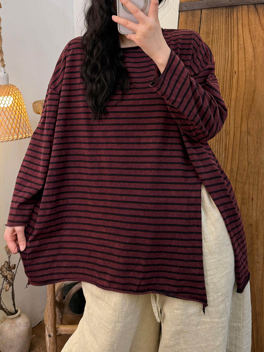 Women Retro Spring Stripe Side Split O-Neck Blouse