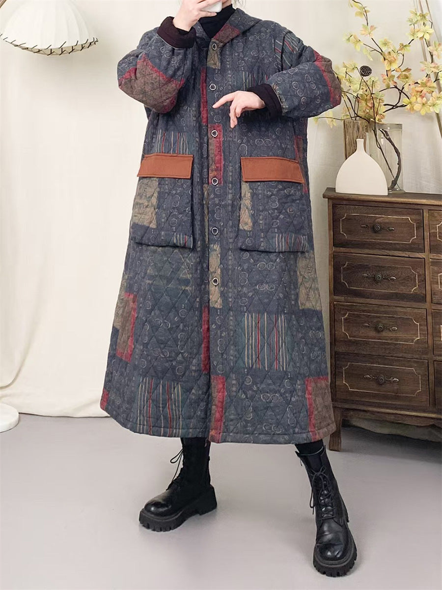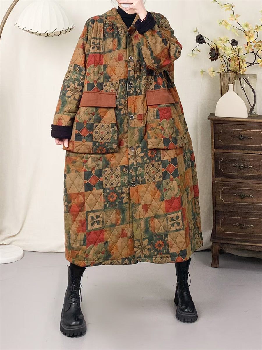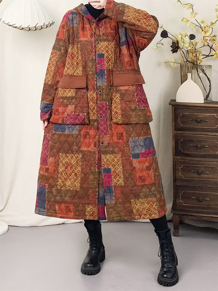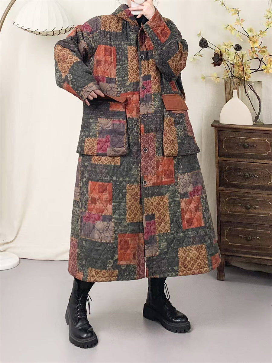 Women Winter Artsy Patchwork Padded Hooded Cotton Coat