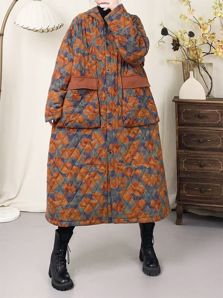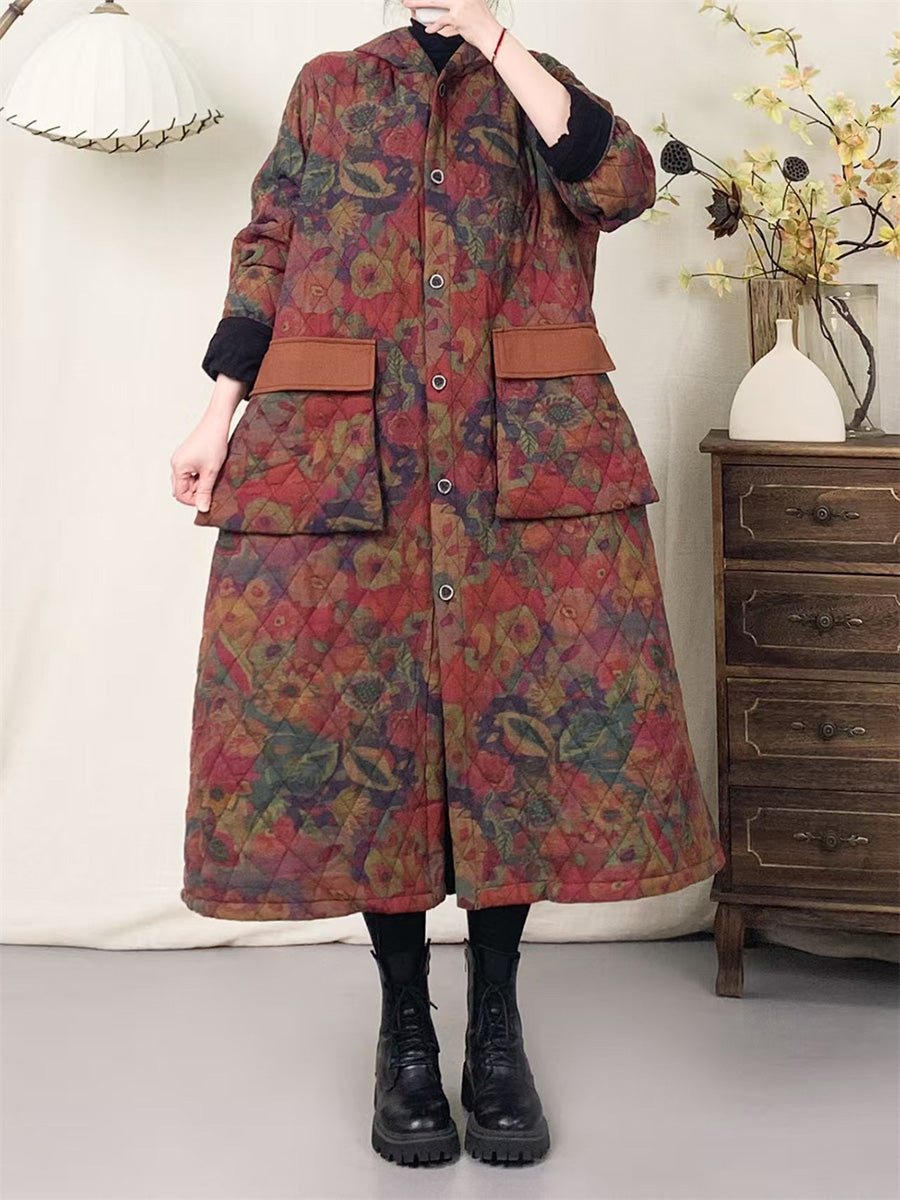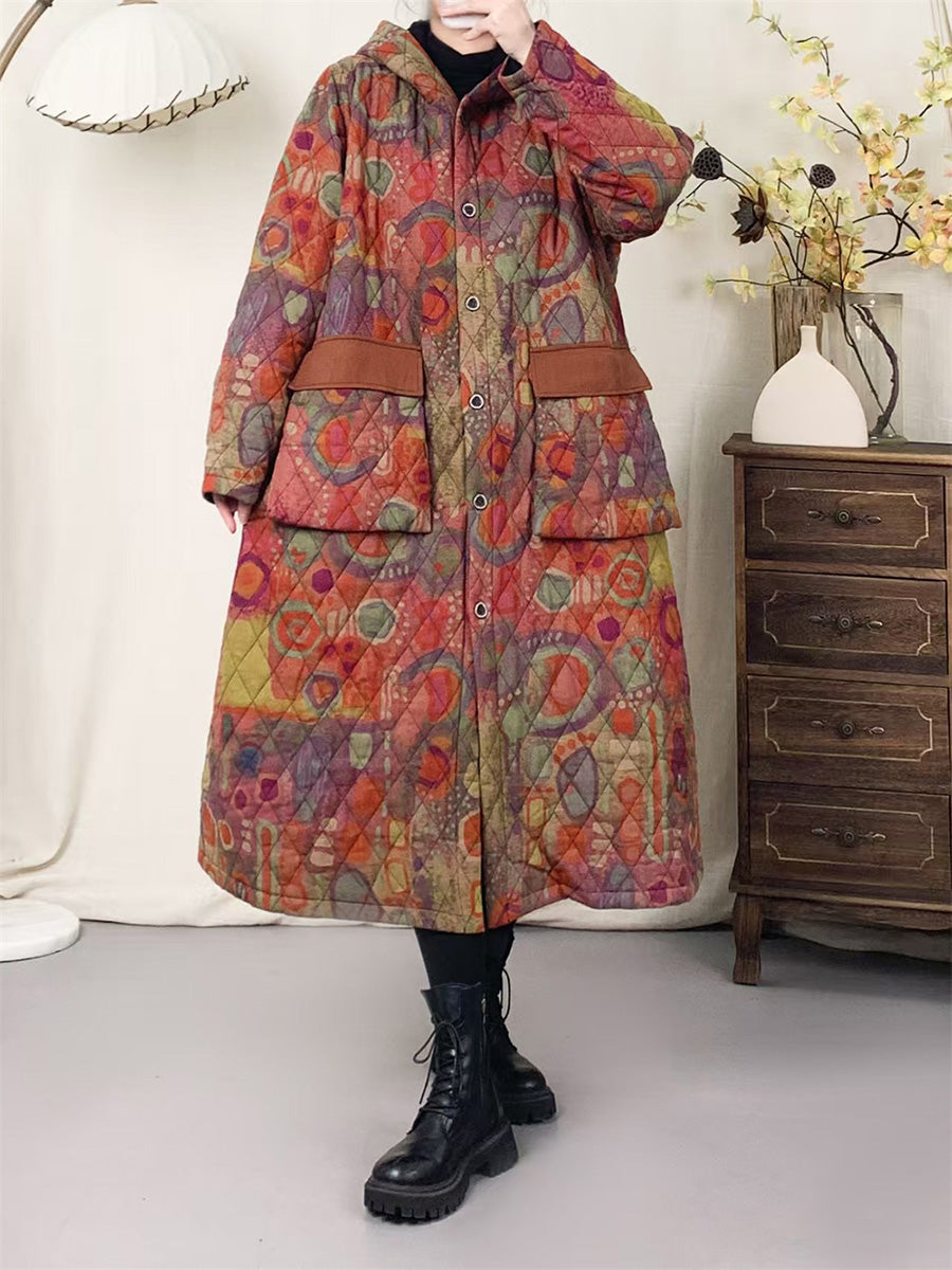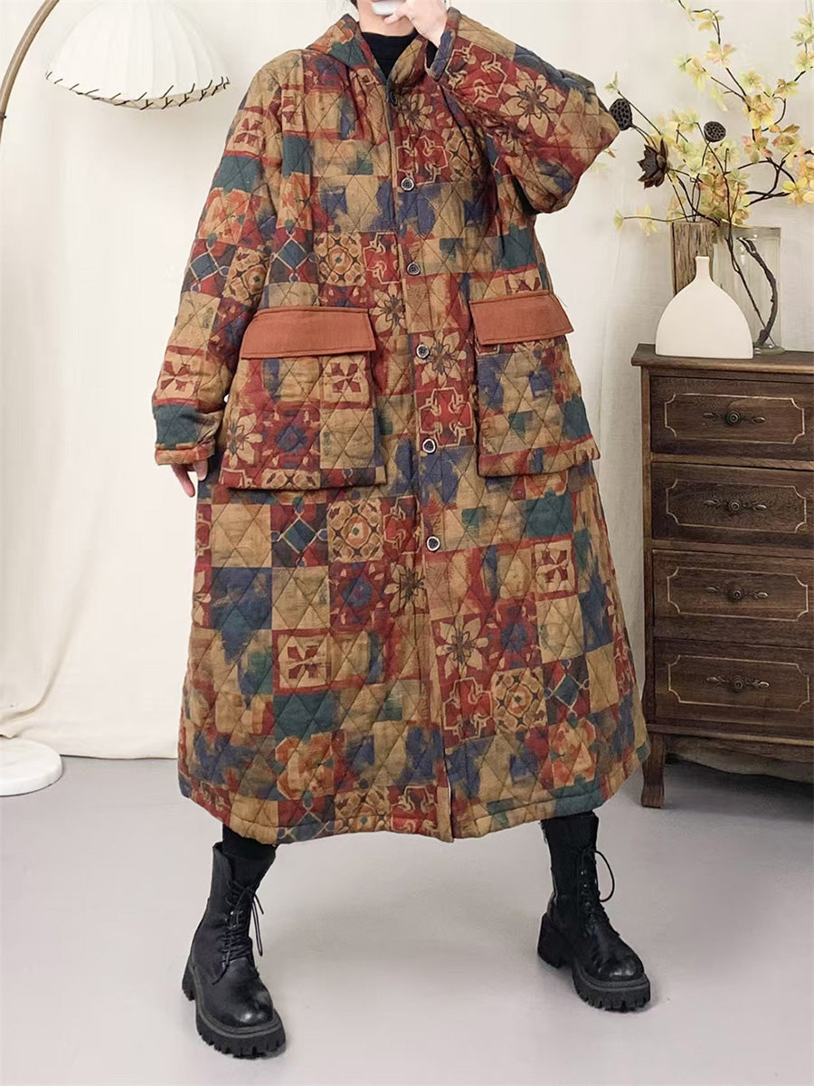 Women Winter Artsy Patchwork Padded Hooded Cotton Coat