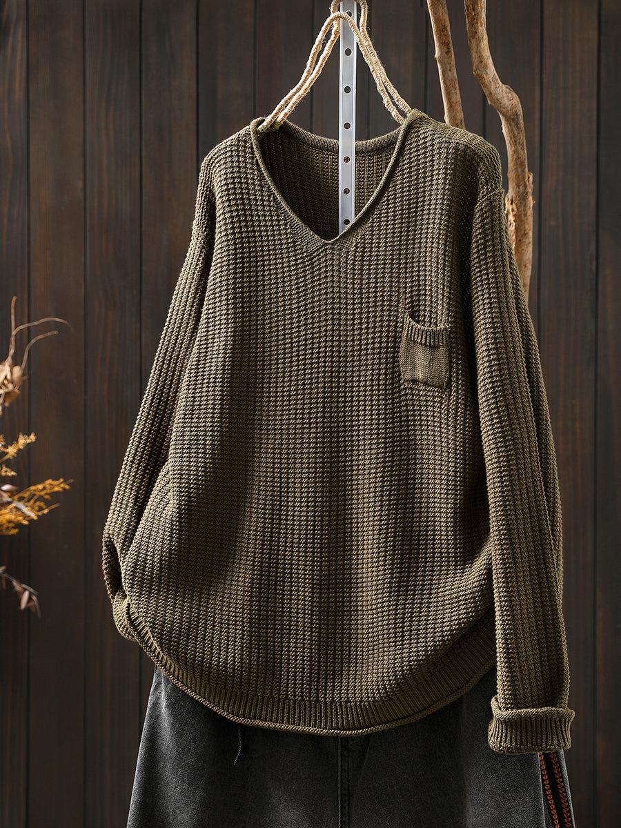 Women Autumn Artsy Pure Color Knitted V-Neck Sweater