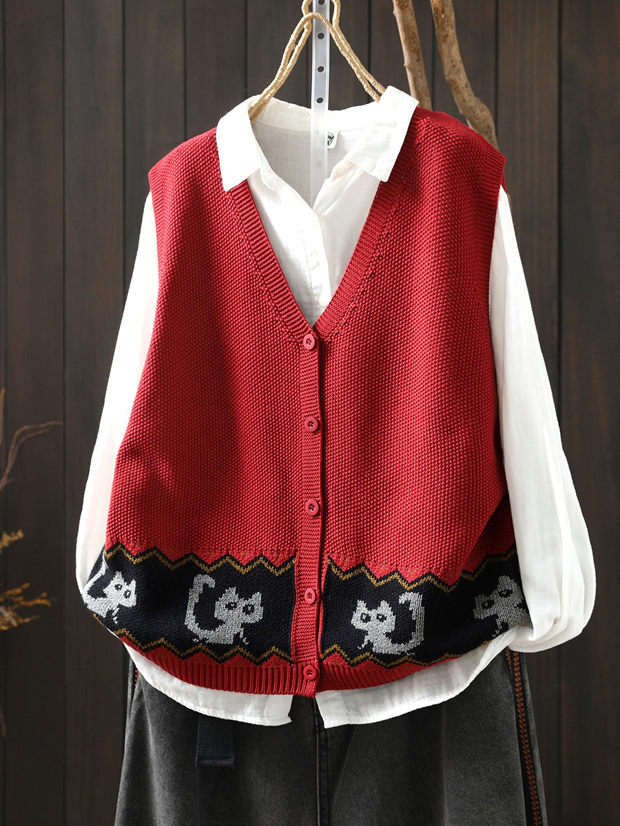 Women Spring Artsy Cat Knitted V-Neck Vest