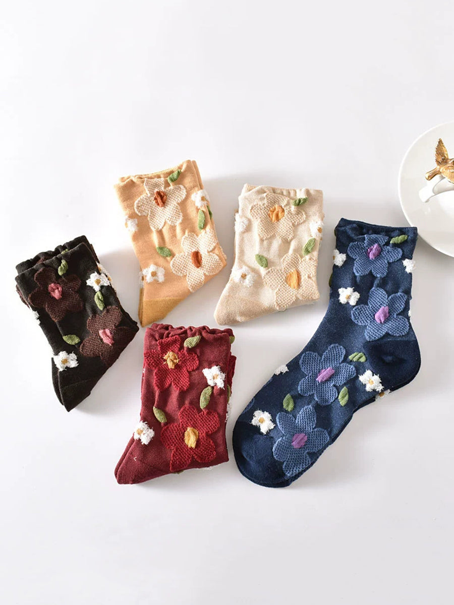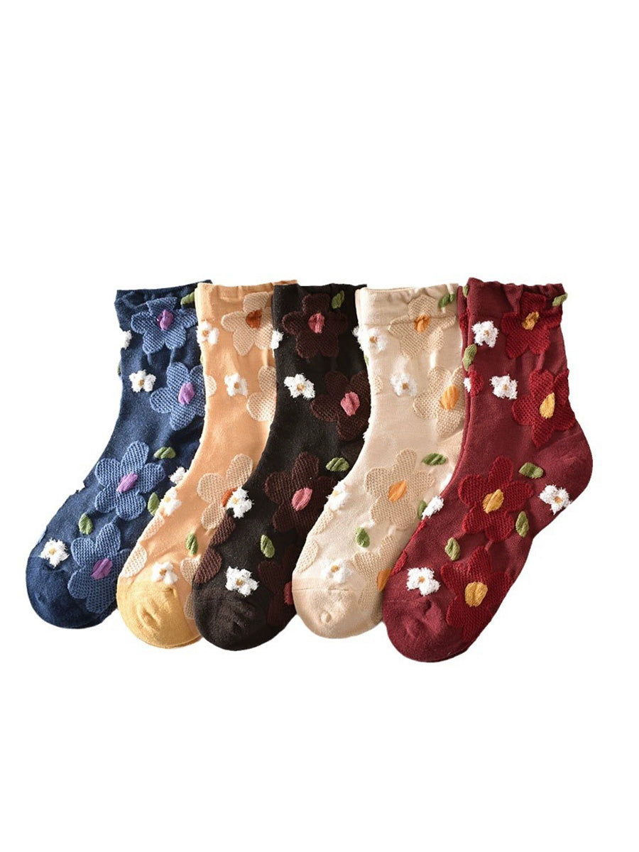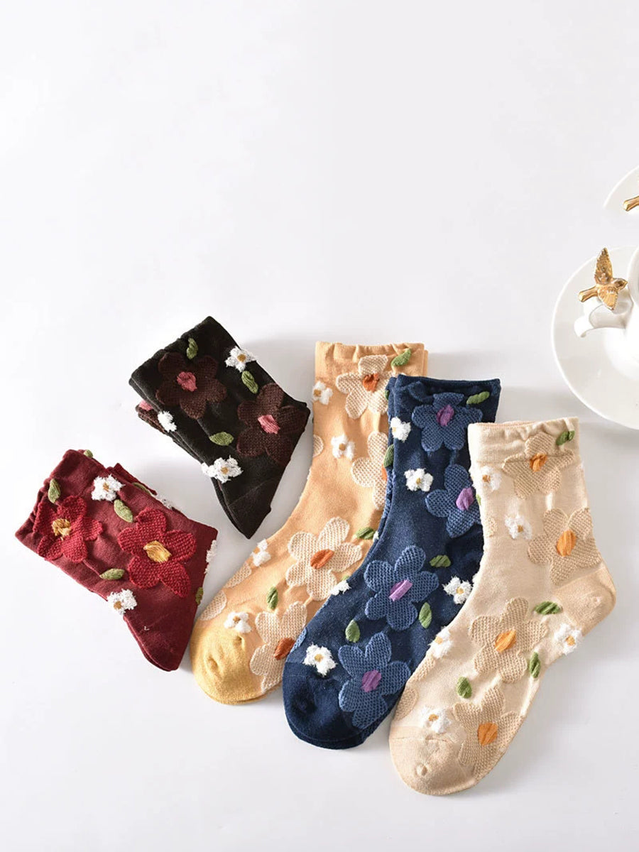 5 Pairs Women Artsy Flower Jacquard Cotton Socks