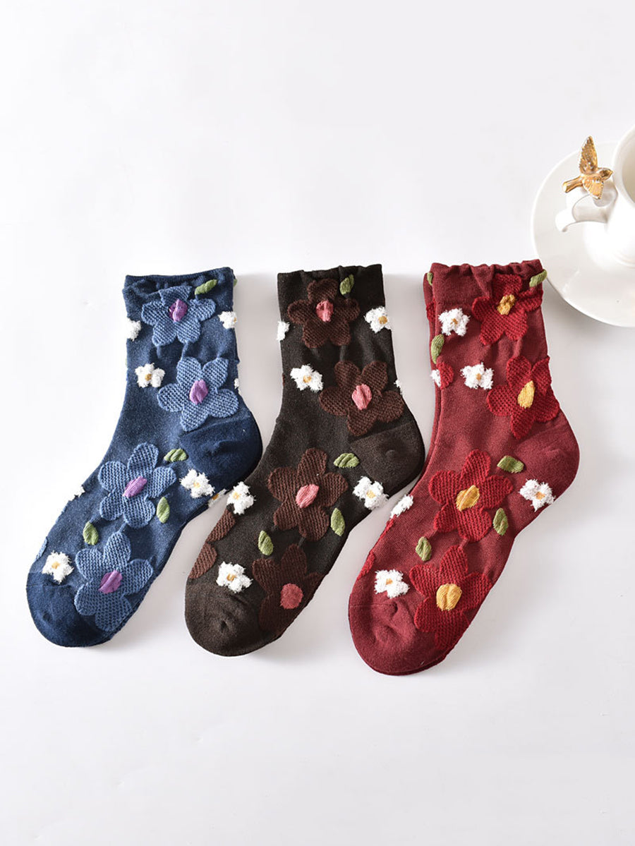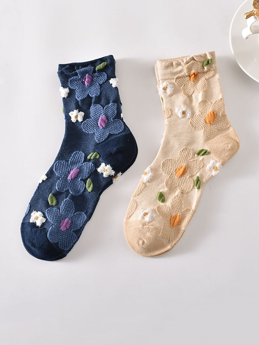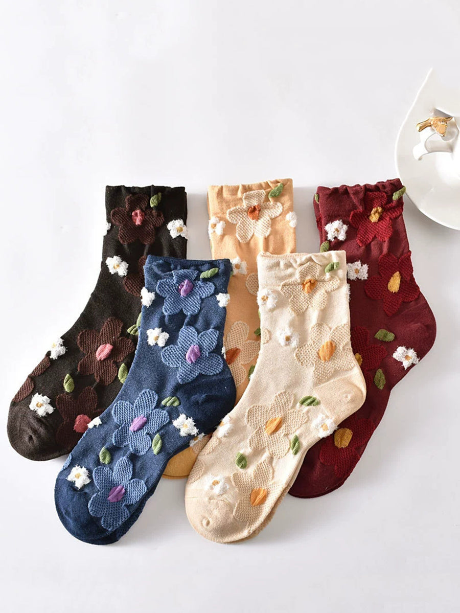 5 Pairs Women Artsy Flower Jacquard Cotton Socks
